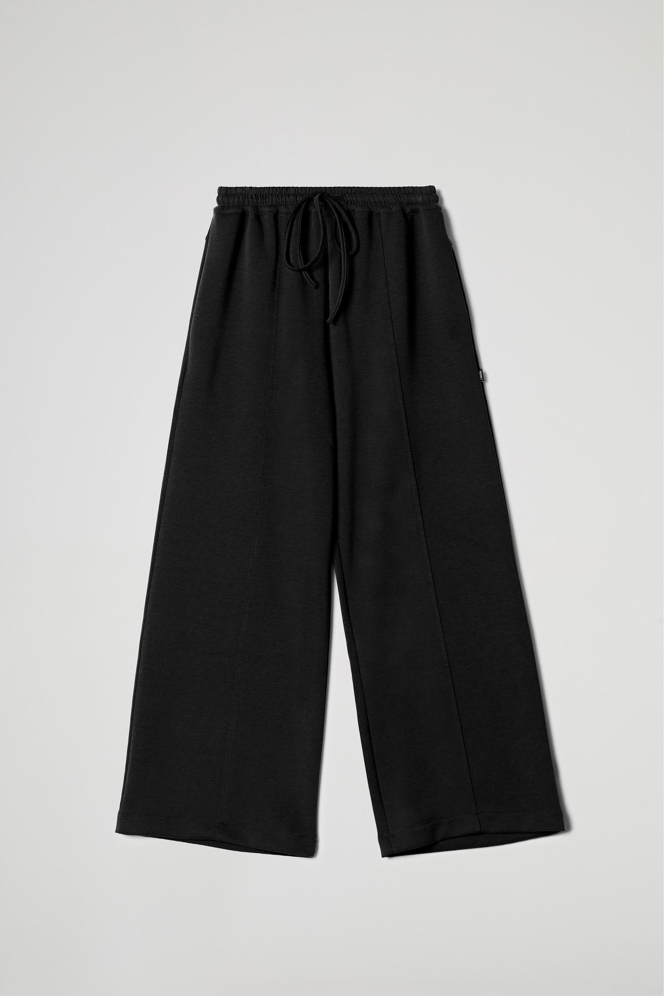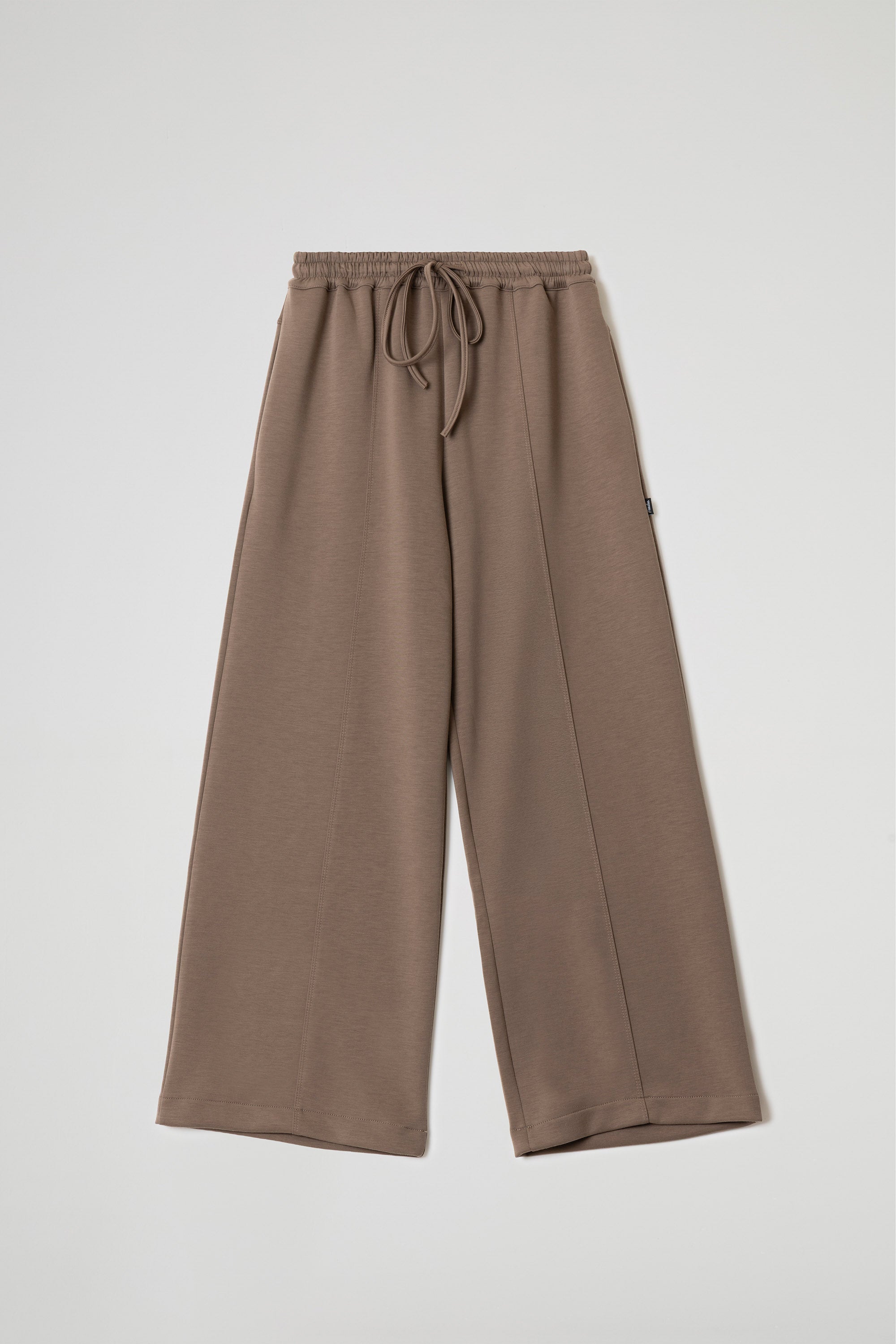 Wide-leg trousers in flowing fabric with an elastic waistband and adjustable drawstring. A minimalist, contemporary design that combines comfort and style. The wide, straight leg creates a soft, refined effect, perfect for casual chic or leisure outfits.