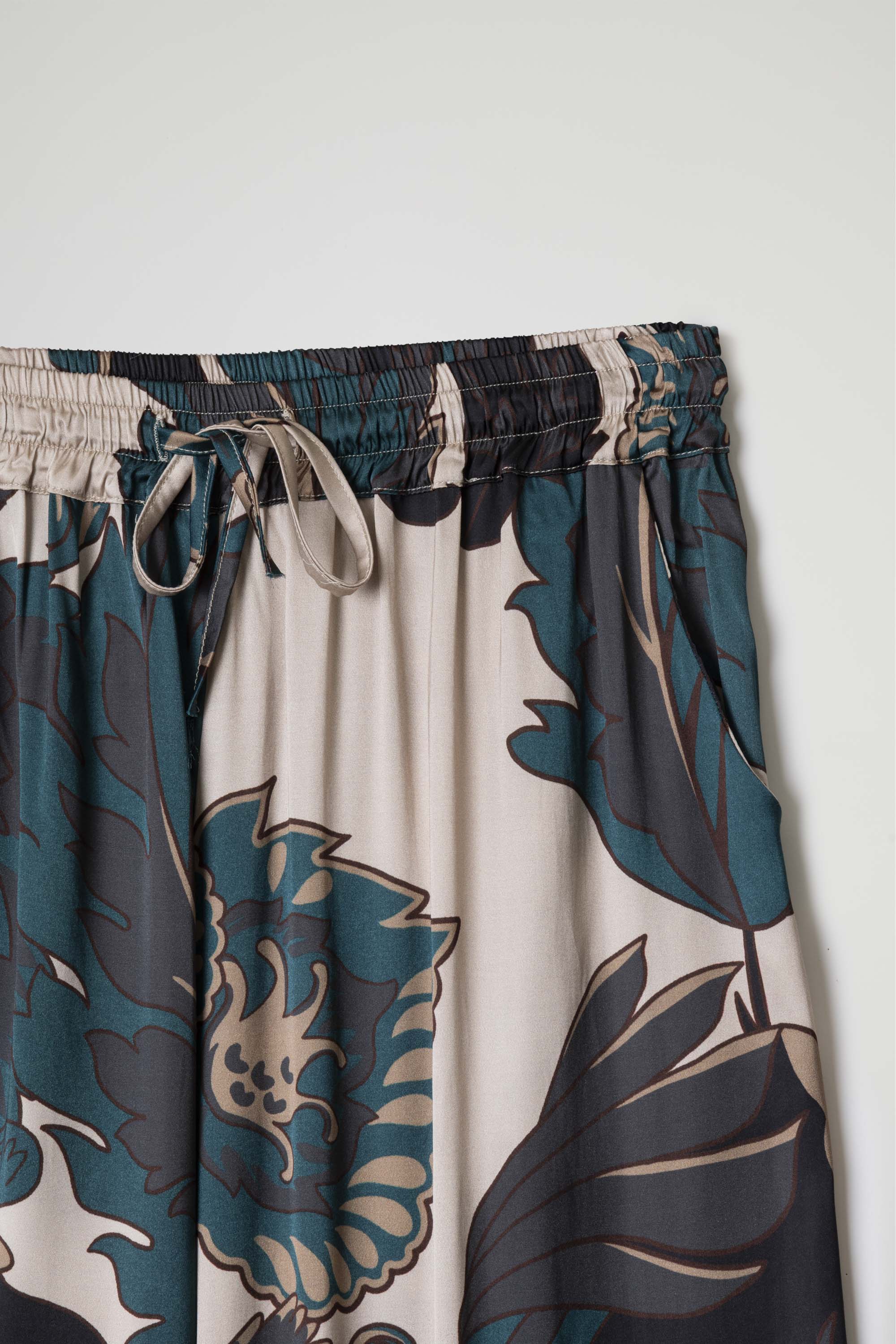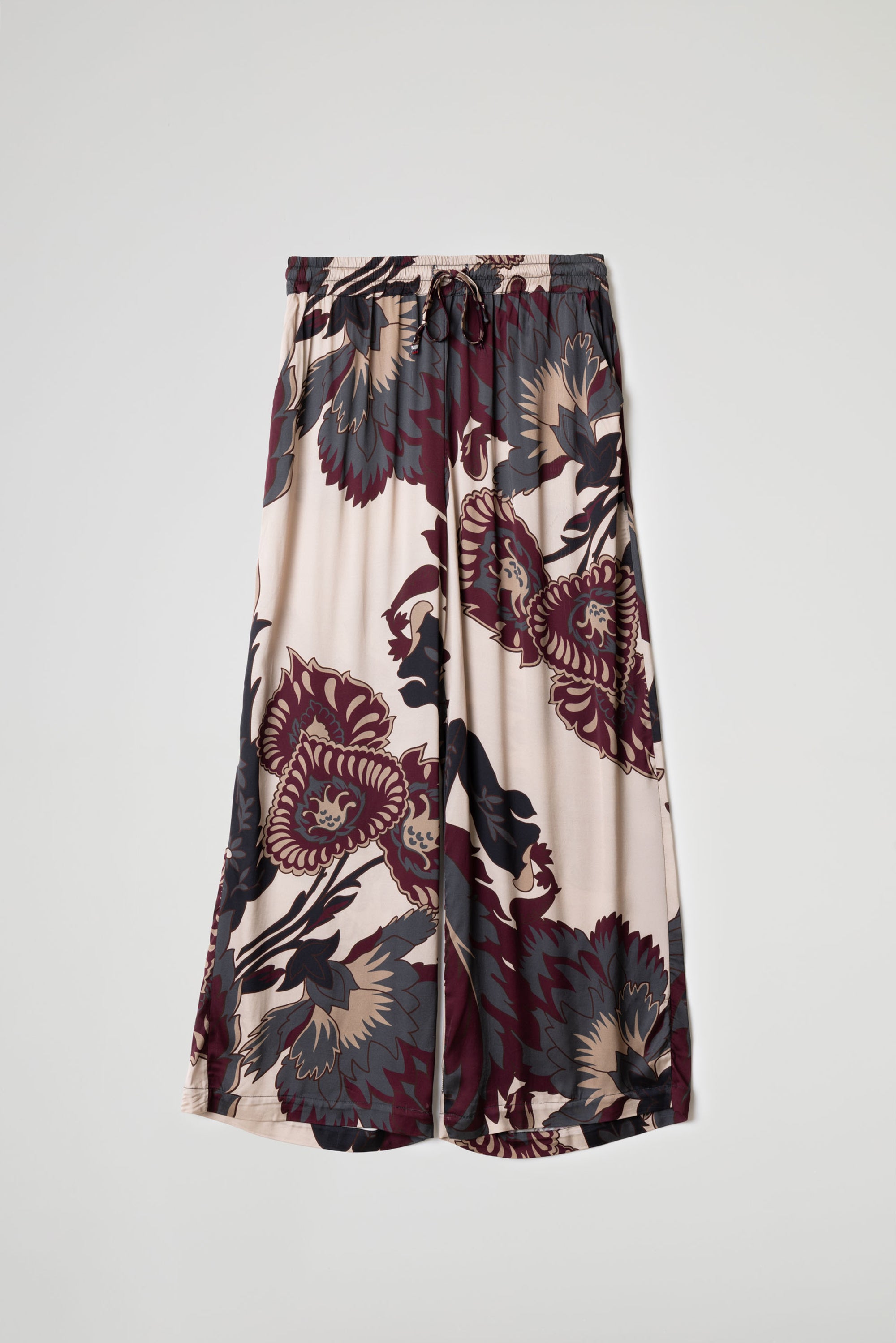 PALAZZO TROUSERS IN STRETCH VISCOSE SATIN AND ECO-WOOL, ELASTIC AND ADJUSTABLE DRAWSTRING AT THE WAIST, FRENCH POCKETS, TOPSTITCHING ON THE LEG. COMFORT FIT WITH A PYJAMA EFFECT.