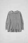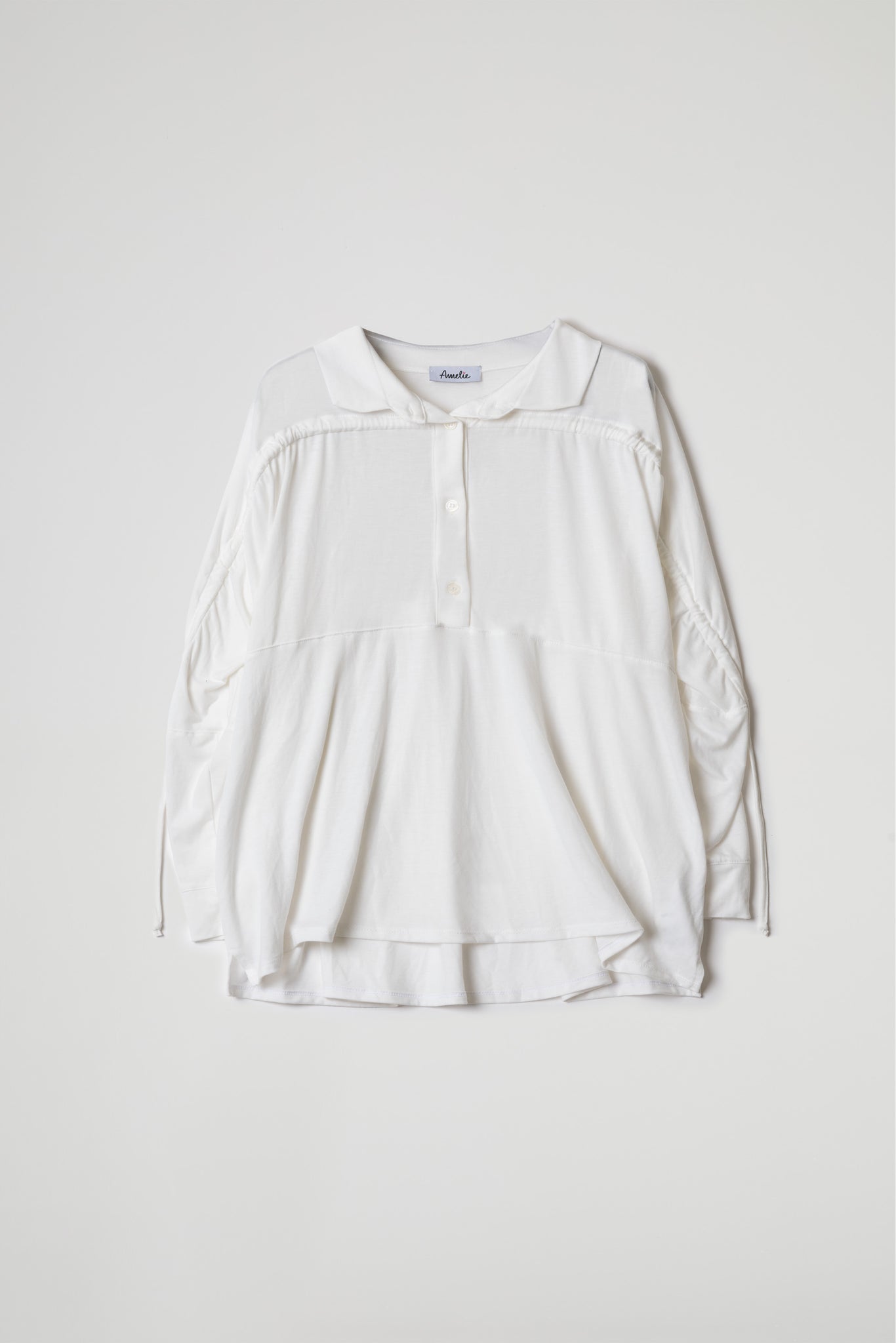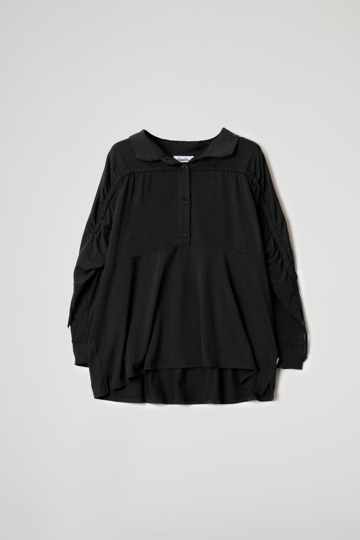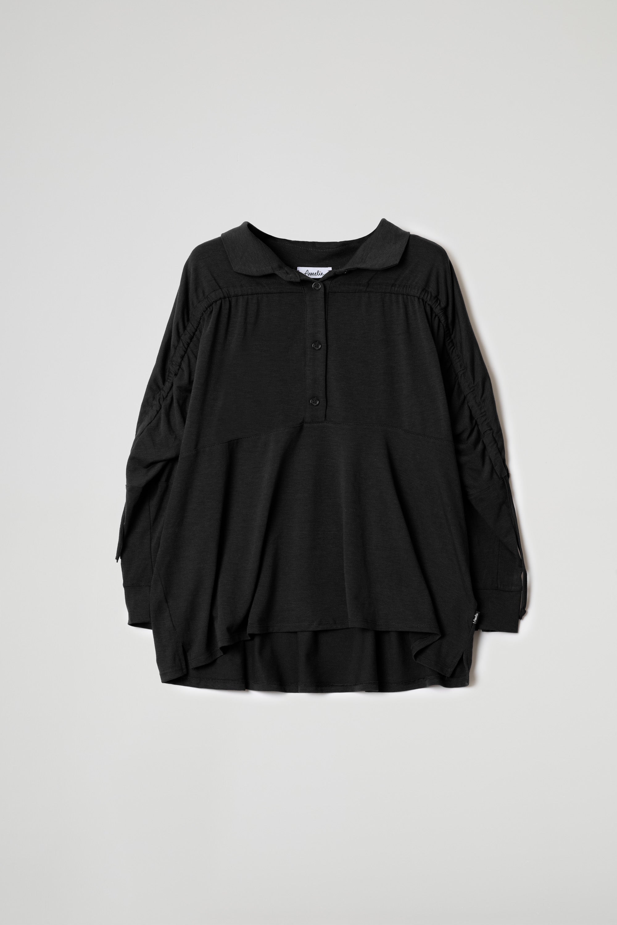 Asymmetrical sweater in soft viscose, modern collar, half-open front with buttons, long sleeves with high-felt hems, adjustable drawstring detail that starts at the neck and runs along the shoulder to the sleeve, yoke with pleat at the back. Loose and soft fit.