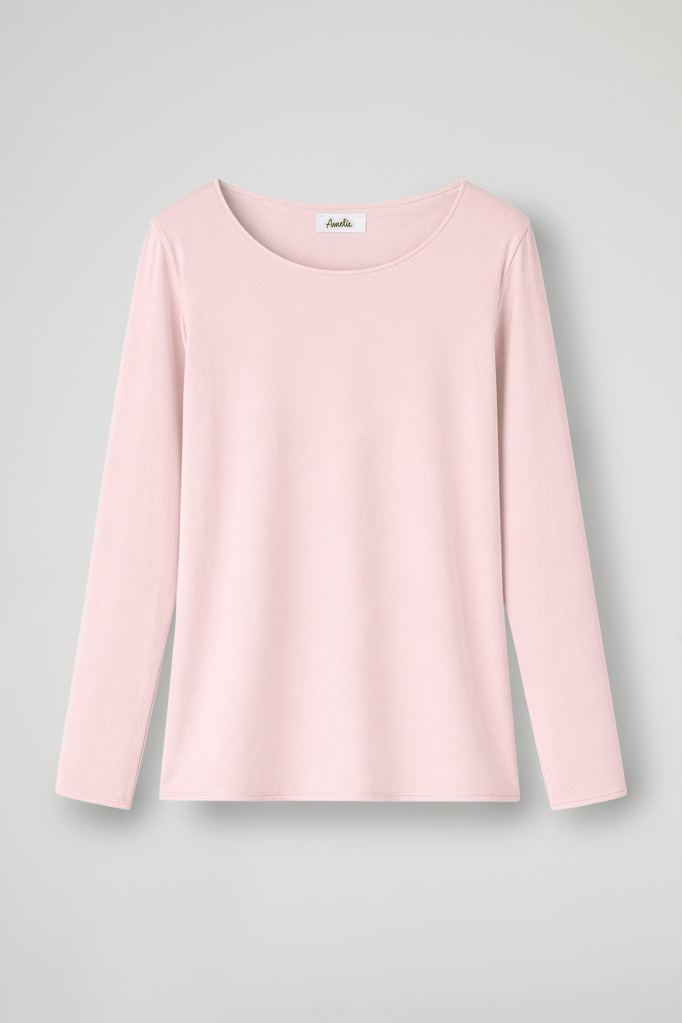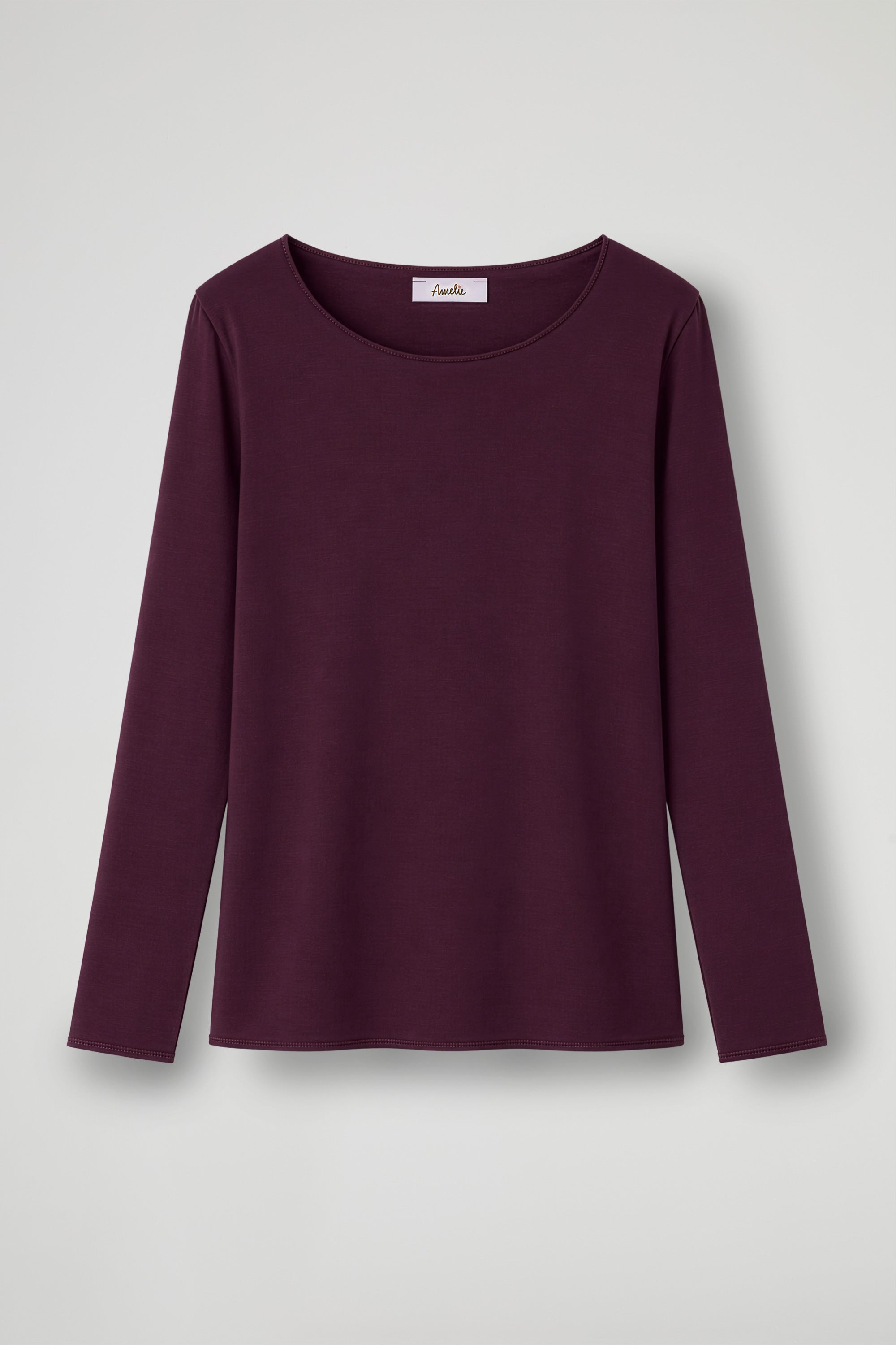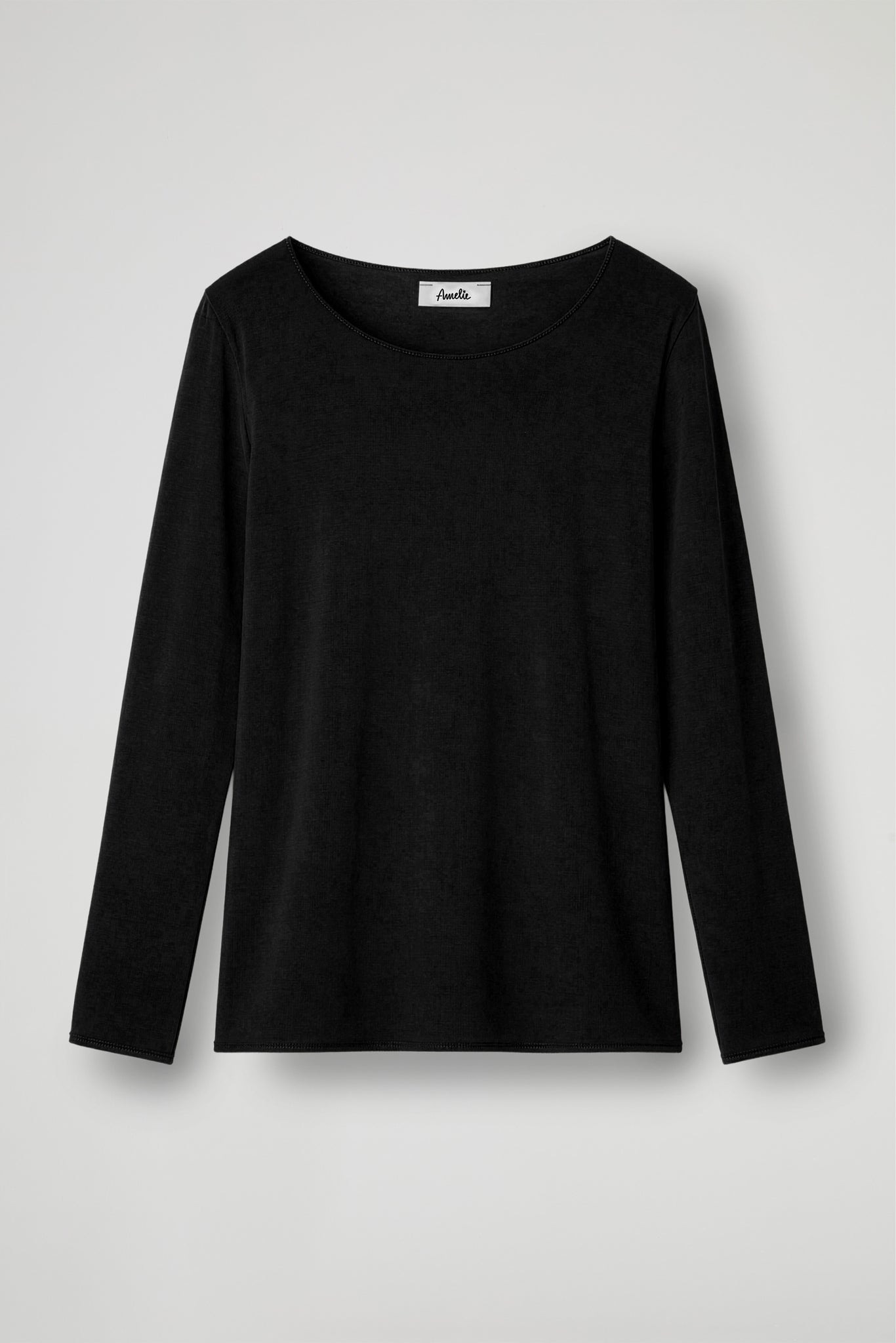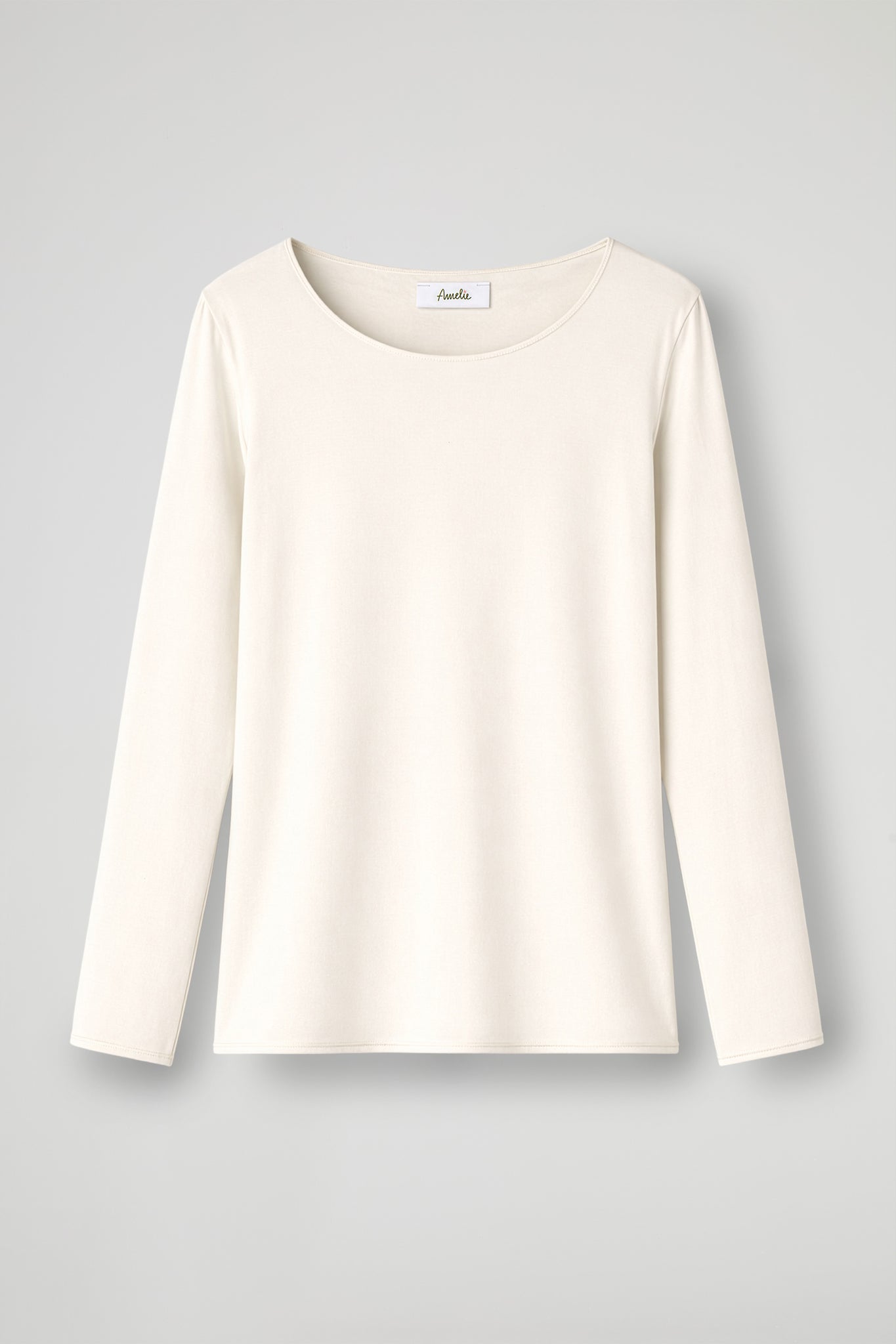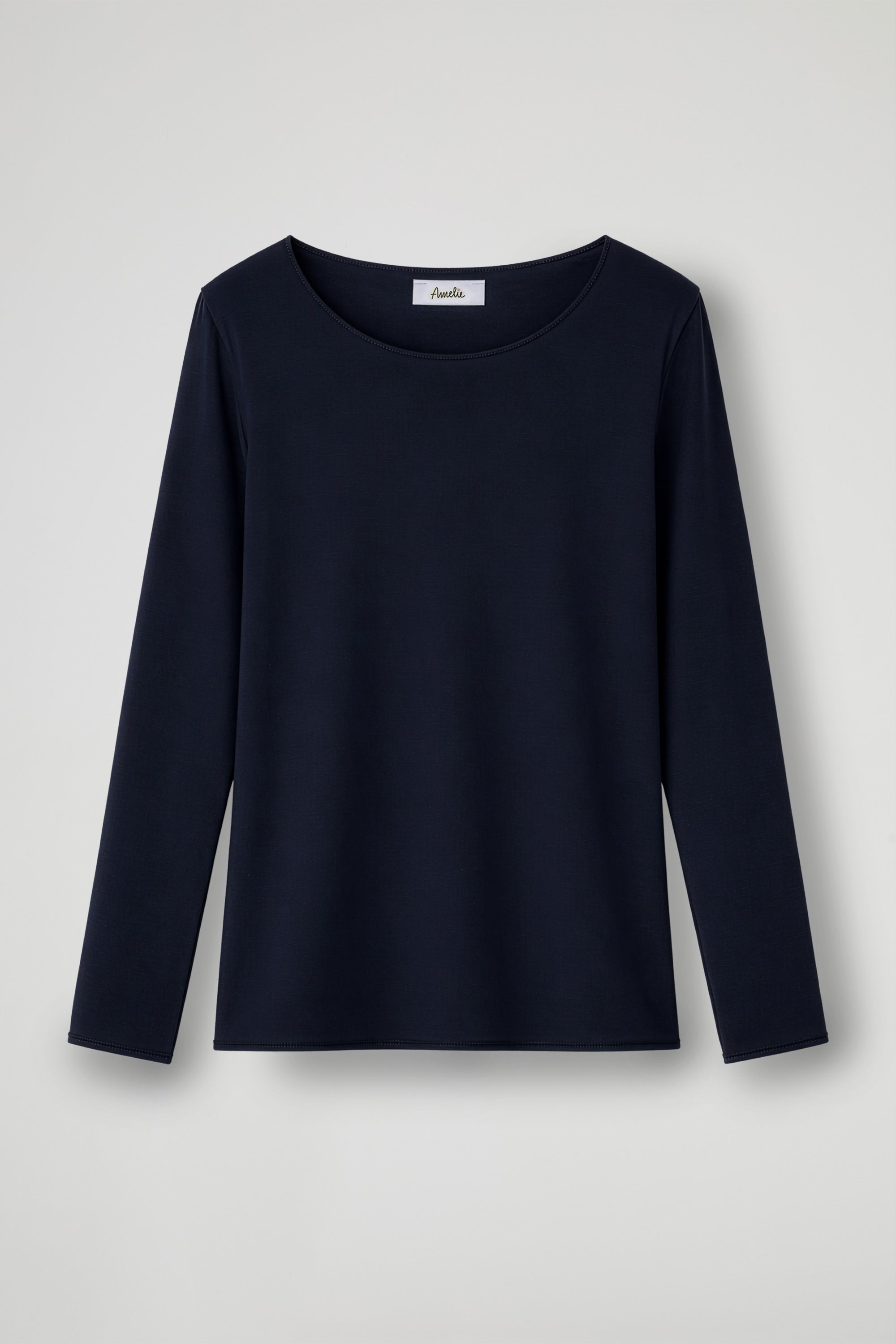 Long-sleeved shirt with an essential and elegant design, made of soft and comfortable fabric. The model features a wide, rounded neckline that enhances the décolleté, with a fluid fit that drapes delicately over the body; Ideal to wear alone or as a base layer under jackets and cardigans.