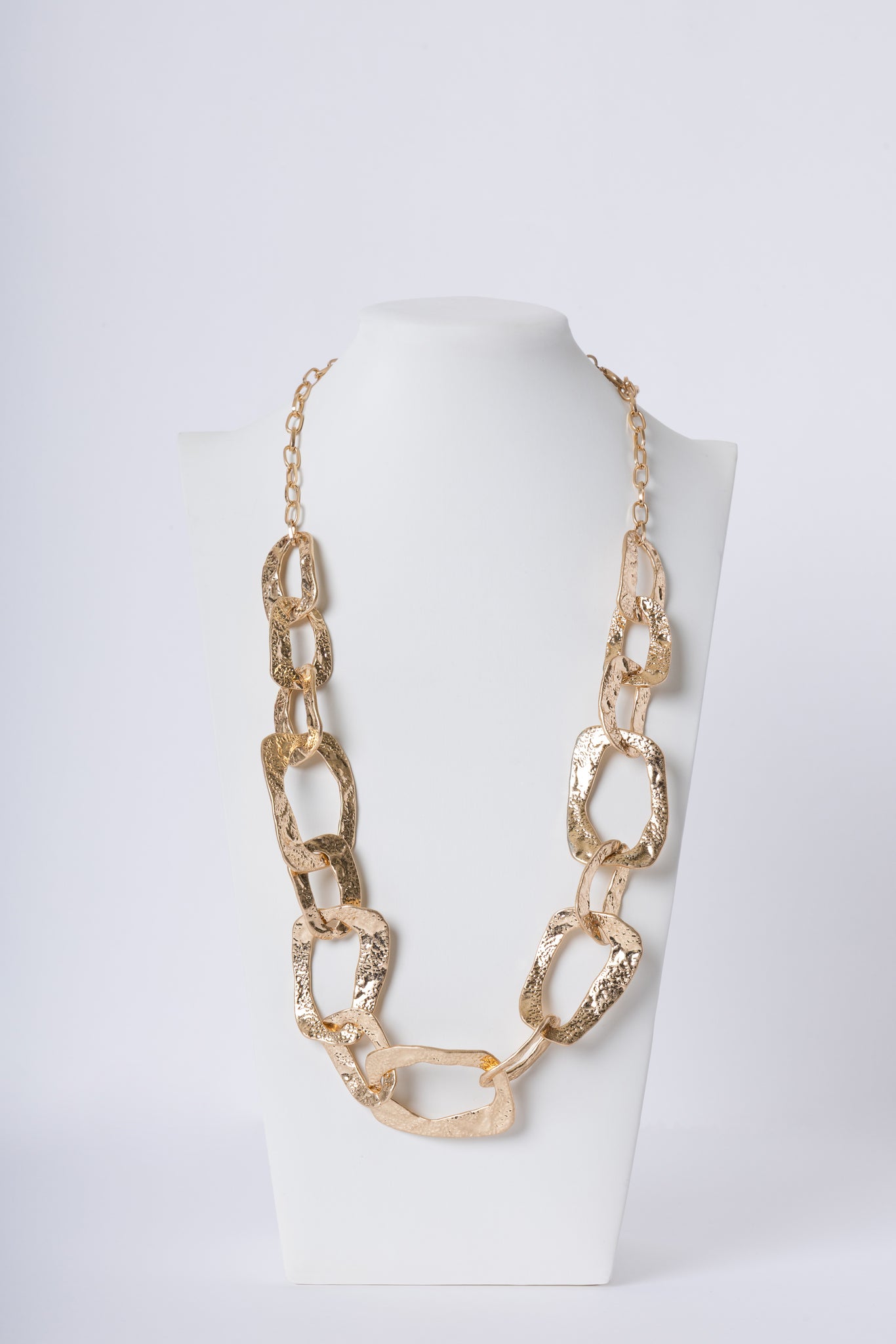 Collana dal design a maglie grandi irregolari, con finitura martellata che crea riflessi caldi e un look sofisticato. La parte superiore è completata da una catena più fine, per un contrasto elegante e una vestibilità comoda. Perfetta da sola come protagonista o da abbinare a scolli semplici.