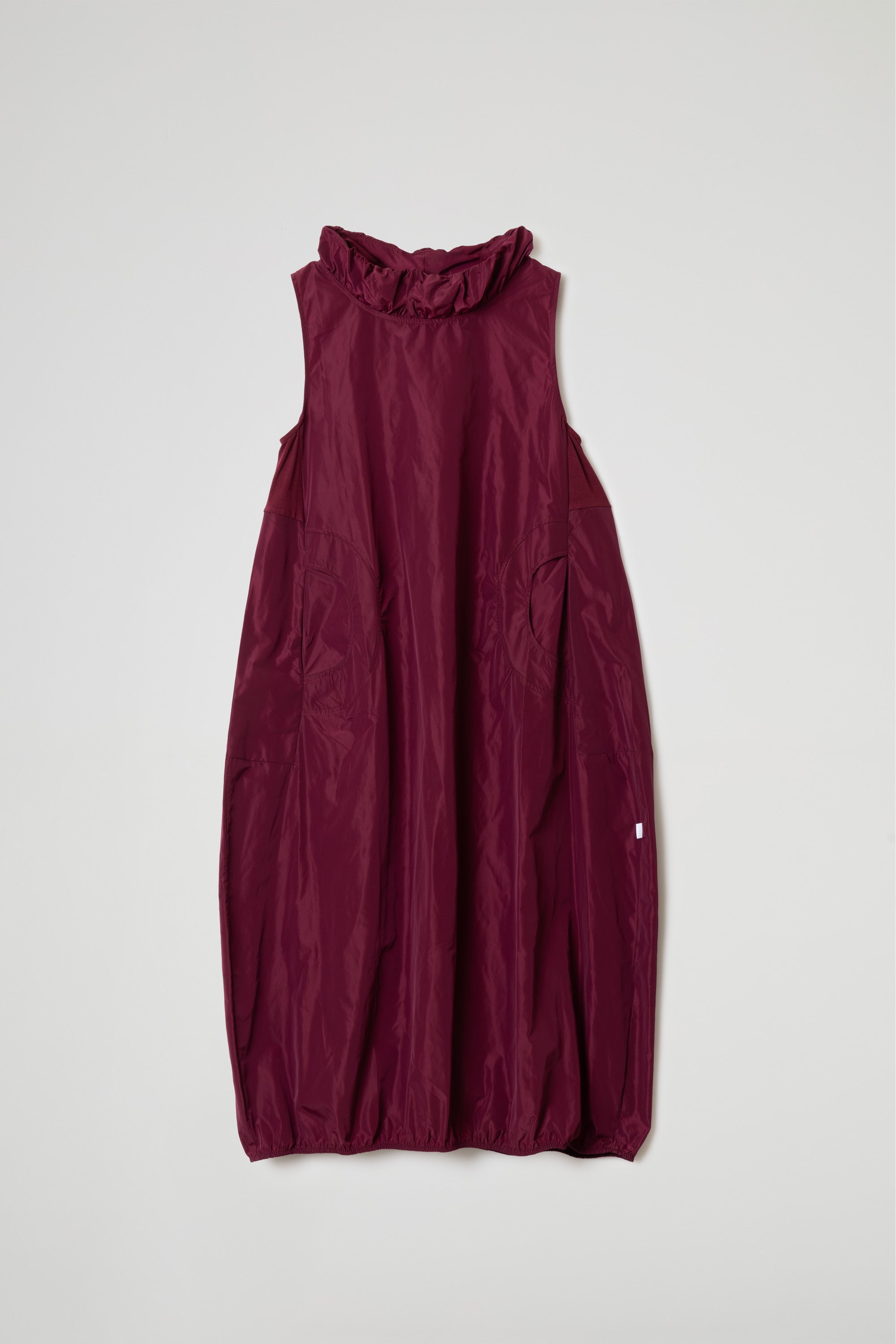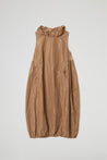 Maxi abito smanicato in tessuto taffetà effetto nacrè, collo ad anello con Rouches, tasche ad oblò, elastico sul fondo, linea ad ovetto.