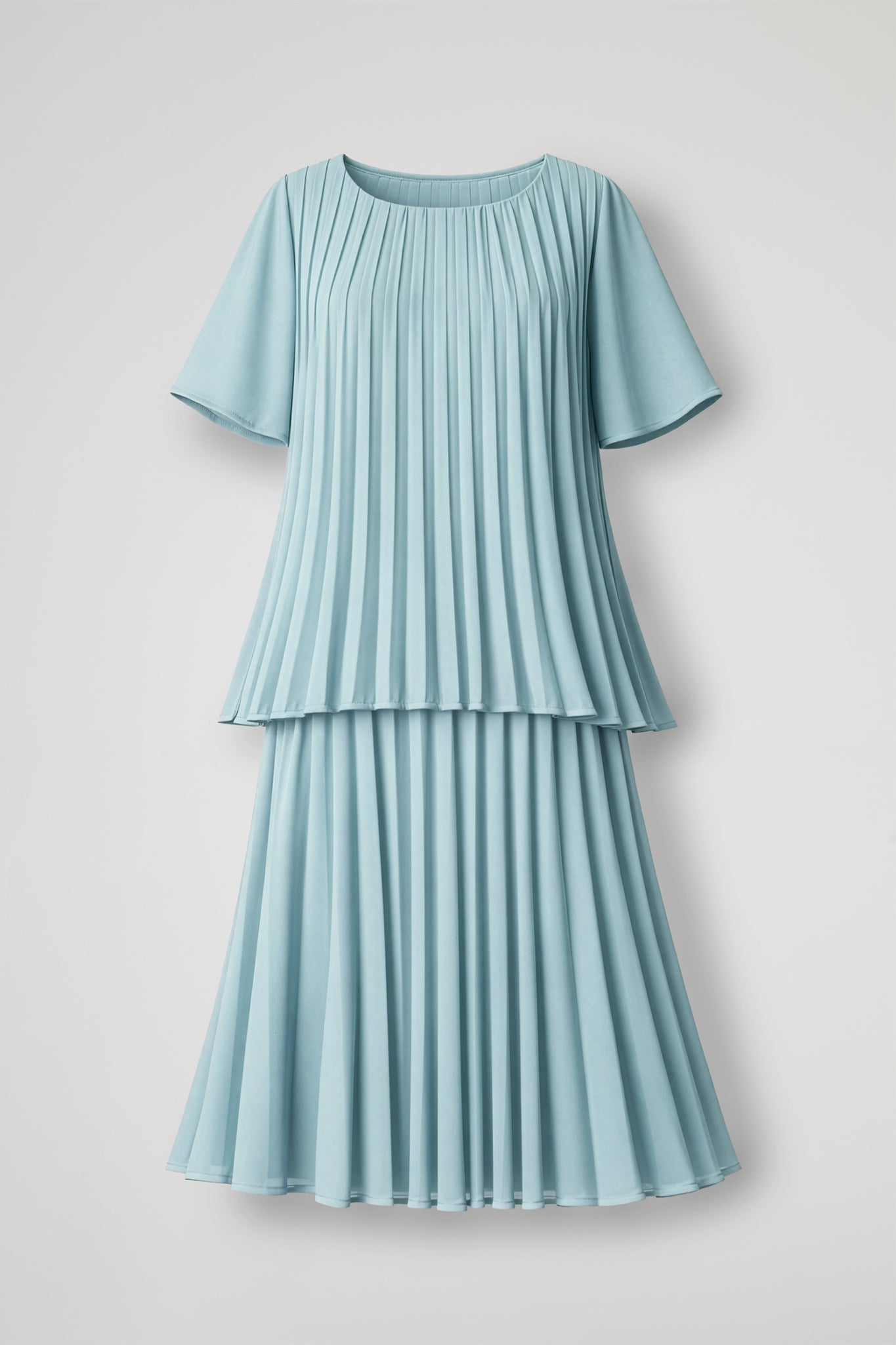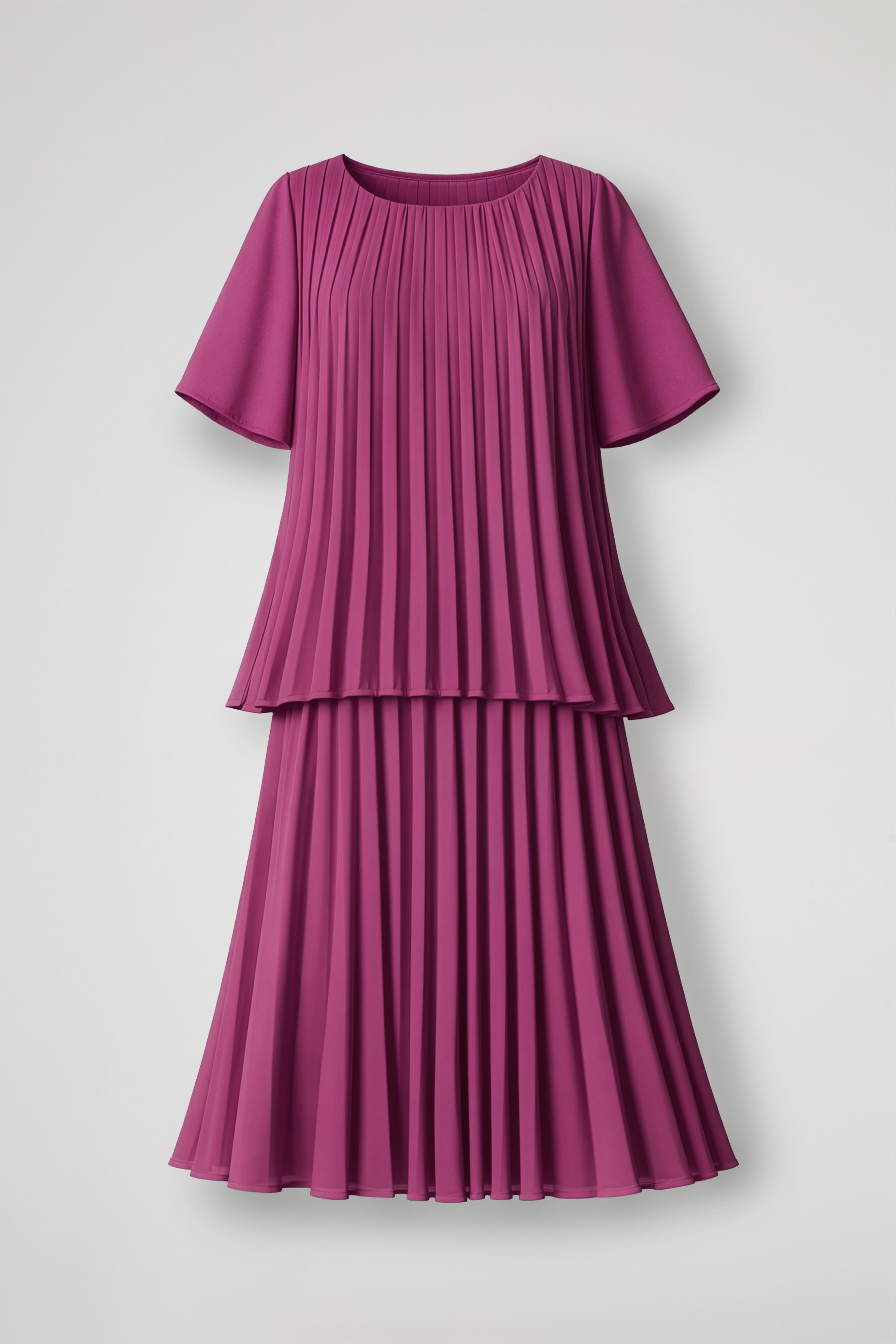 Abito midi in crepe plissè soleil con balza, scollo rotondo, manica corta. Linea svasata.