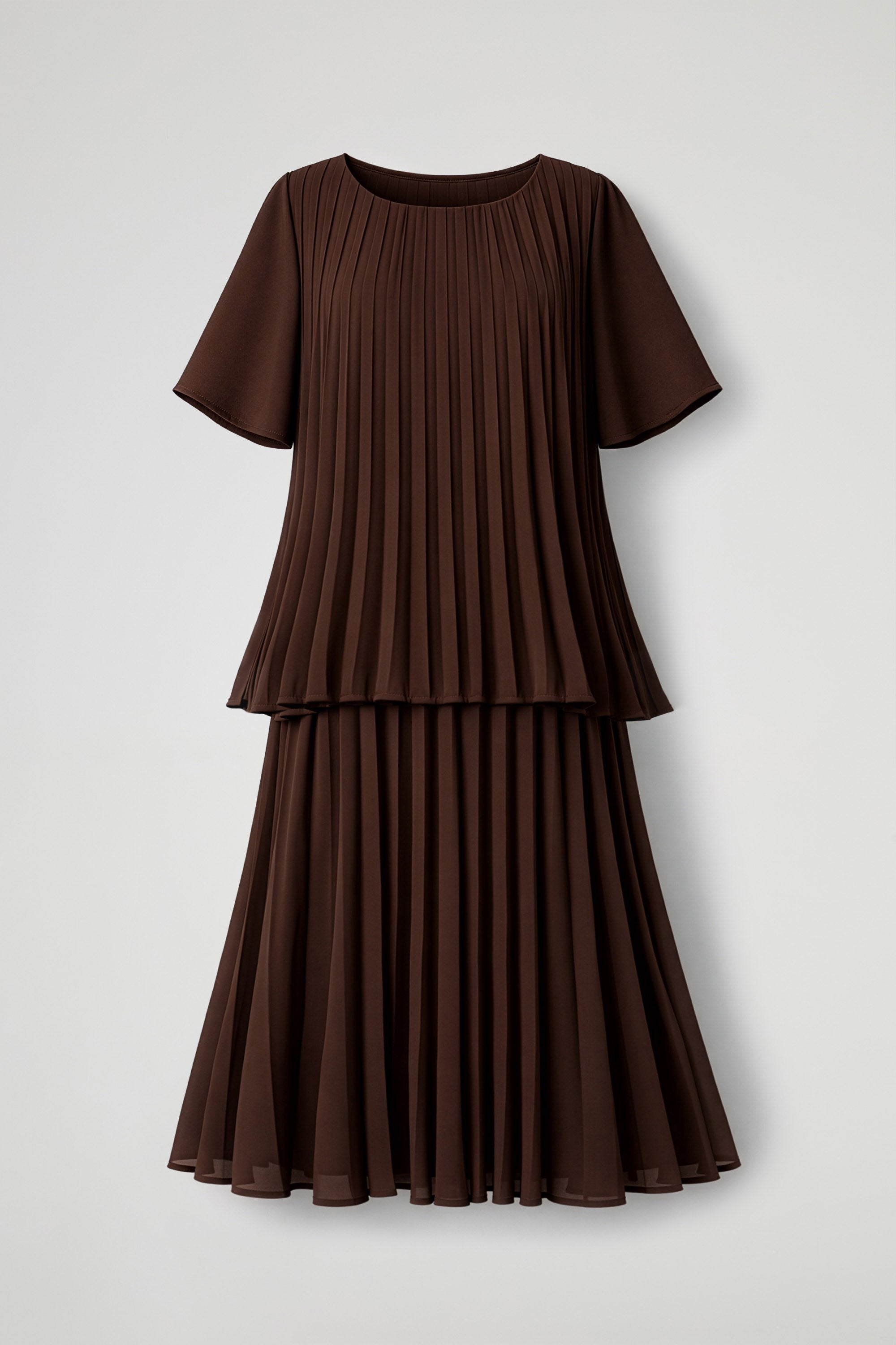 Abito midi in tessuto crepe plissé, leggero, elegante e super femminile. Le pieghe sottili disegnano la silhouette e creano un movimento fluido ad ogni passo, mentre l’effetto due pezzi dona un tocco moderno e ricercato. Lo scollo rotondo e le maniche ampie lo rendono comodo ma impeccabile.