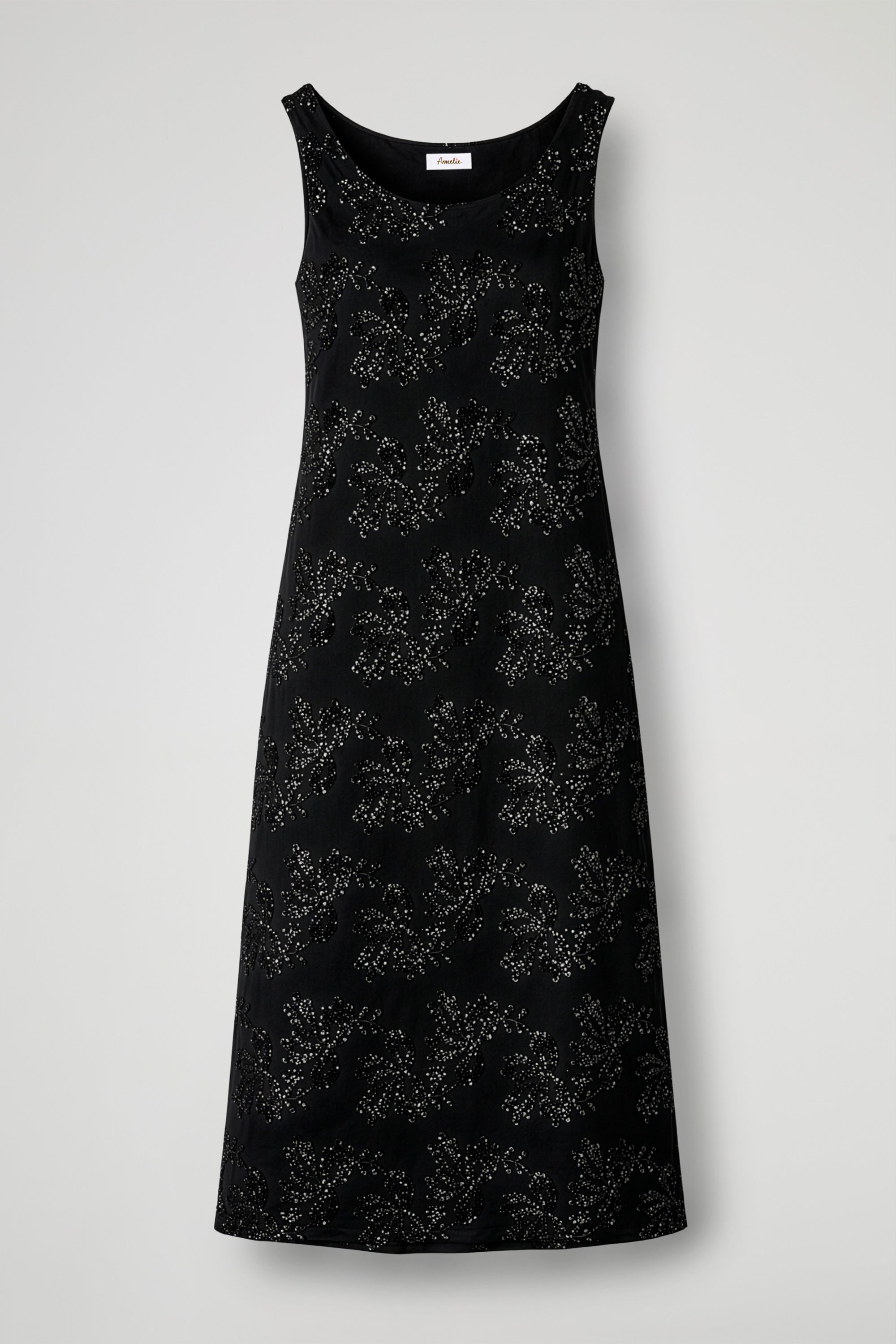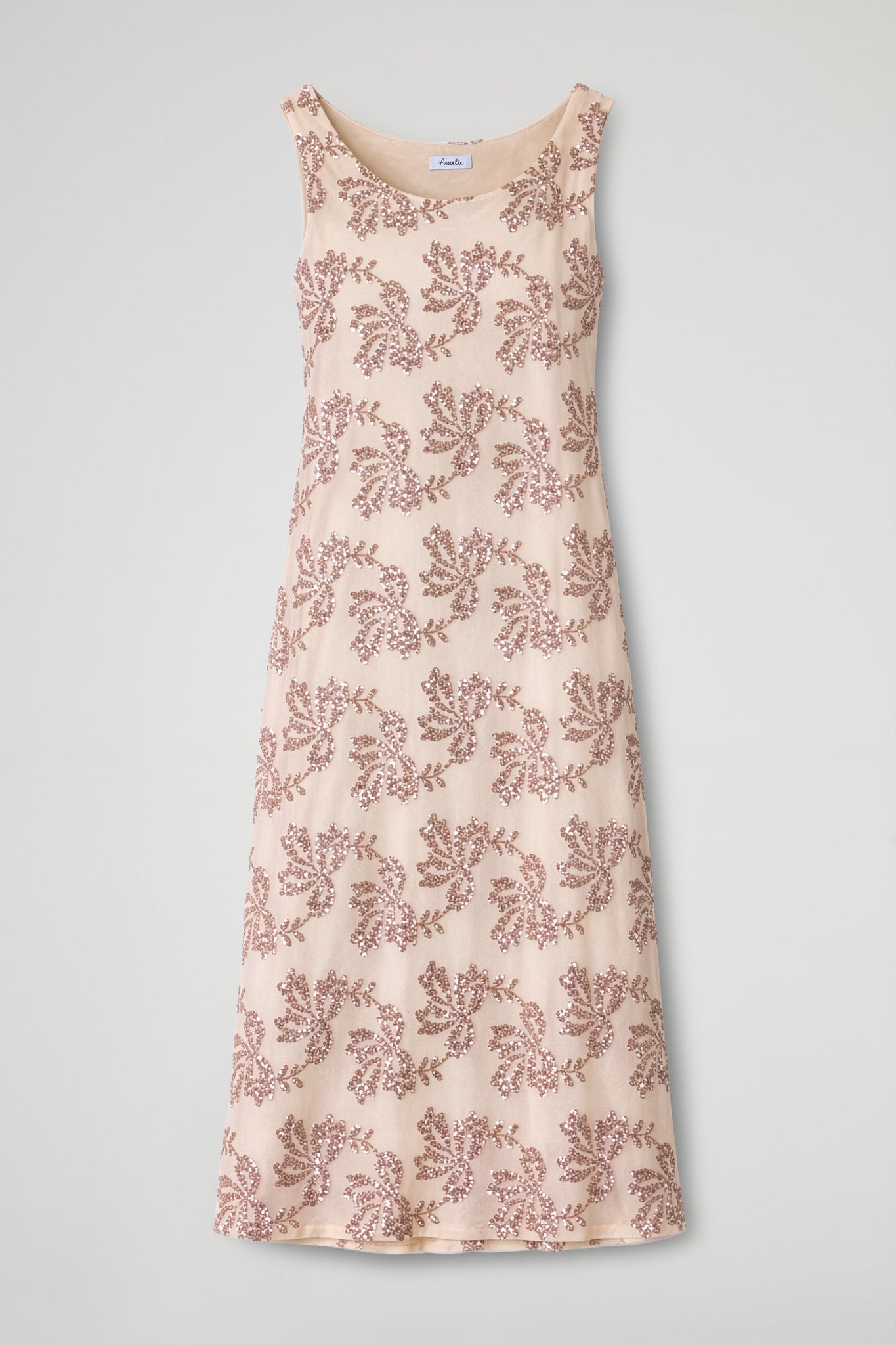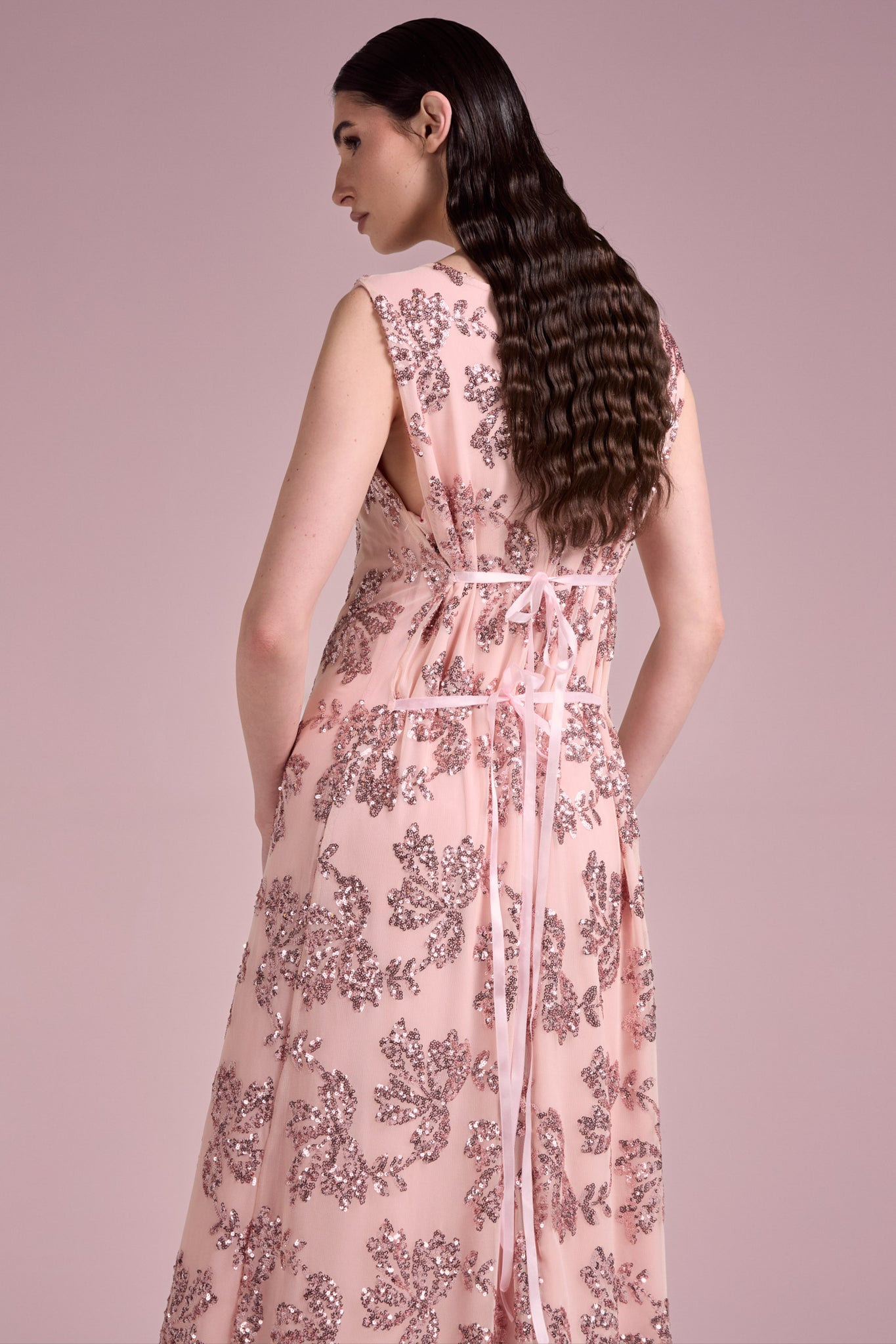 Abito lungo dalla linea leggermente svasata impreziosito da ricami in paillettes tono su tono che disegnano eleganti motivi floreali, per un effetto luminoso e sofisticato; Lo scollo tondo, pulito ed essenziale, è accompagnato da spalline larghe che garantiscono comfort; Elemento distintivo è la presenza sul retro di sottili nastri regolabili in vita, annodabili a fiocco, che permettono di definire il punto vita e personalizzare la vestibilità.
