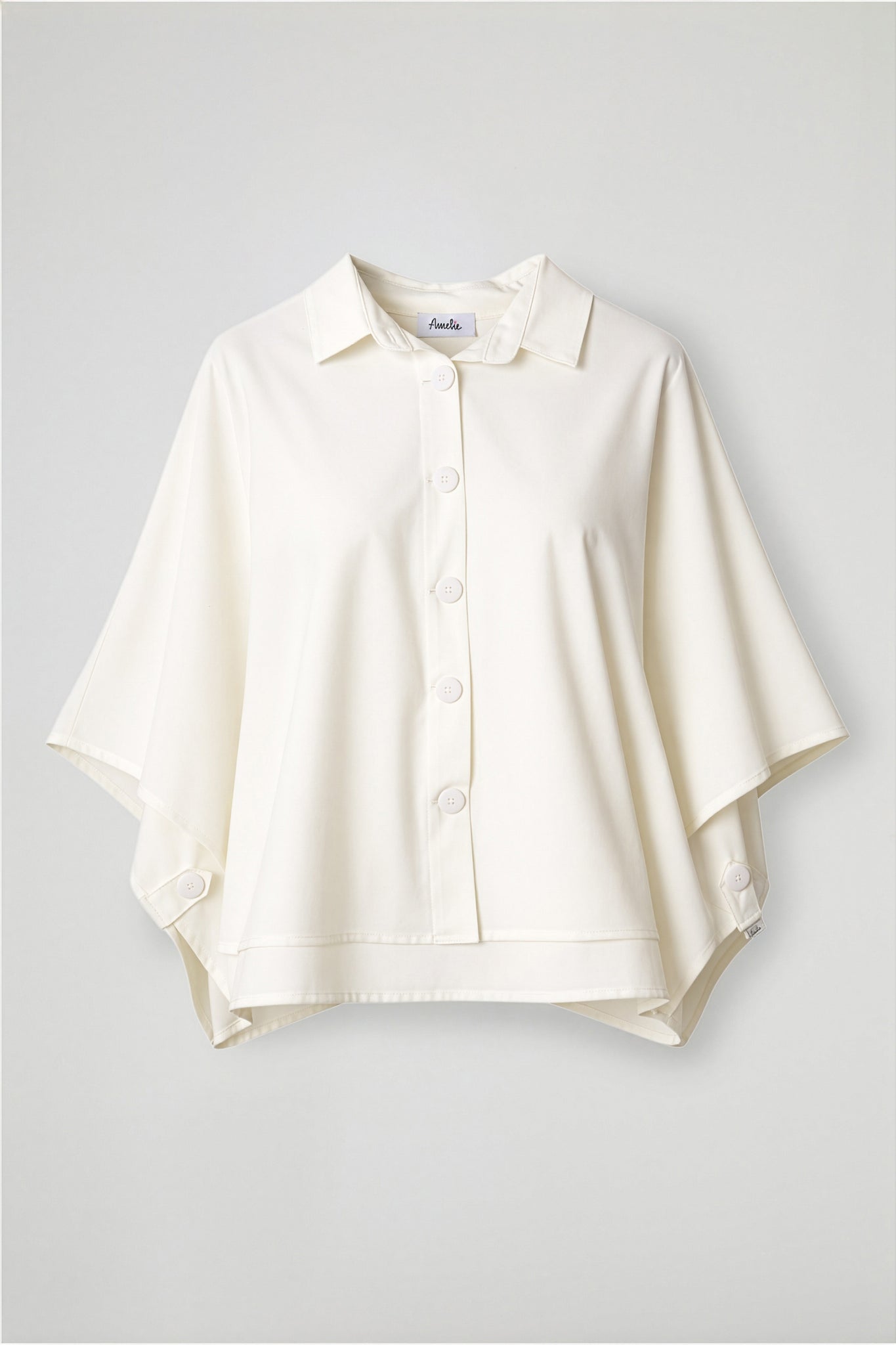 Camicia mantella dalla linea ampia e asimmetrica, colletto classico alla francese, maniche ampie a  ¾ ,chiusura frontale con bottoni tono su tono, spacchetti laterali sul fondo con pattina a chiusura con bottone .Linea ampia