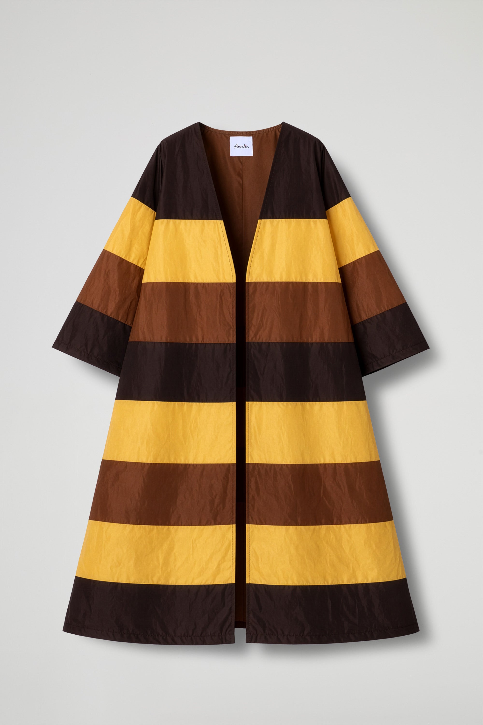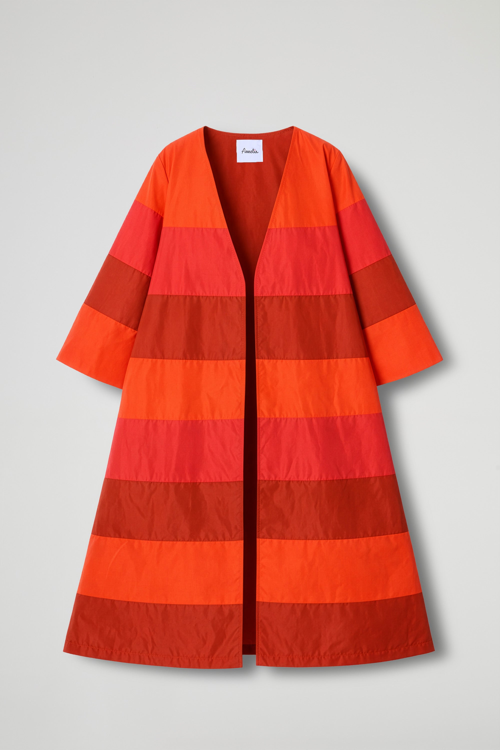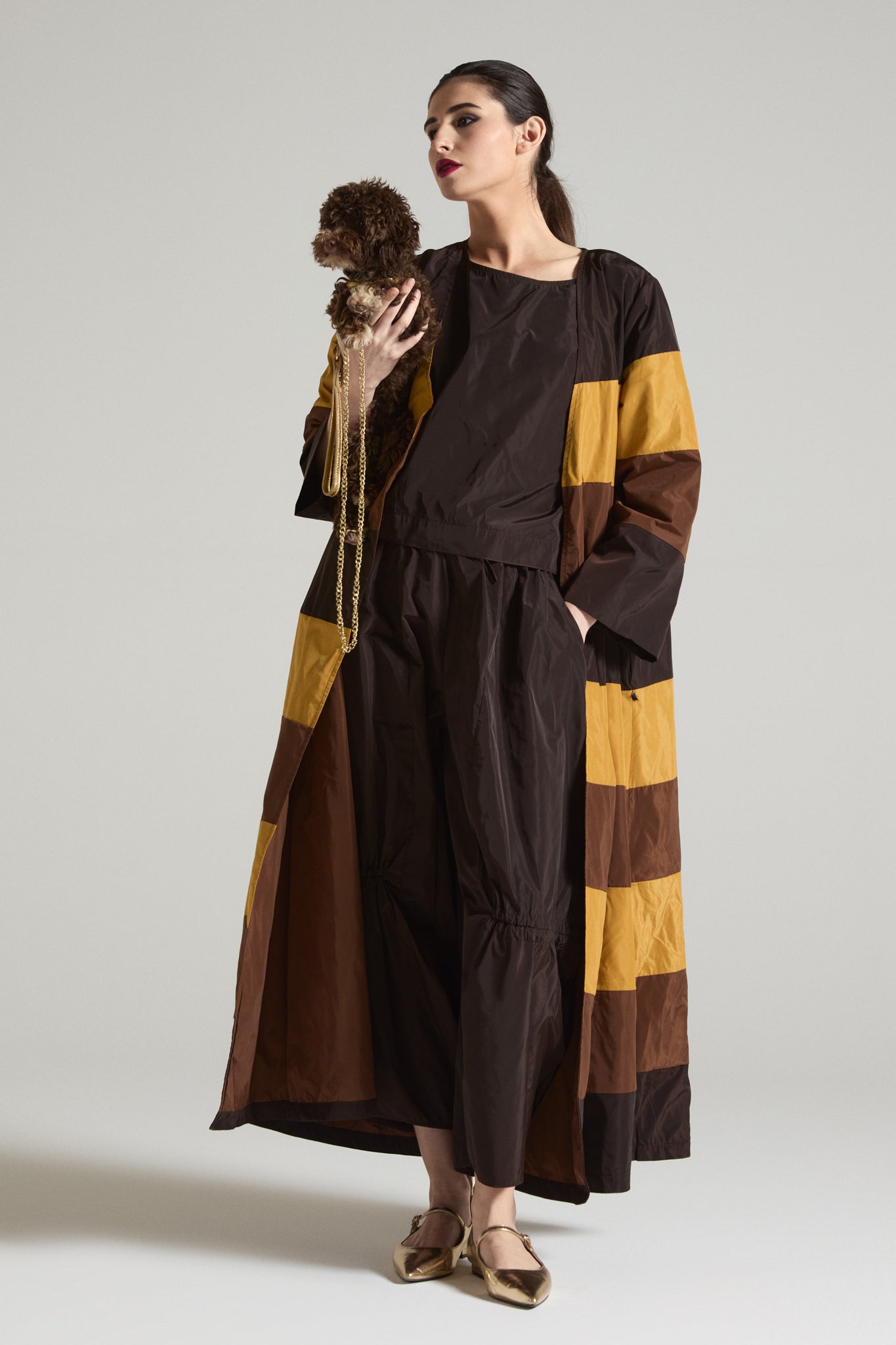Spolvero lungo dal forte impatto scenico, realizzato in tessuto leggero e luminoso con lavorazione patchwork a fasce color block. La linea è morbida e avvolgente, con spalle scese e maniche ampie a 3/4 che regalano volume e movimento. Si indossa aperto come capospalla elegante e versatile, perfetto per dare carattere anche al look più essenziale.