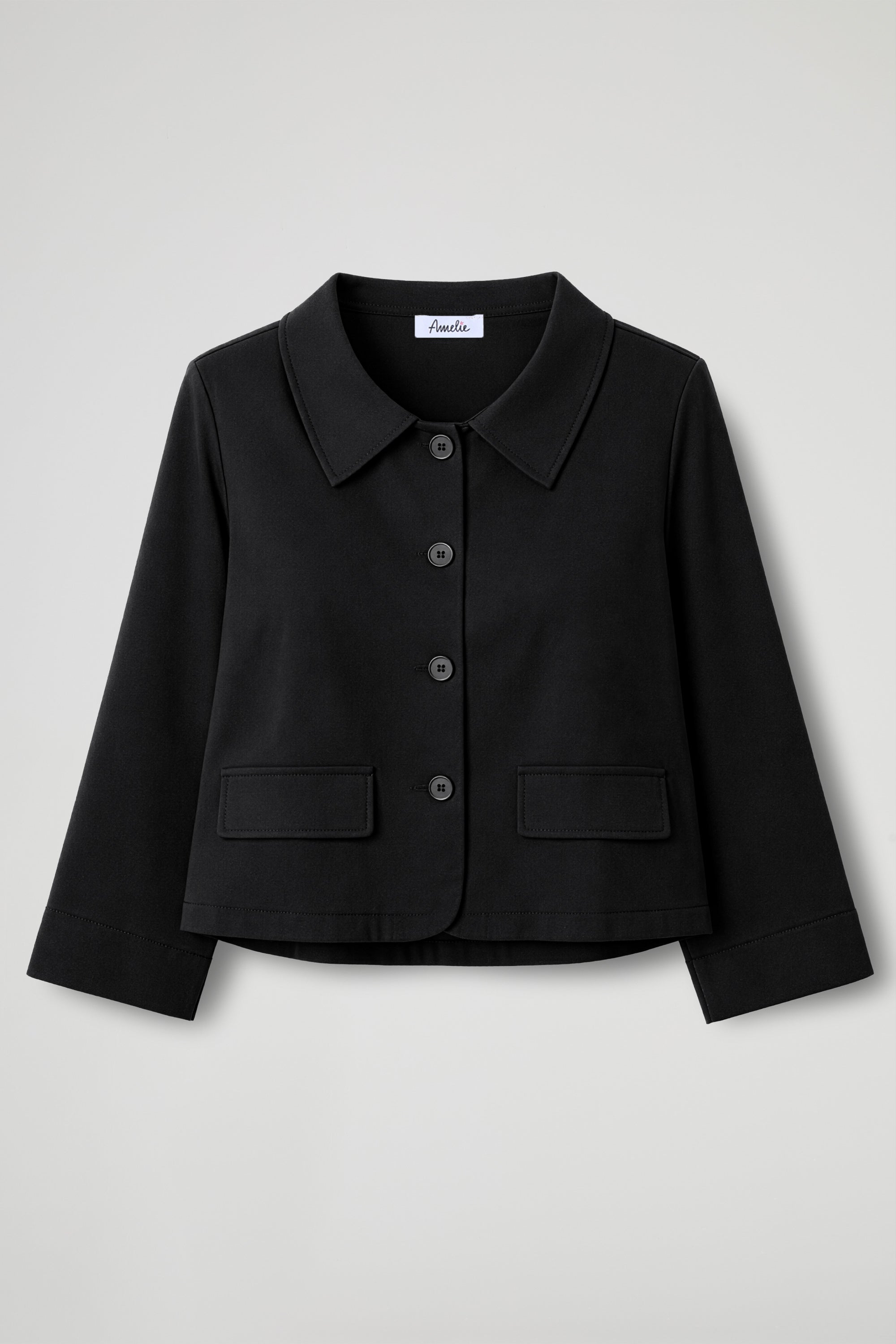 Giacca corta dal taglio boxy e pulito, pensata per dare struttura al look senza appesantire. Il colletto a camicia e l’abbottonatura frontale la rendono essenziale ma super versatile: perfetta su pantaloni a vita alta, denim o abiti, dal giorno alla sera.
