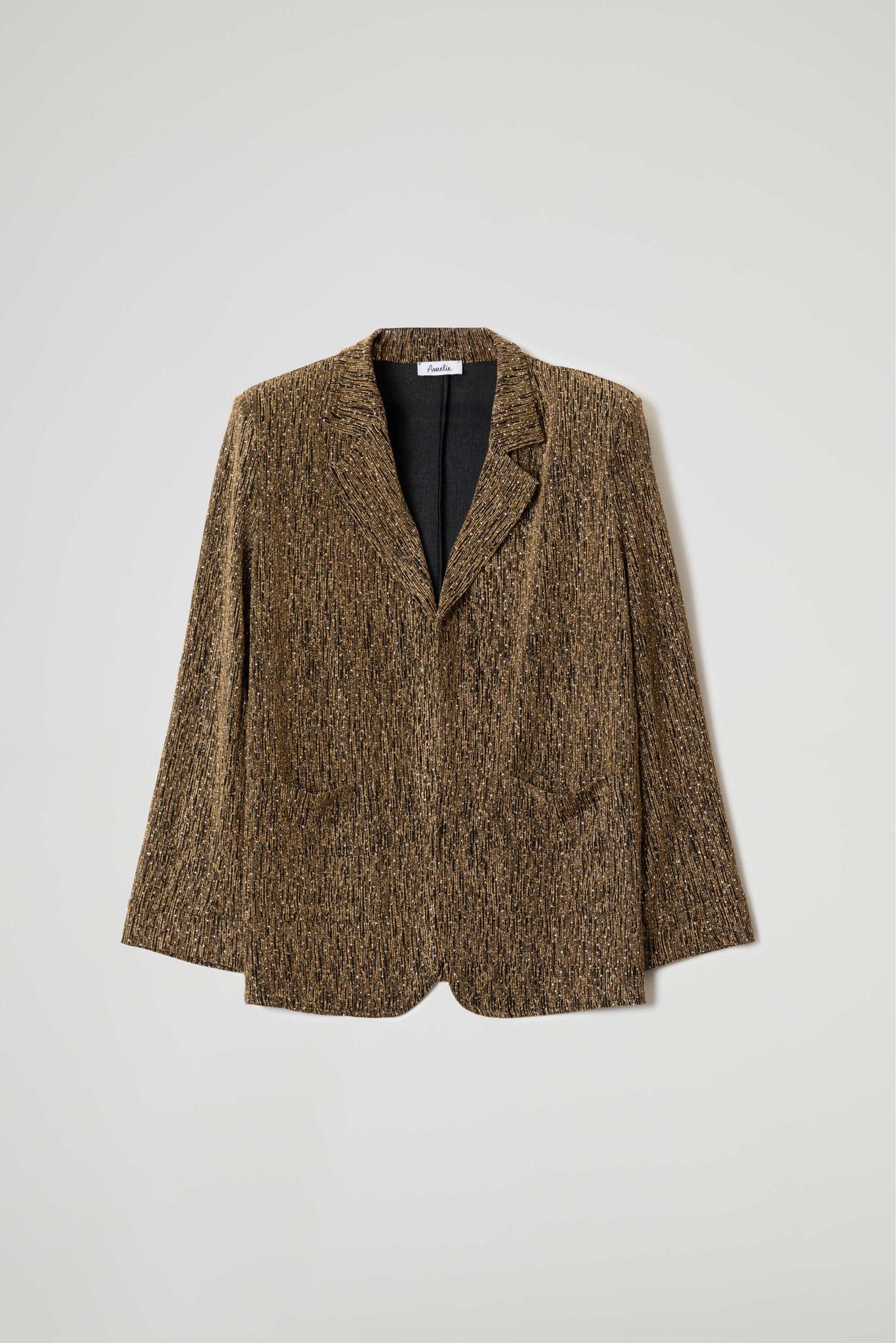 Giacca in lurex , un capo  che unisce eleganza e modernità in un design leggero e luminoso, perfetto per impreziosire un completo minimal, un abito da sera o un coordinato in lurex; è il capo ideale per brillare con discrezione e stile.