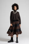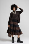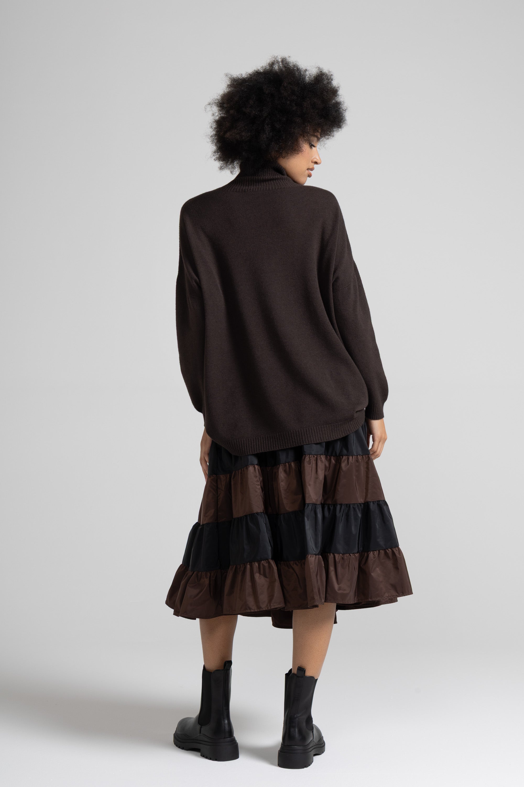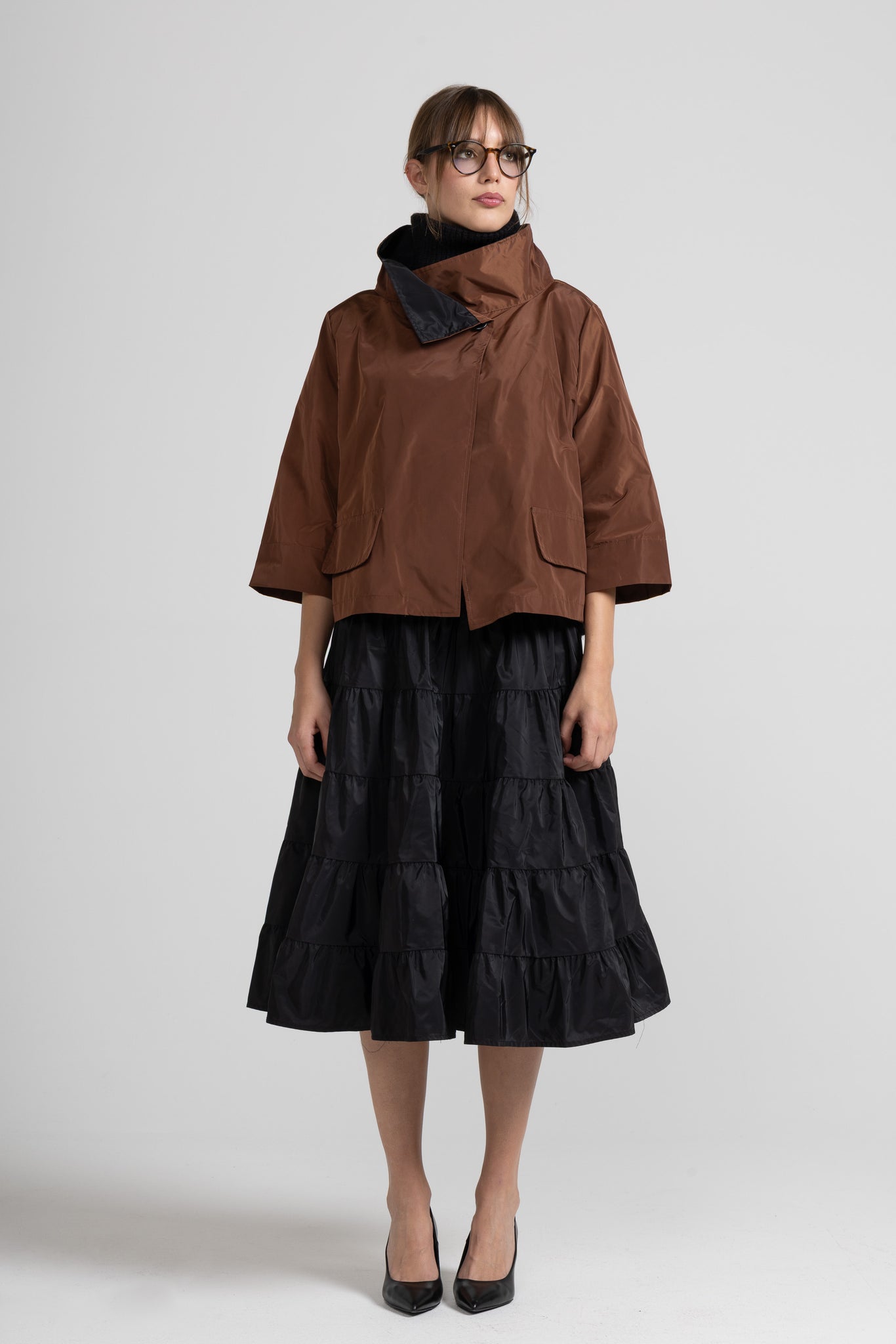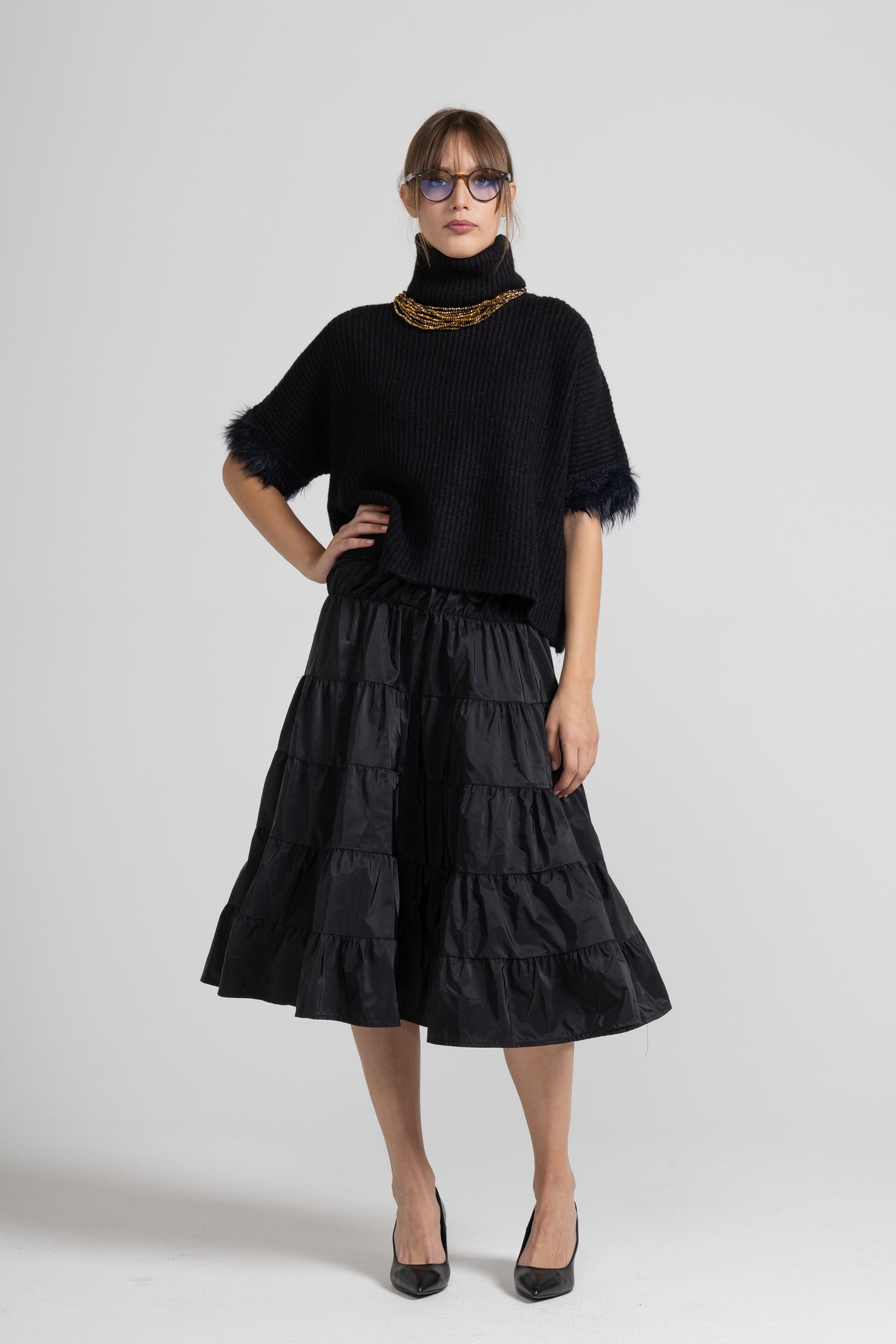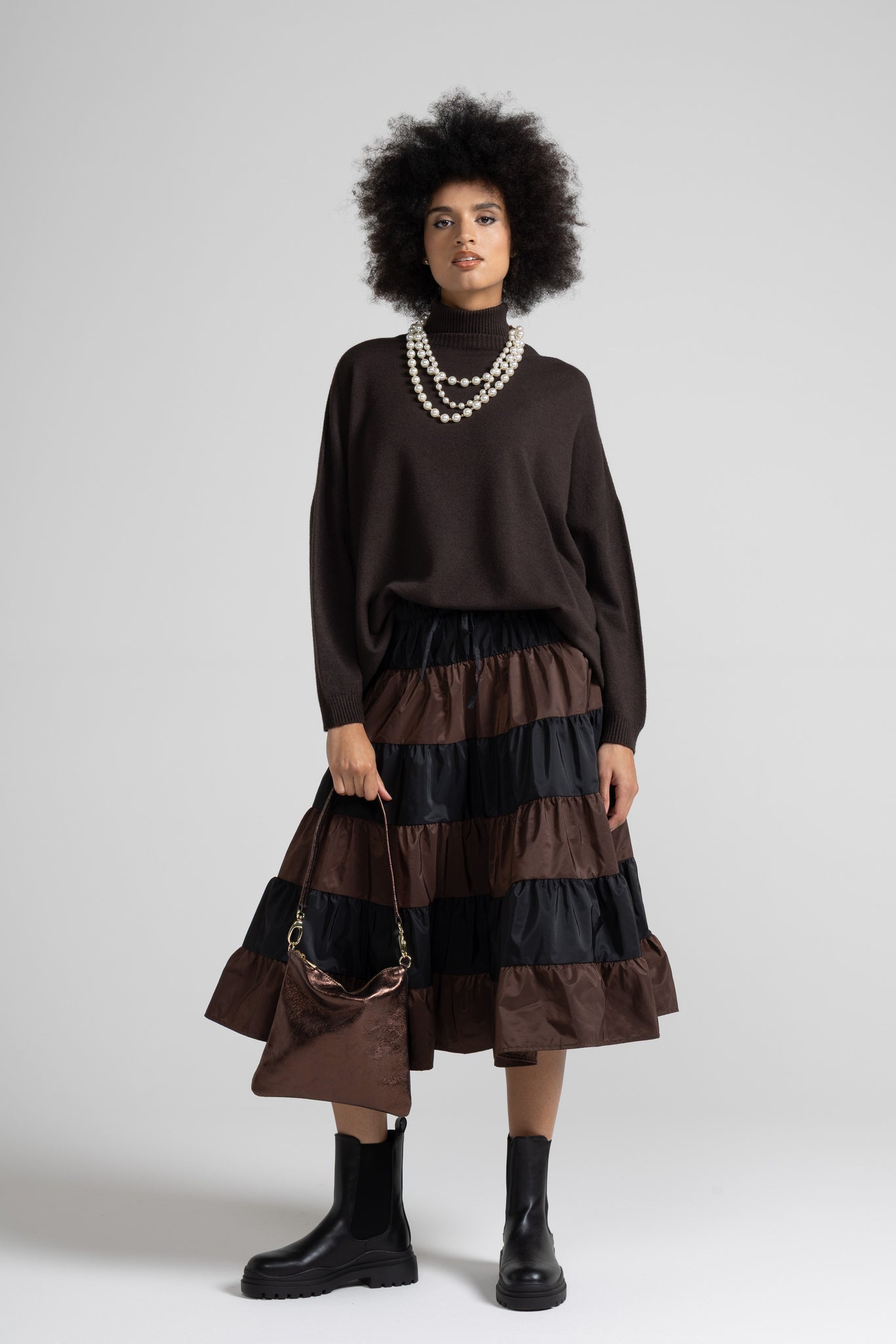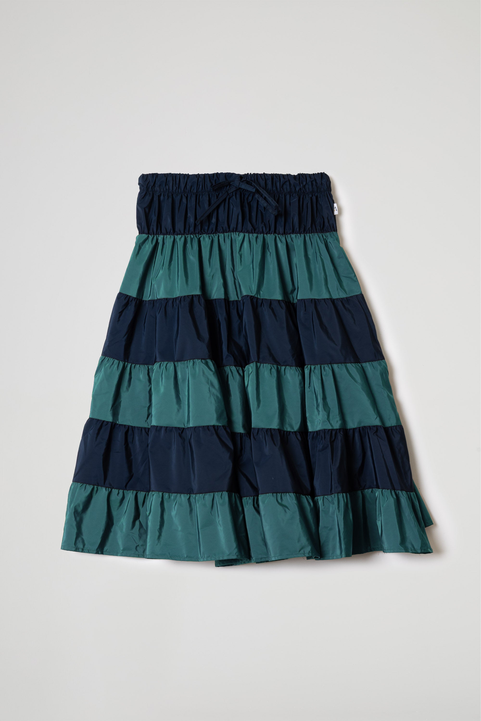 Gonna midi in tessuto taffetà effetto nacrè, vita elastica con piccolo fiocchetto sul davanti, tasche a filo, balze orizzontali arricciate a contrasto colore che regalano volume e dinamismo. Linea ampia e confortevole.