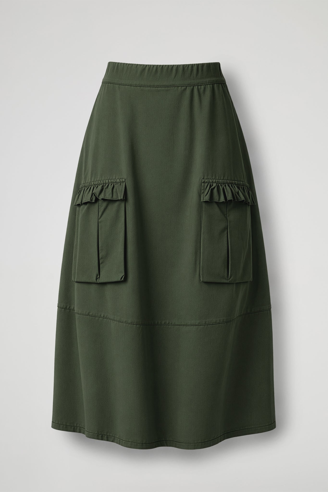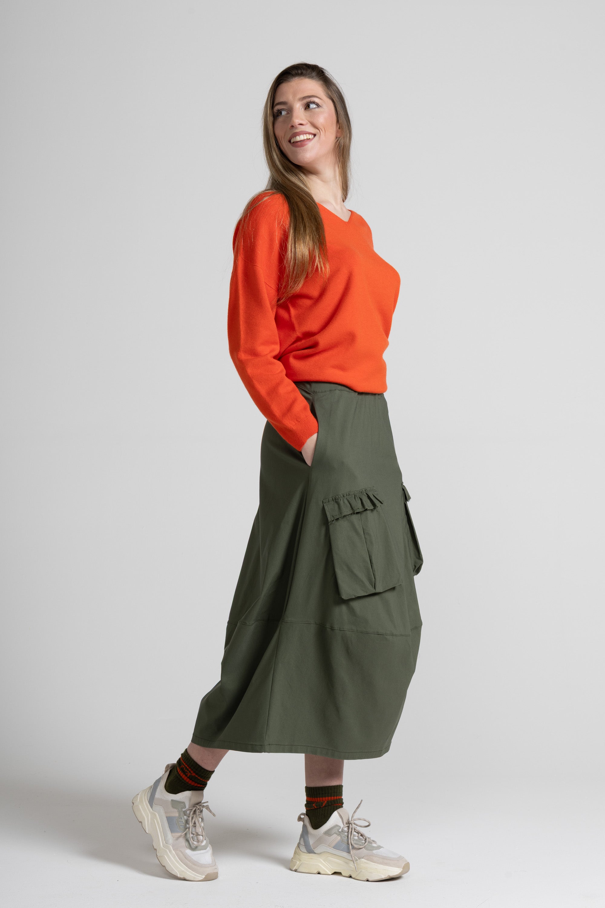 Gonna lunga, fascia alta e elastica in vira, 2 tasche applicate sul davanti con dettaglio balza arricciata, taglio orizzontale sul fondo. Linea ampia