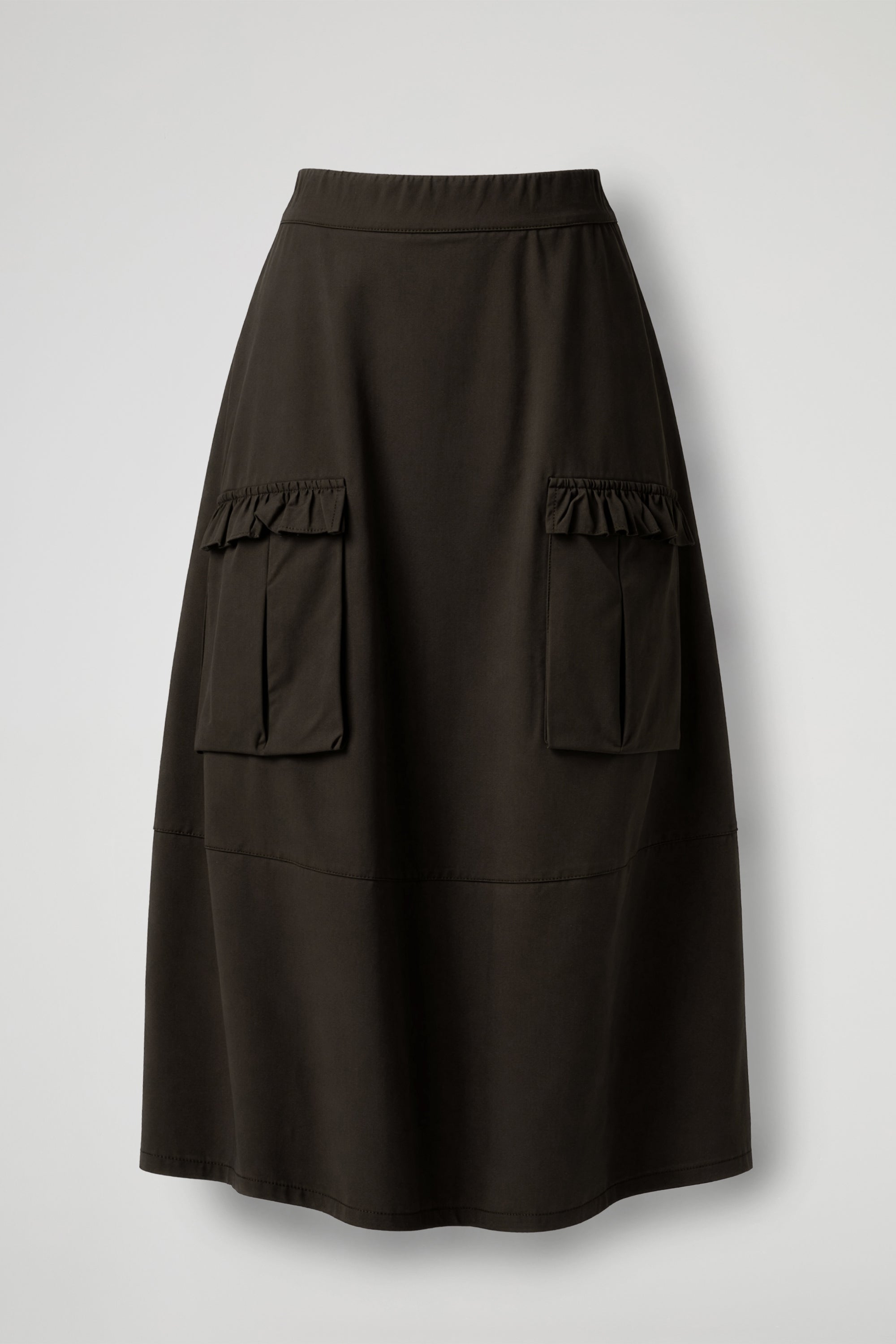 Gonna lunga dalla linea morbida e contemporanea, caratterizzata da un design utility rivisitato in chiave femminile. La silhouette è svasata e scivolata, con vita alta pulita e fascia confortevole. Sul davanti spiccano due maxi tasche applicate in stile cargo, rifinite da una balza arricciata sul bordo superiore che aggiunge un dettaglio delicato. Il modello è completato da un taglio orizzontale nella parte bassa che crea movimento e valorizza la caduta del capo.