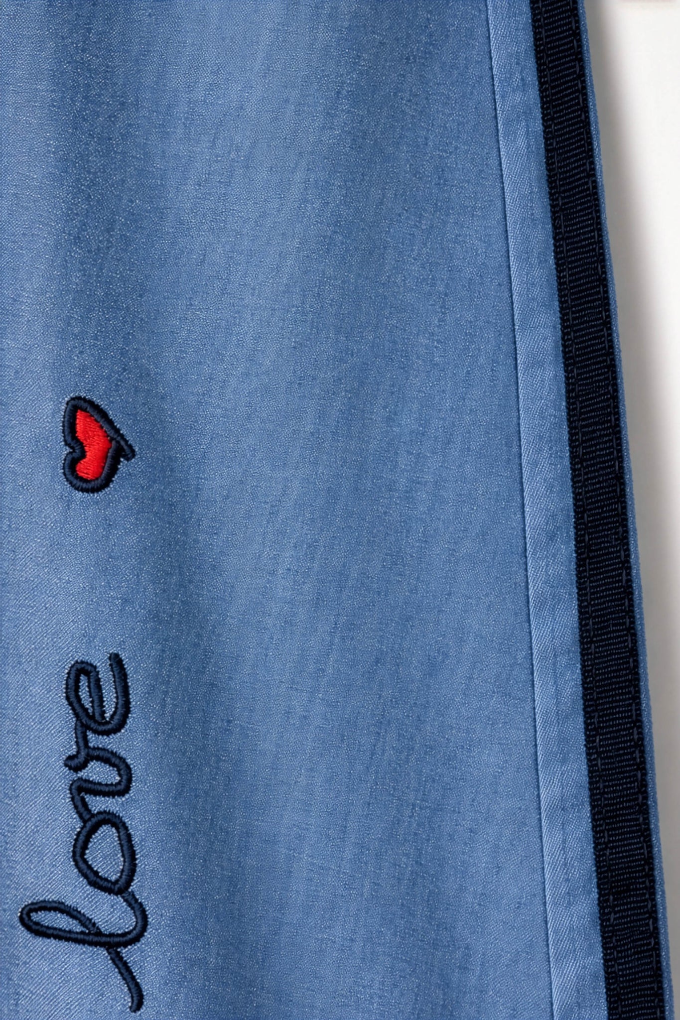 Gonna realizzata in tessuto leggero effetto denim, caratterizzata da una mano morbida e confortevole a contatto con la pelle. Il modello presenta una linea ampia a trapezio, sul davanti spicca una scritta ricamata dal tratto fine accompagnata da un piccolo cuore applicato, dettaglio decorativo che dona un tocco distintivo.