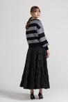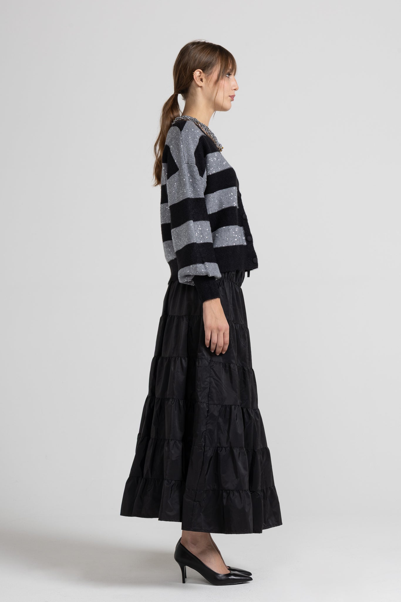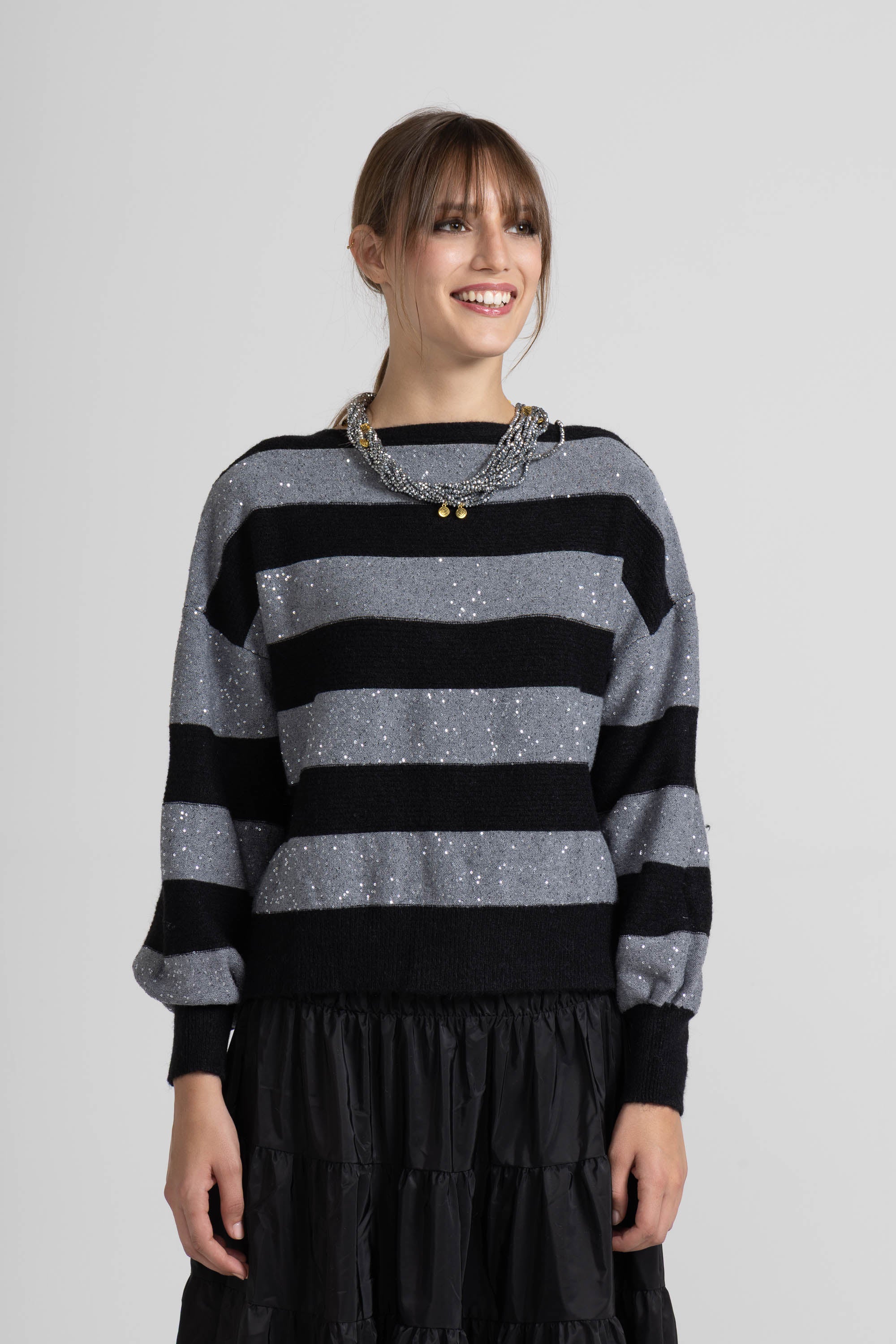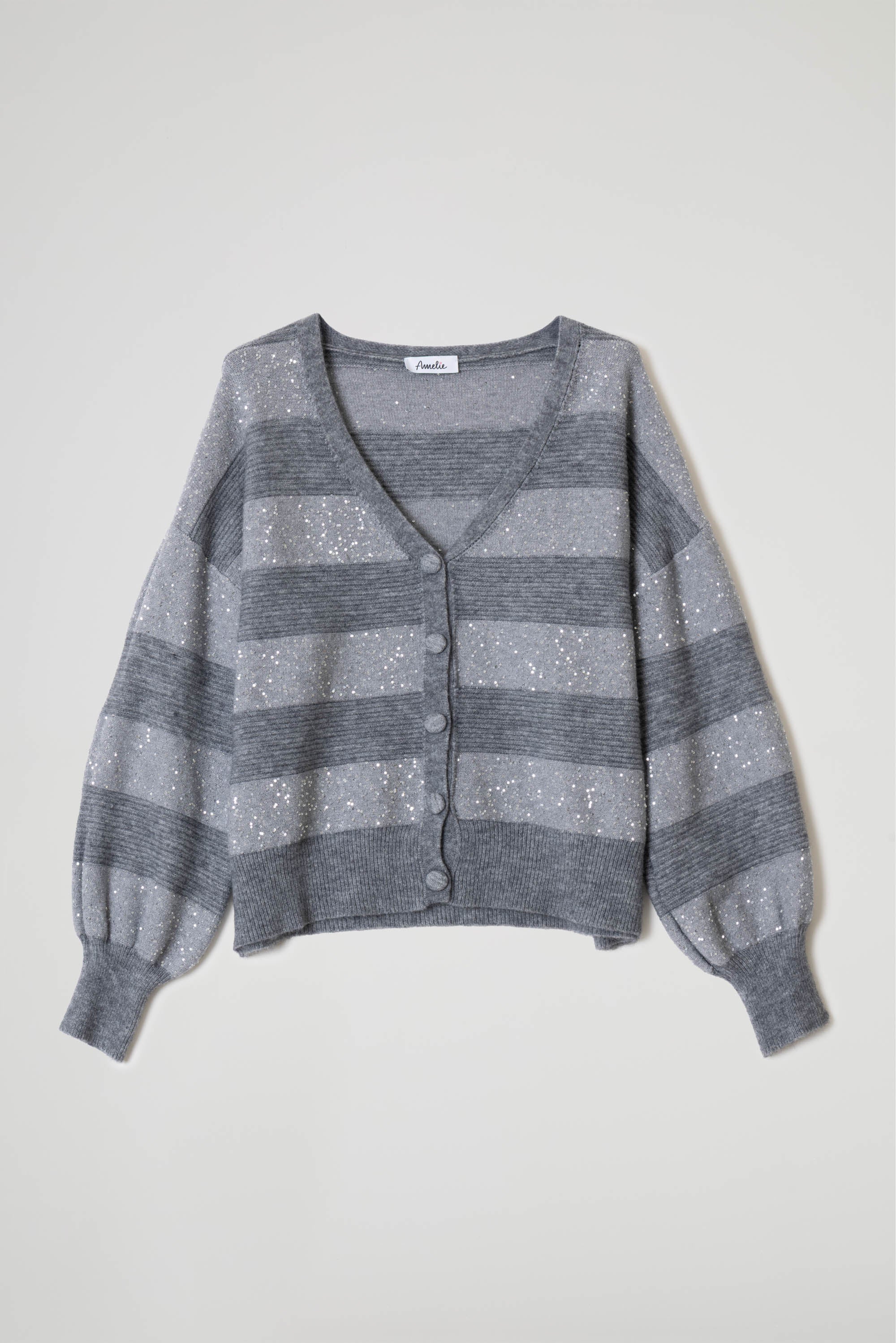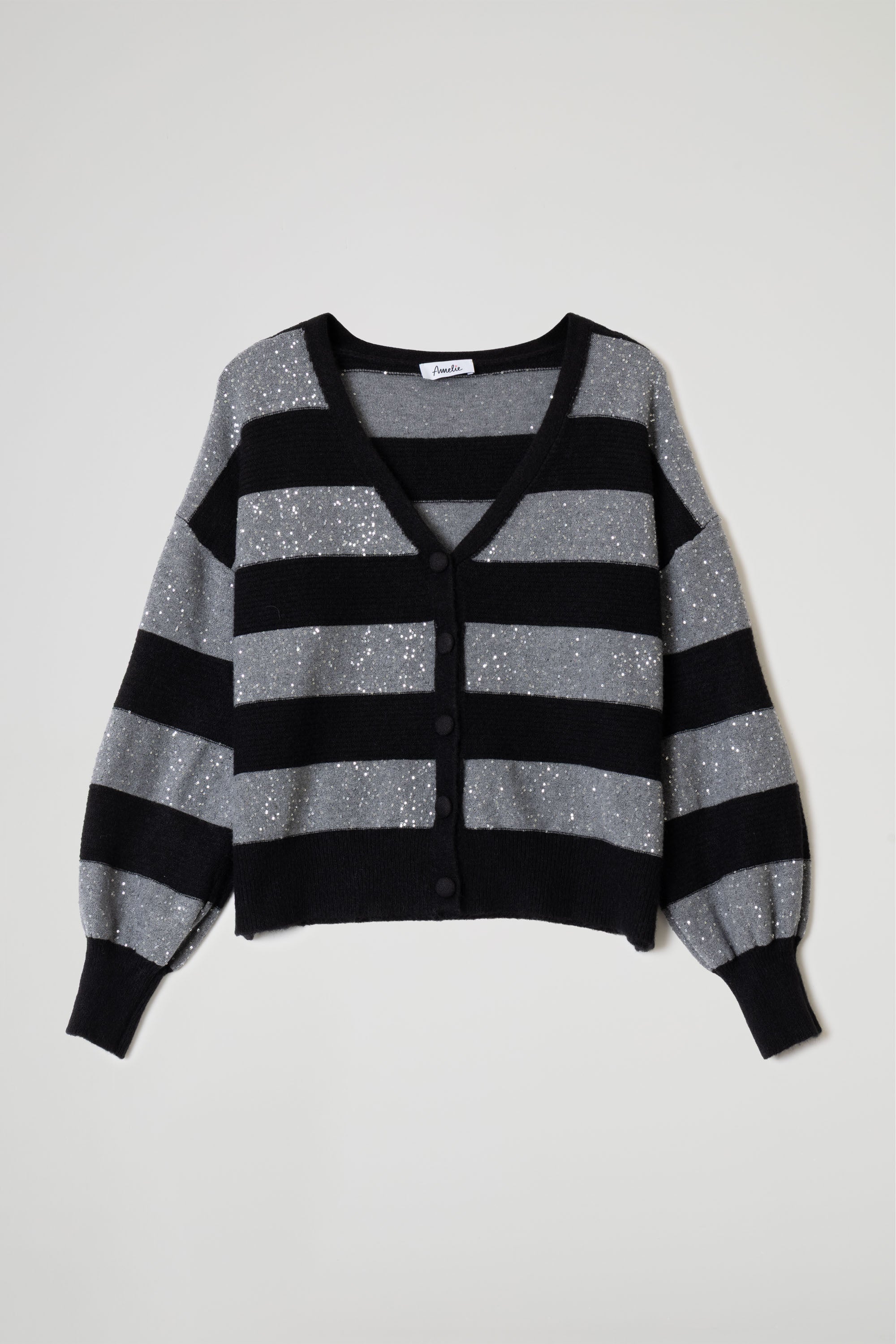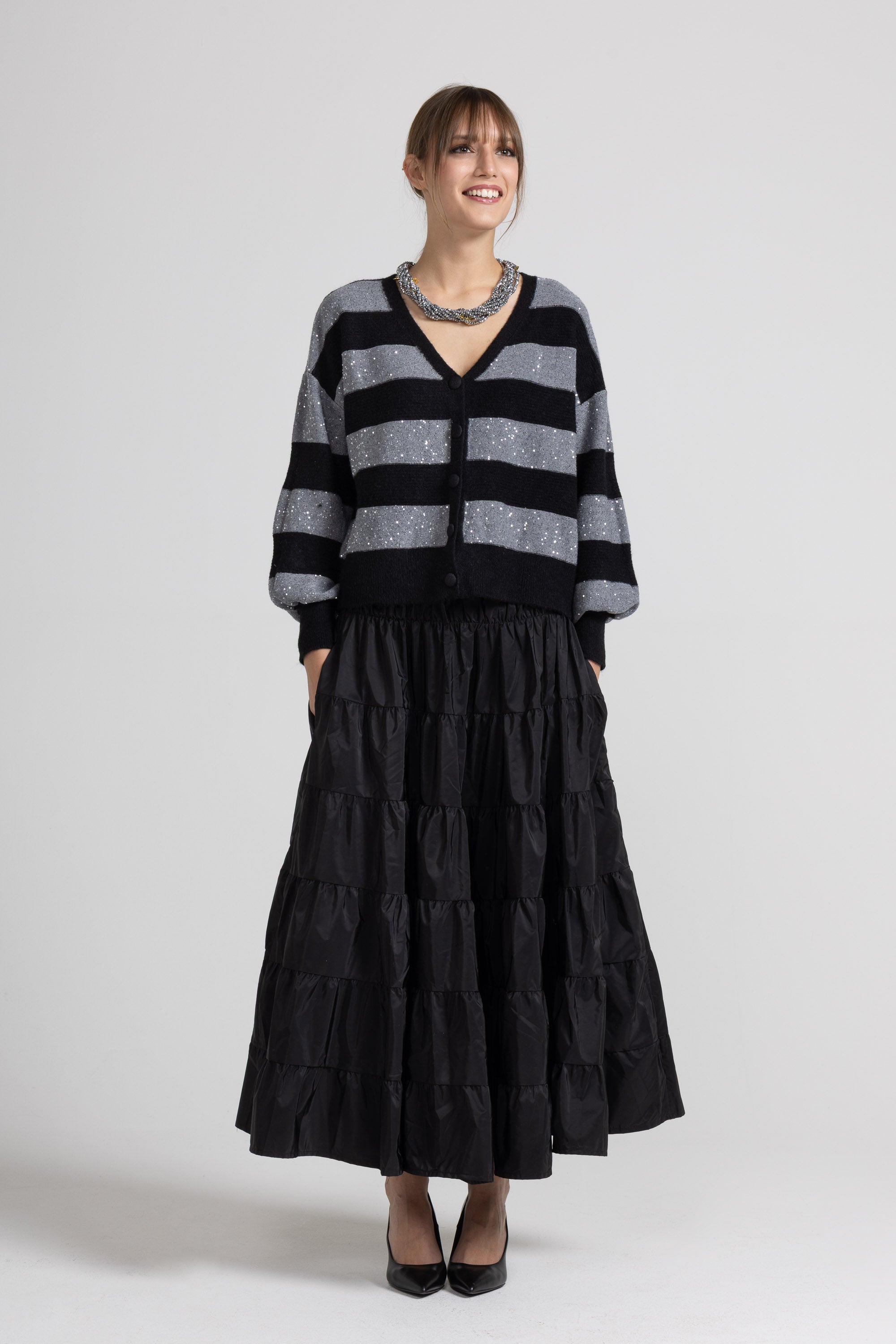 Cardigan a righe orizzontali alternate tra tessuto a coste e pannelli in filato lurex glitterato, scollo profondo a V, spalle scese, maniche lunghe a sbuffo con polsino a costine elasticizzato, chiusura frontale con bottoni rivestiti tono su tono. Linea confortevole