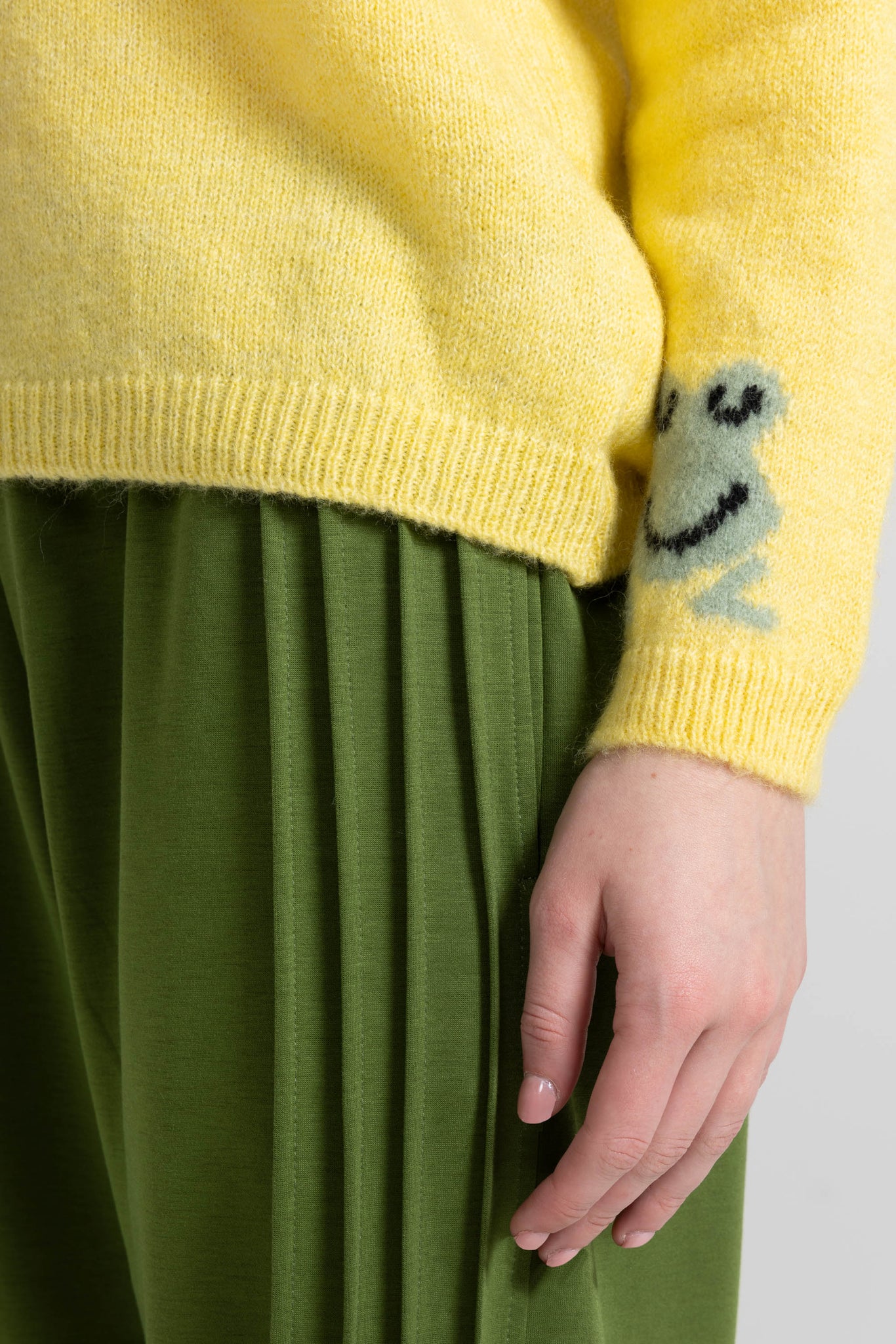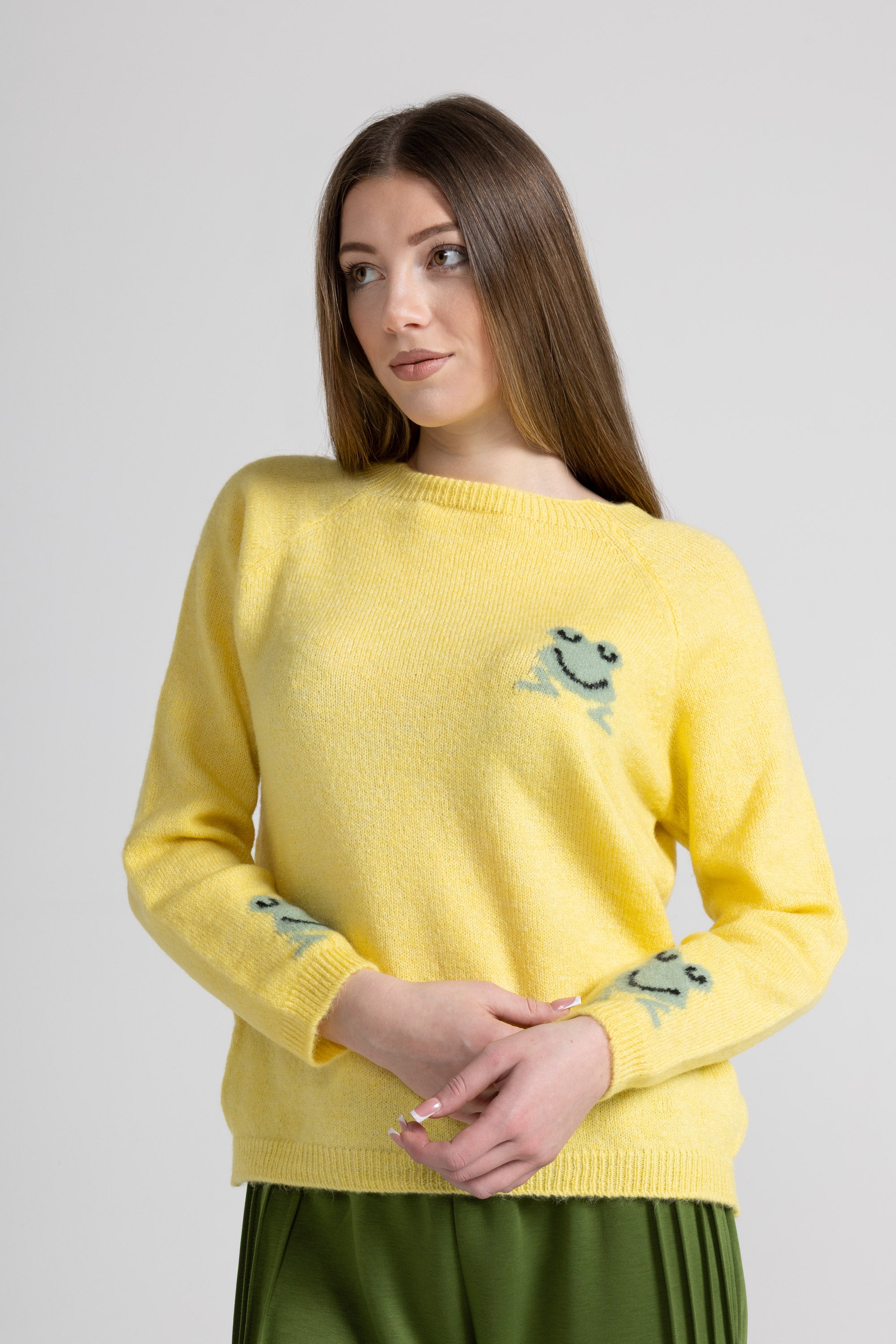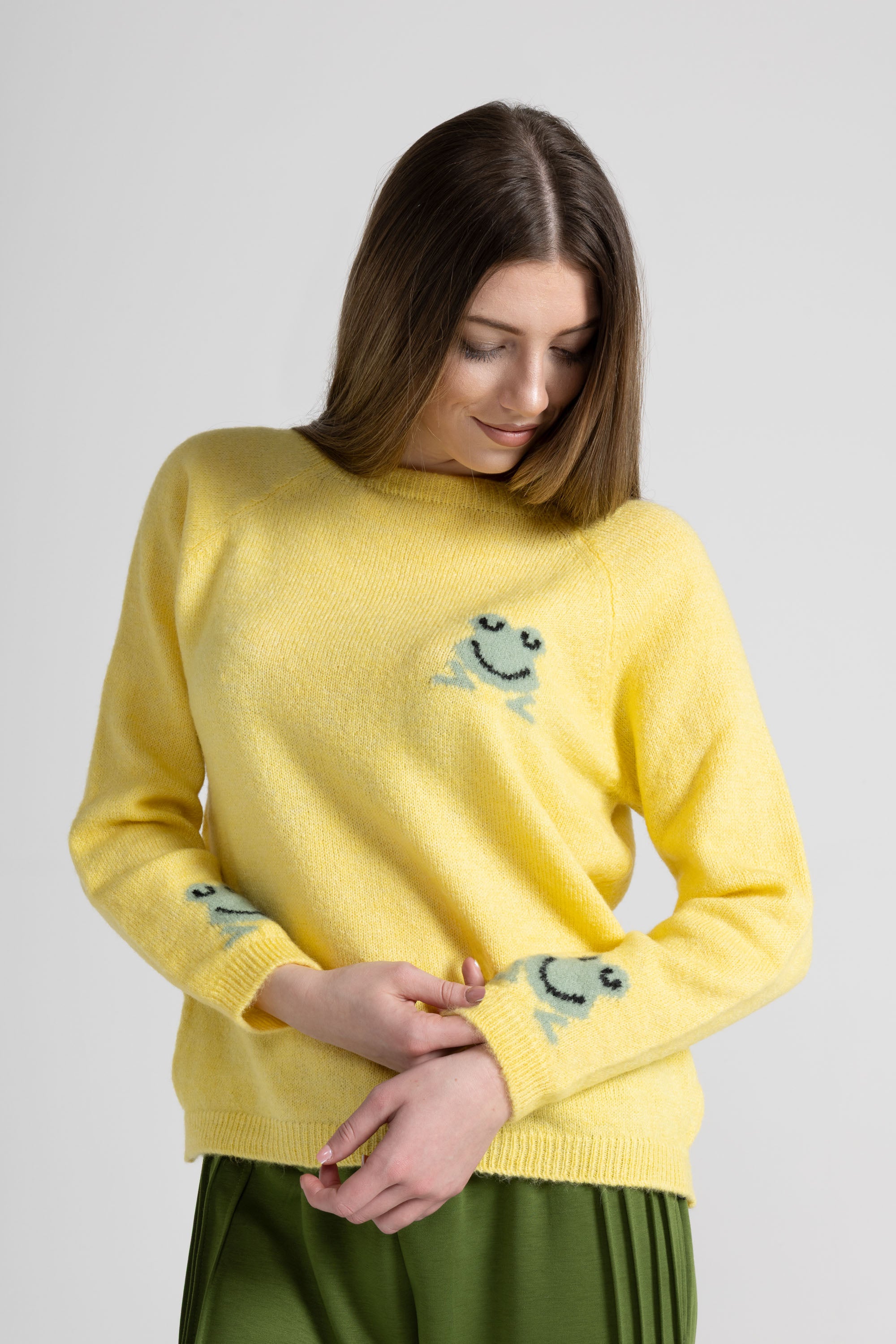 Maglione dal mood ironico in morbida maglina con simpatico ricamo coccinella: una sul davanti e dettagli coordinati sulle maniche, per un tocco giocoso ma raffinato. La linea è dritta e comoda, con girocollo e finiture a costine su fondo e polsi che mantengono la forma e valorizzano la vestibilità.