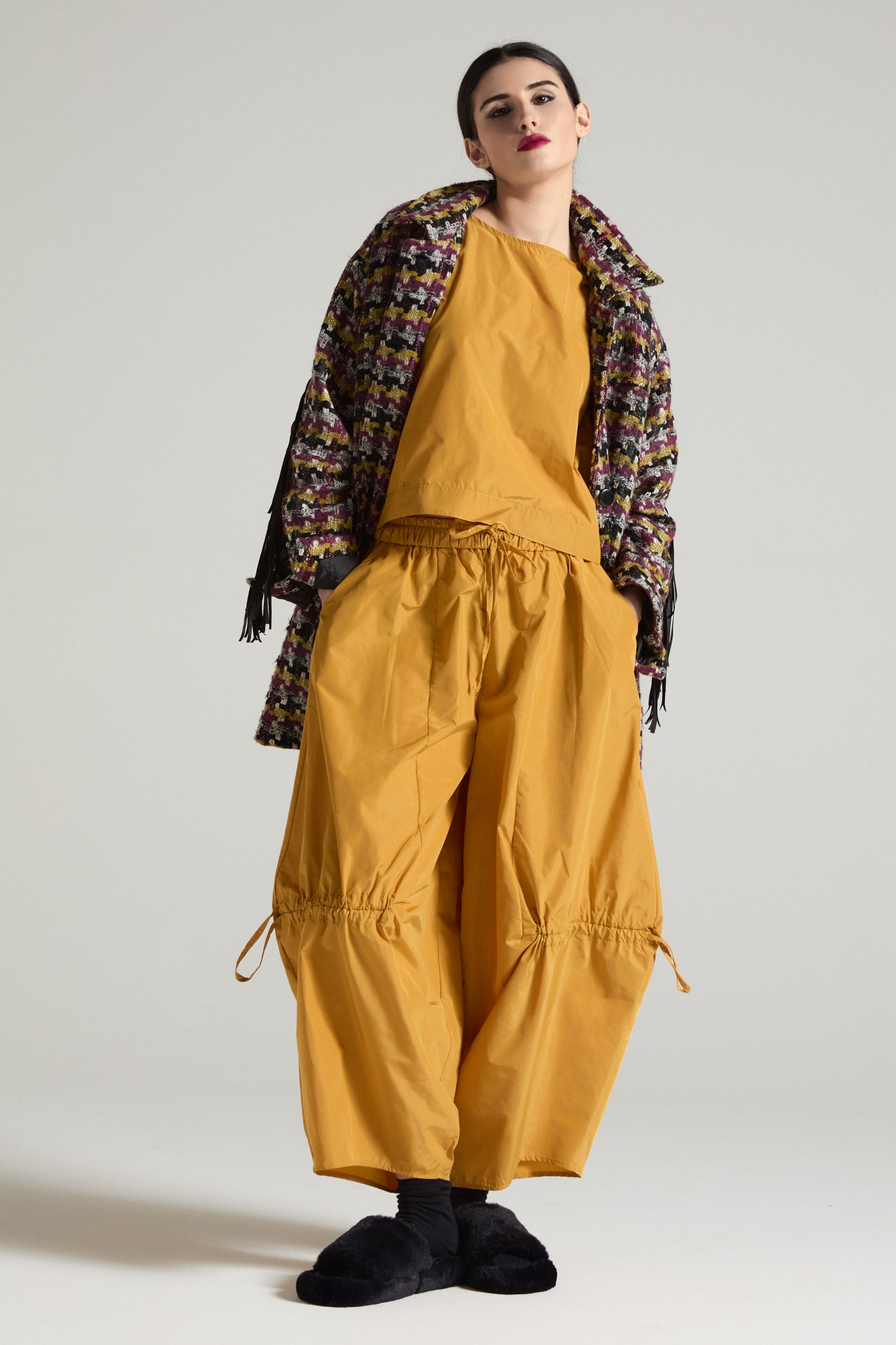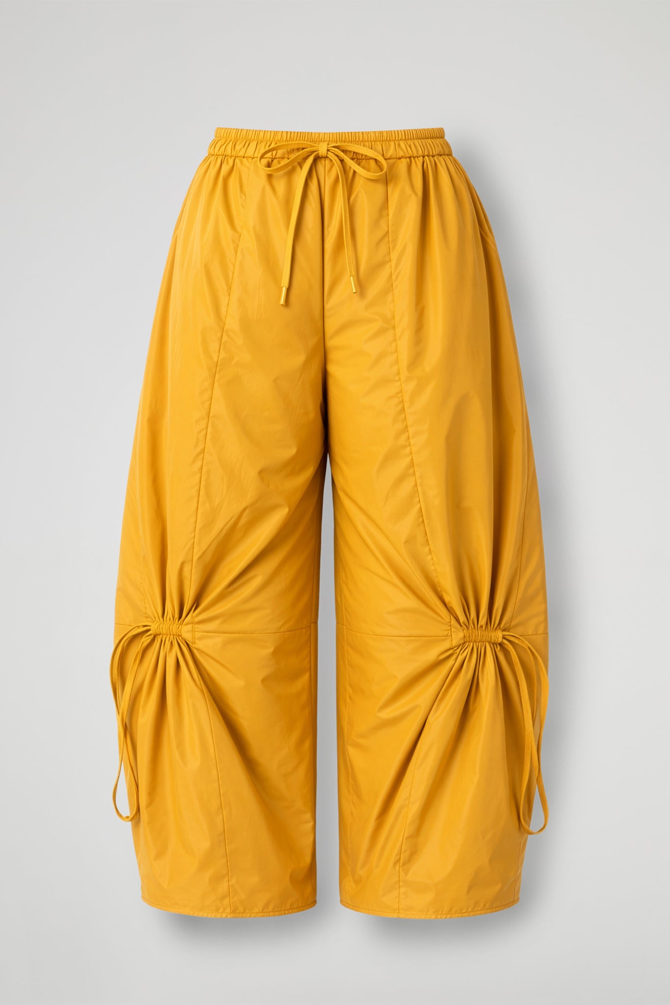 Pantaloni baggy realizzati in tessuto tecnico effetto nacré, dalla finitura luminosa che dona subito un twist moderno al look. La silhouette è ampia e fluida, con vita elasticizzata e coulisse per una vestibilità regolabile. Il dettaglio che fa la differenza sono i laccetti con arricciatura sulla parte bassa della gamba: puoi stringerli per creare volume e movimento, oppure lasciarli morbidi per un effetto più lineare.