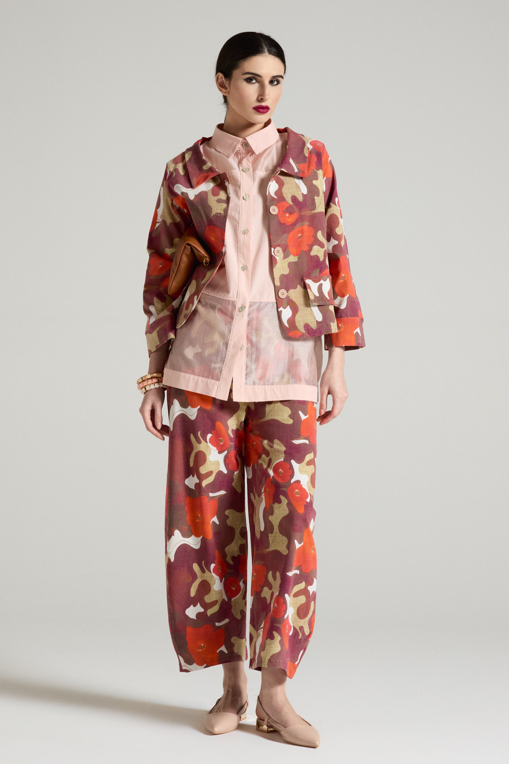Pantalone baggy dalla stampa camo-floreale e dal tessuto leggero piacevole da indossare, fascia elastica in vita , gamba morbida e ampia che valorizza la silhouette con un effetto rilassato ma curato.