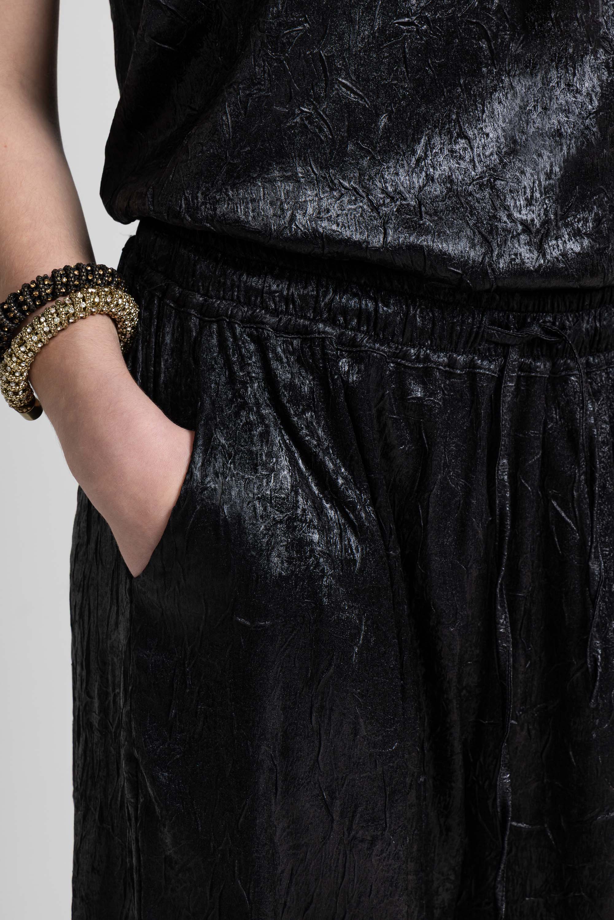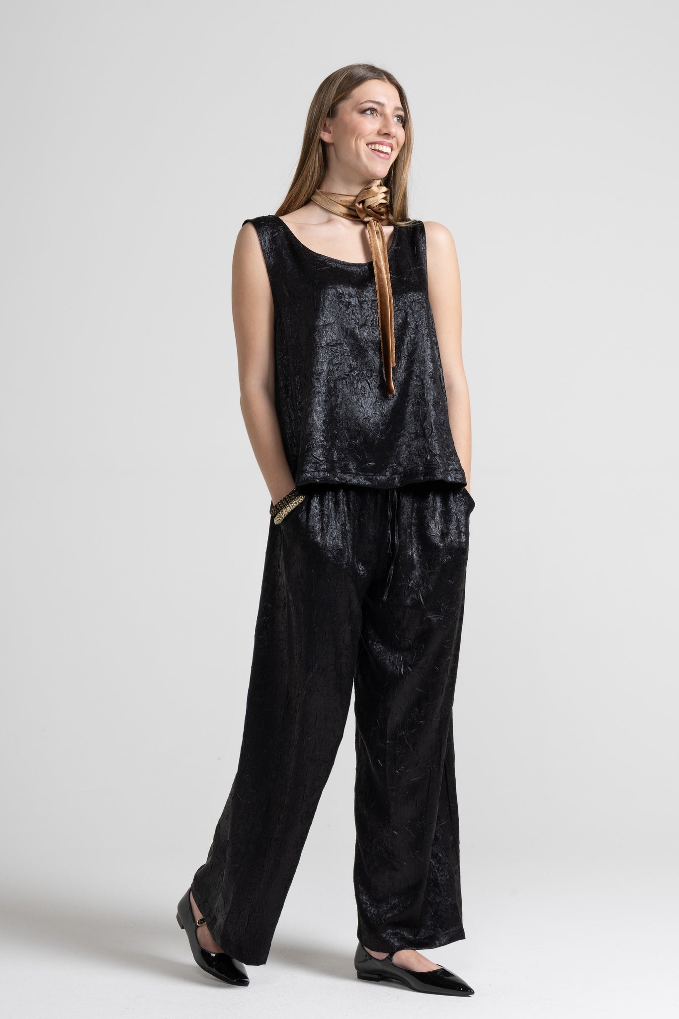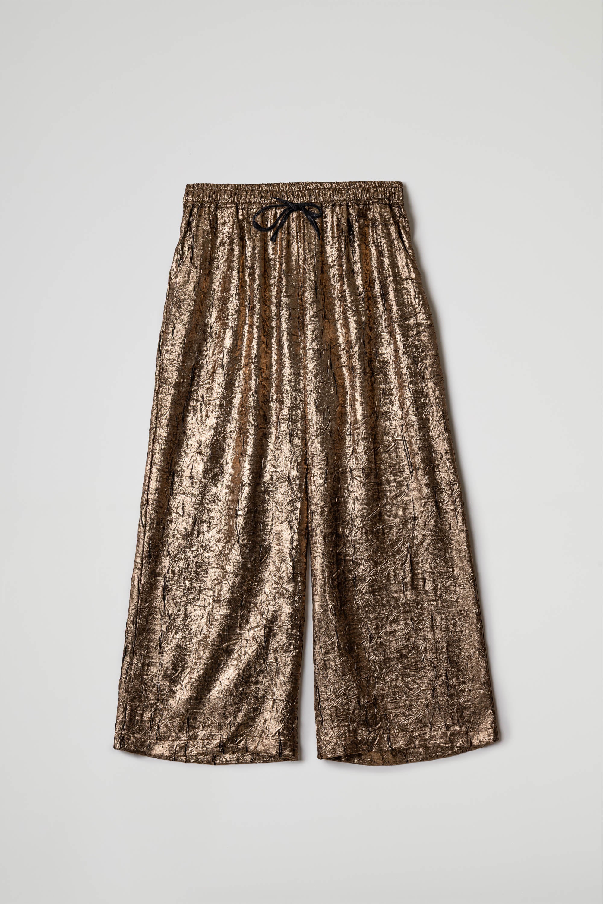 Pantalone realizzato in tessuto spalmato leggero, caratterizzato da una finitura metallizzata  che conferisce al capo un aspetto luminoso e contemporaneo. La superficie presenta un marcato effetto stropicciato, che aggiunge profondità e movimento alla texture; un capo dallo stile deciso e ricercato, ideale per look serali o outfit casual chic dall’effetto brillante.