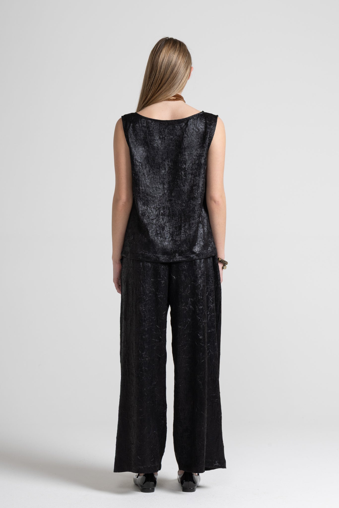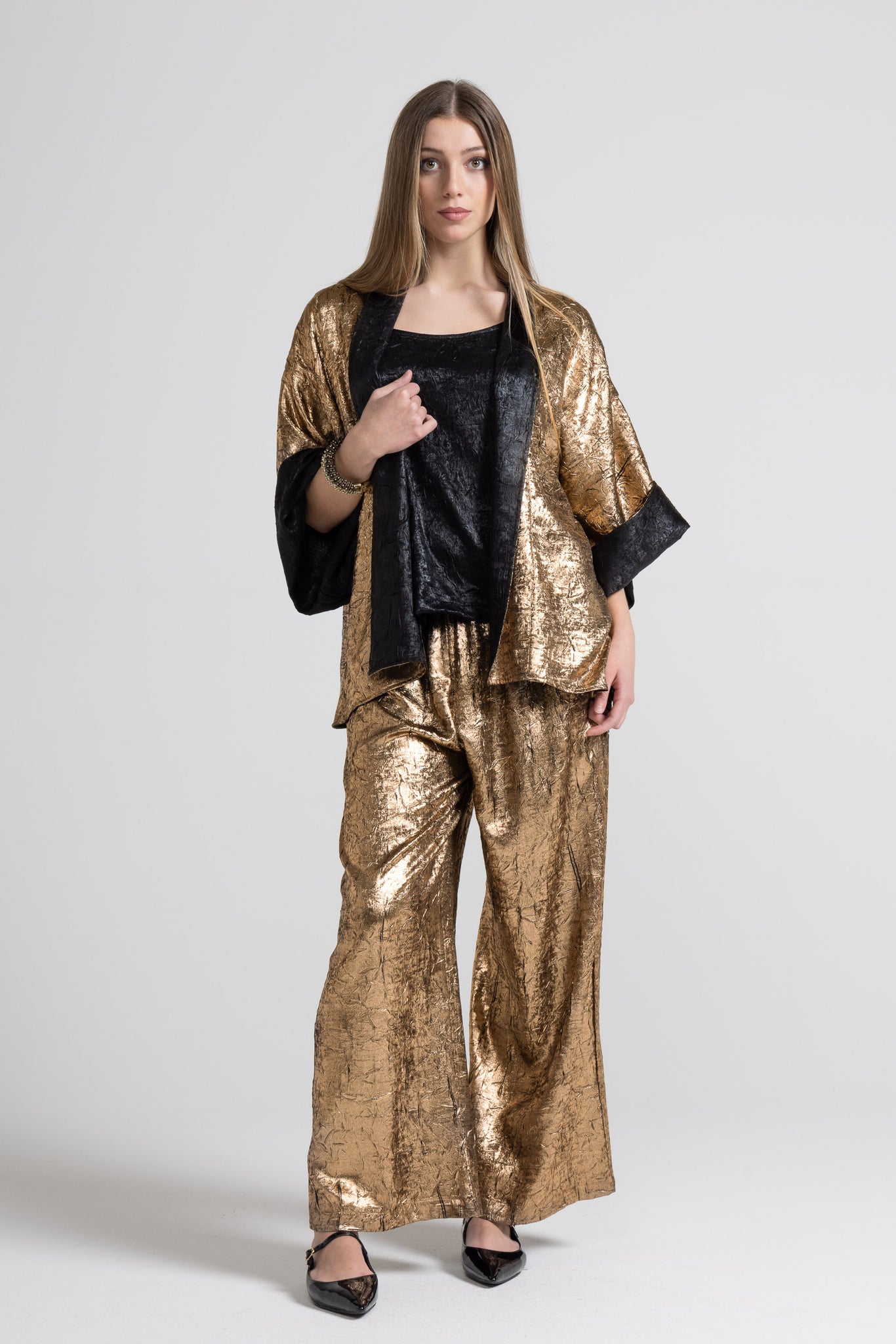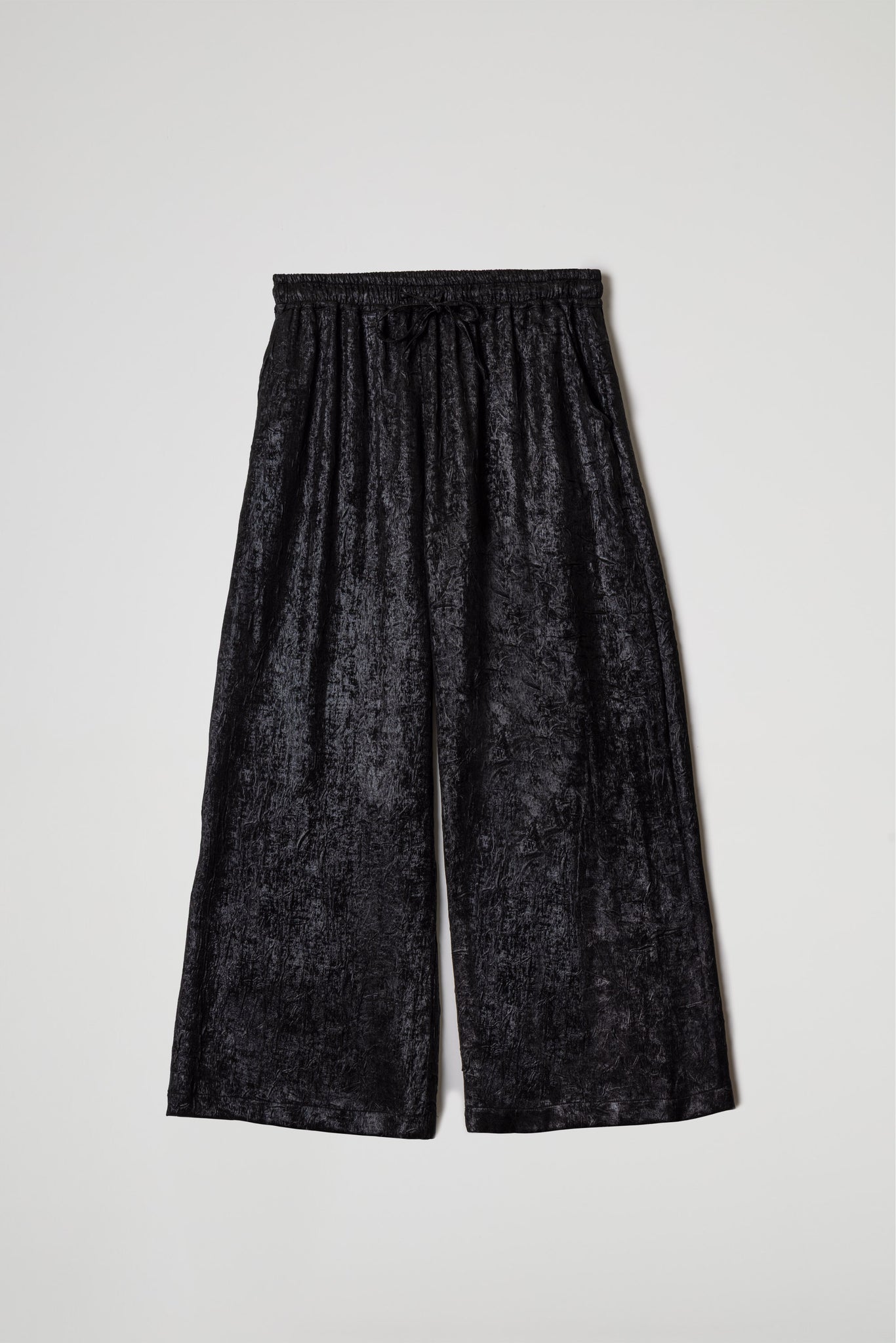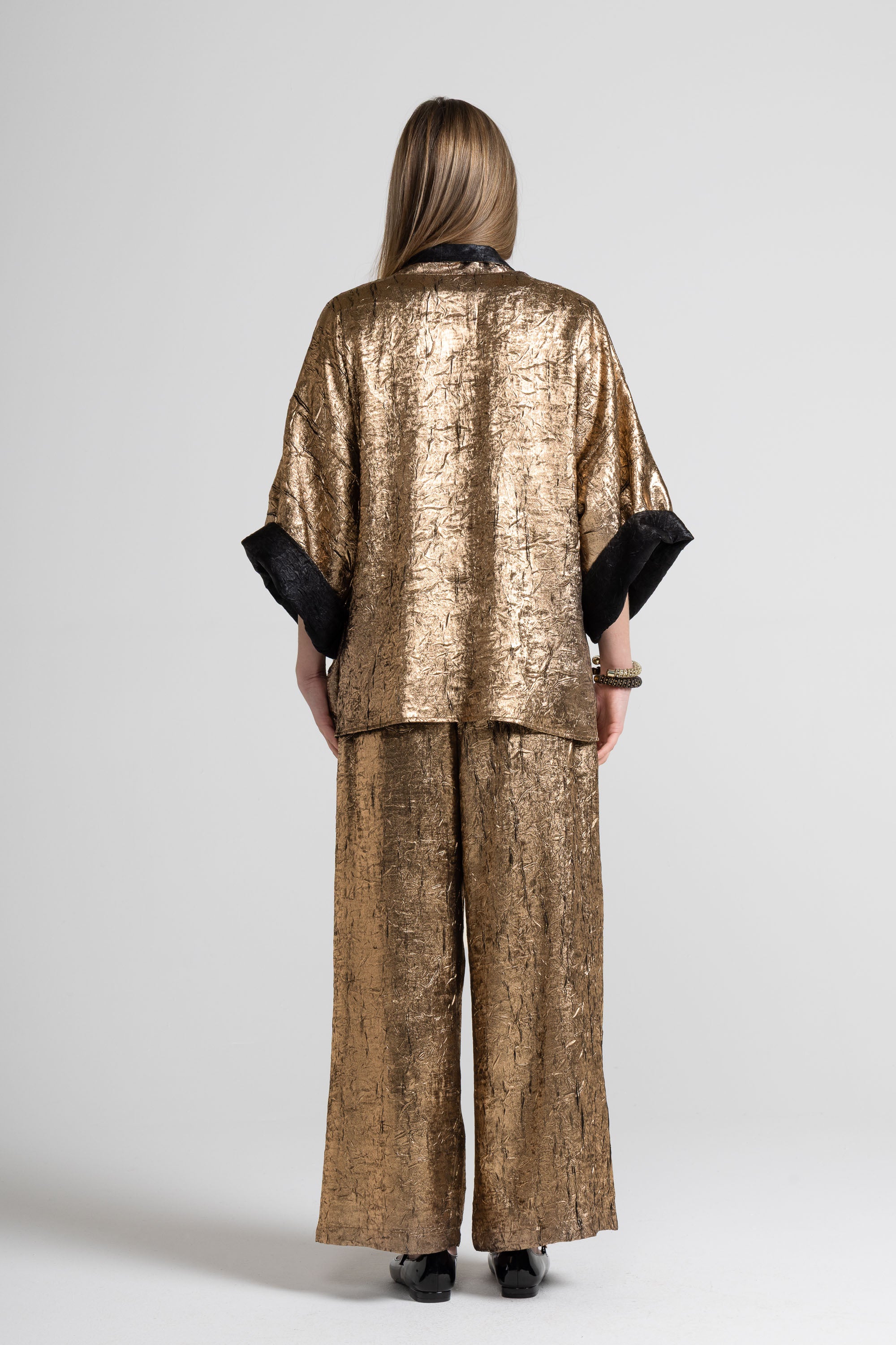 Pantalone realizzato in tessuto spalmato leggero, caratterizzato da una finitura metallizzata  che conferisce al capo un aspetto luminoso e contemporaneo. La superficie presenta un marcato effetto stropicciato, che aggiunge profondità e movimento alla texture; un capo dallo stile deciso e ricercato, ideale per look serali o outfit casual chic dall’effetto brillante.