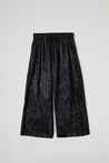 Pantalone ampio, vita elastica con coulisse regolabile, tasche alla francese, gamba dritta, orlo ribattuto alto sul fondo. Linea morbida
