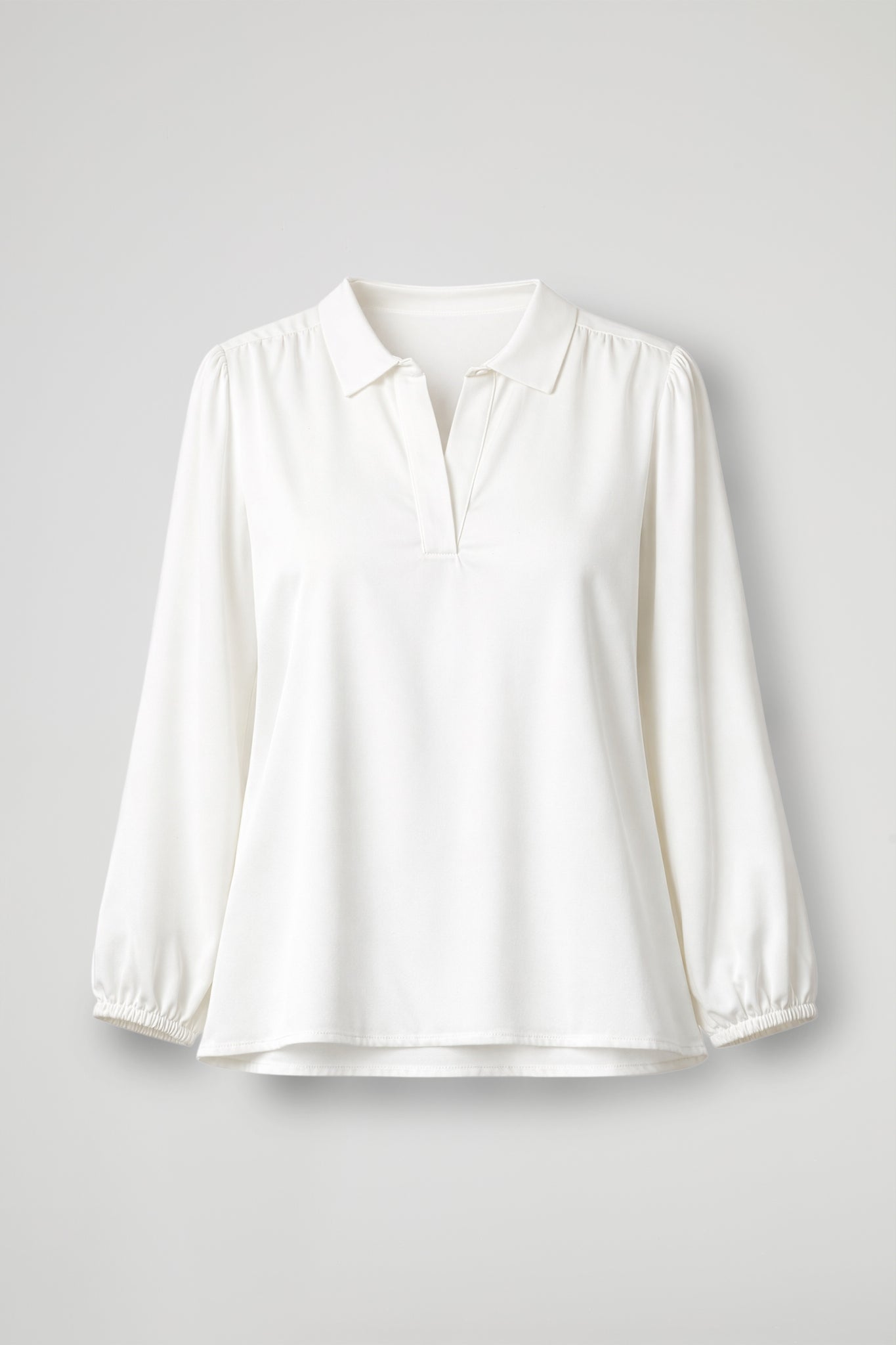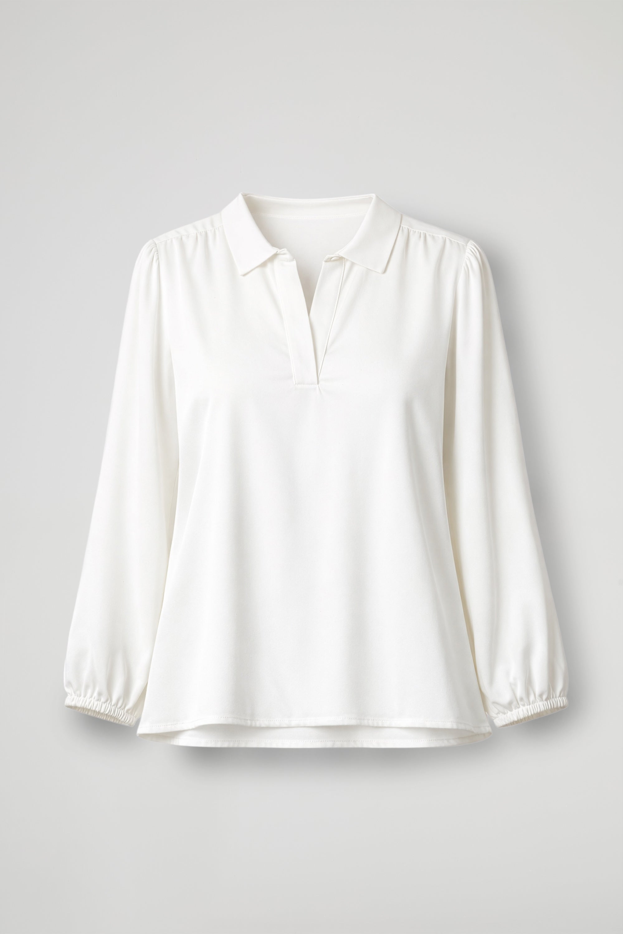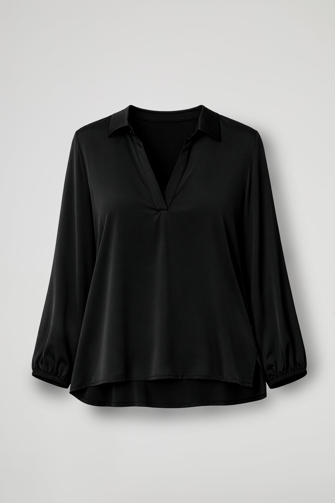 Blusa in raso, elegante e luminosa, è il passe-partout perfetto per i look da giorno e da sera.  il tessuto scivola sul corpo con una caduta fluida, mentre il collo a camicia e lo scollo a V donano un tocco raffinato e slanciano la figura. Le maniche lunghe con polsino elastico arricciato aggiungono femminilità e comfort, valorizzando il capo con un dettaglio delicato.