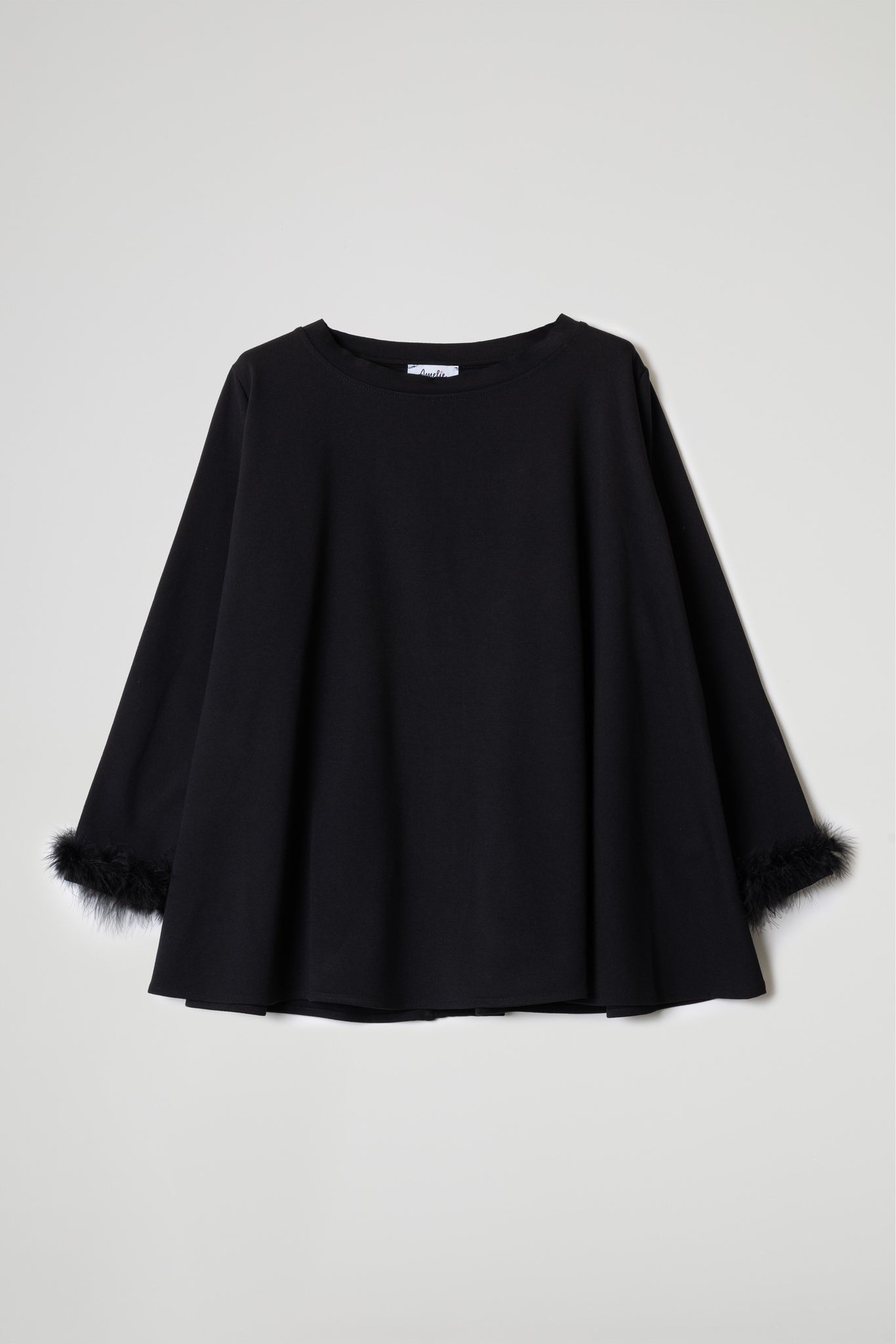 Top in tessuto punto Milano di viscosa, ampio girocollo ribattuto, linea a trapezio leggermente asimmetrico, manica lunga arricchite da un dettaglio in piuma sul fondo.