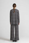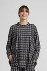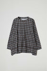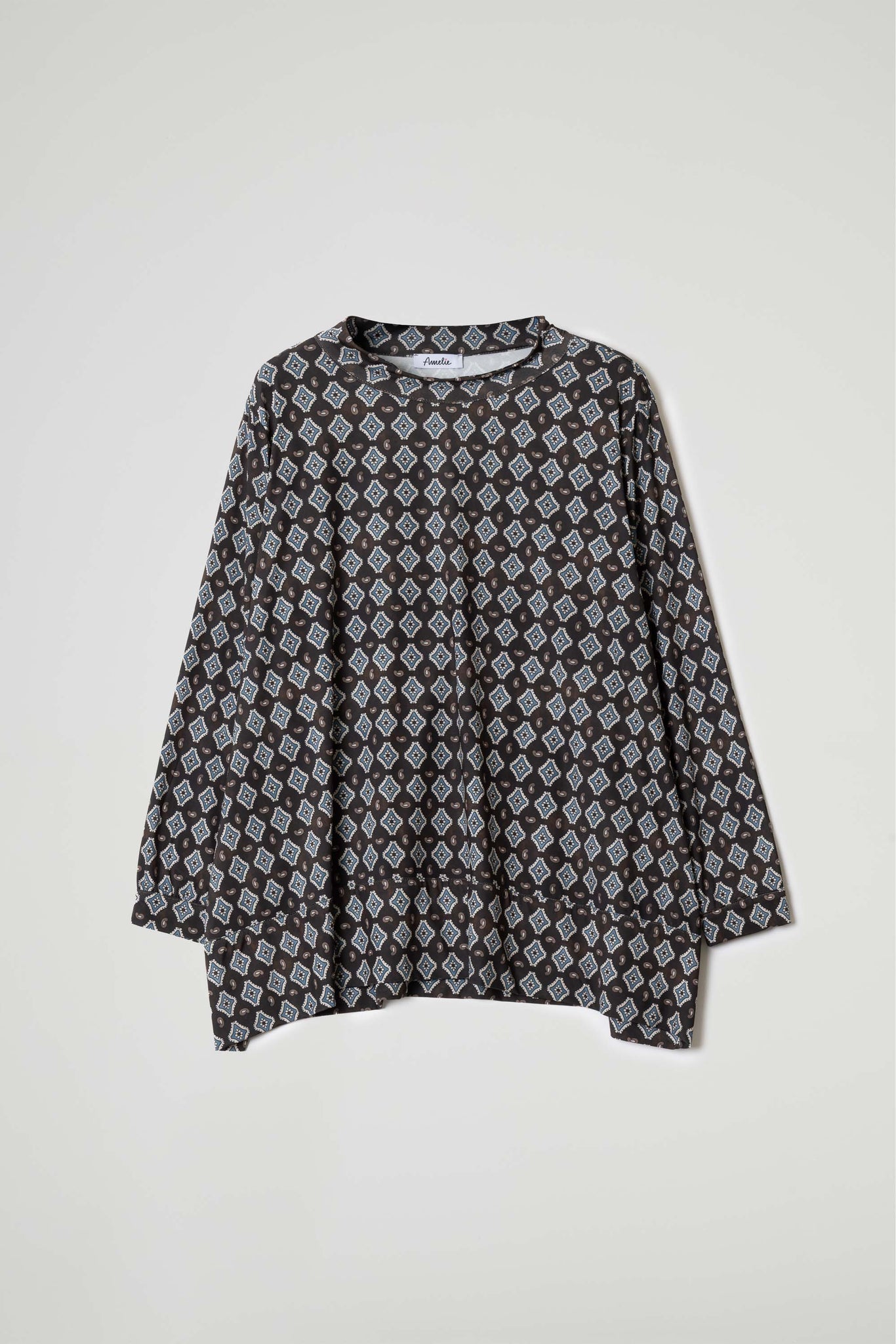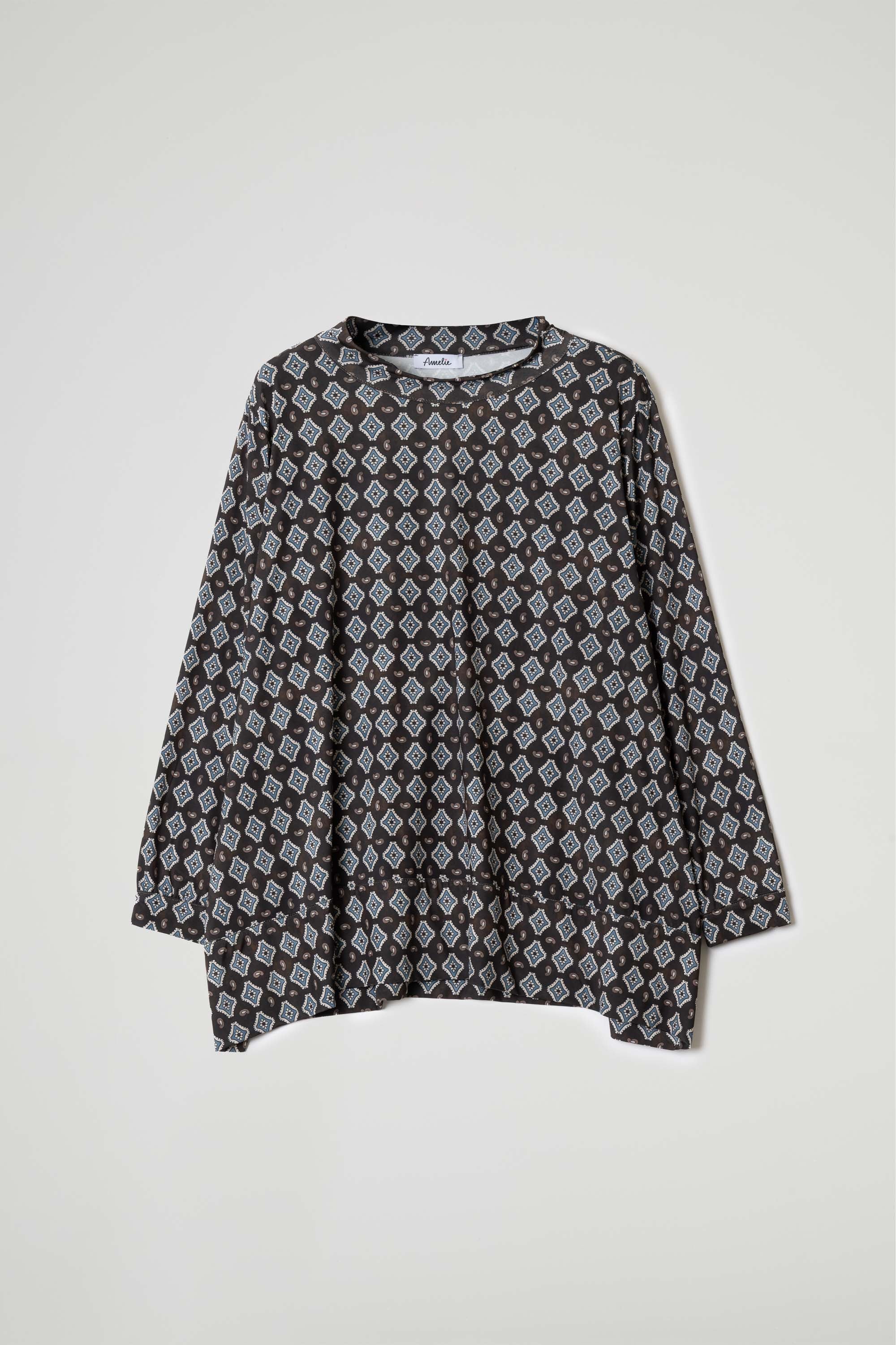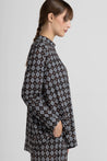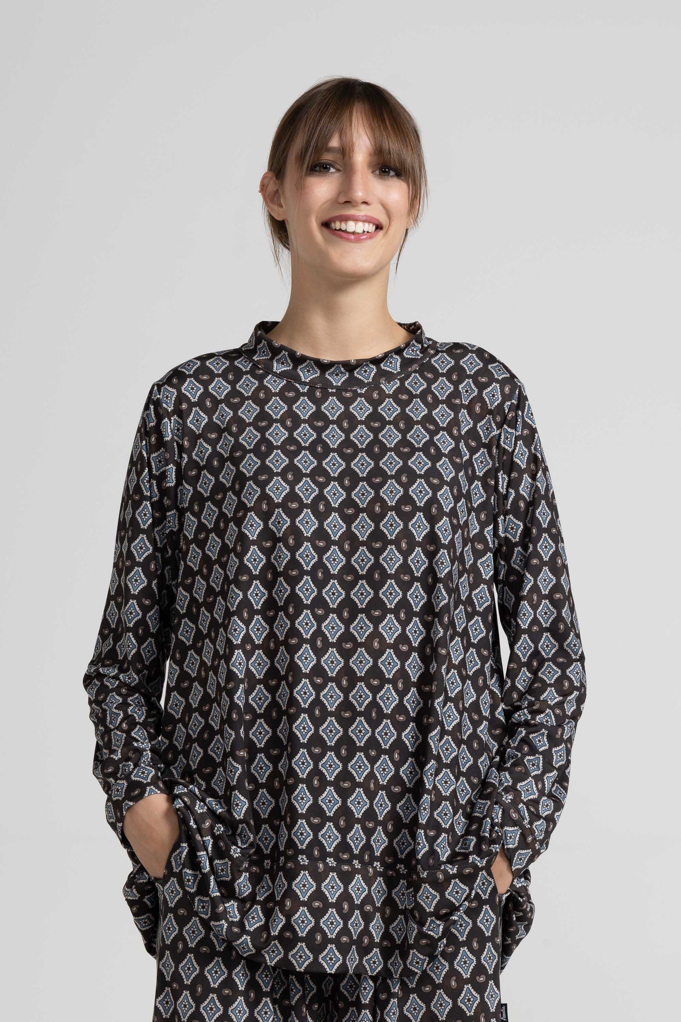 Top over asimmetrico in tessuto tecnico, collo alla coreana, manica lunga leggermente a sbuffo, orlo ribattuto alto su polsi e fondo, fantasia geometrica su tutto il capo. Linea ampia e morbida.