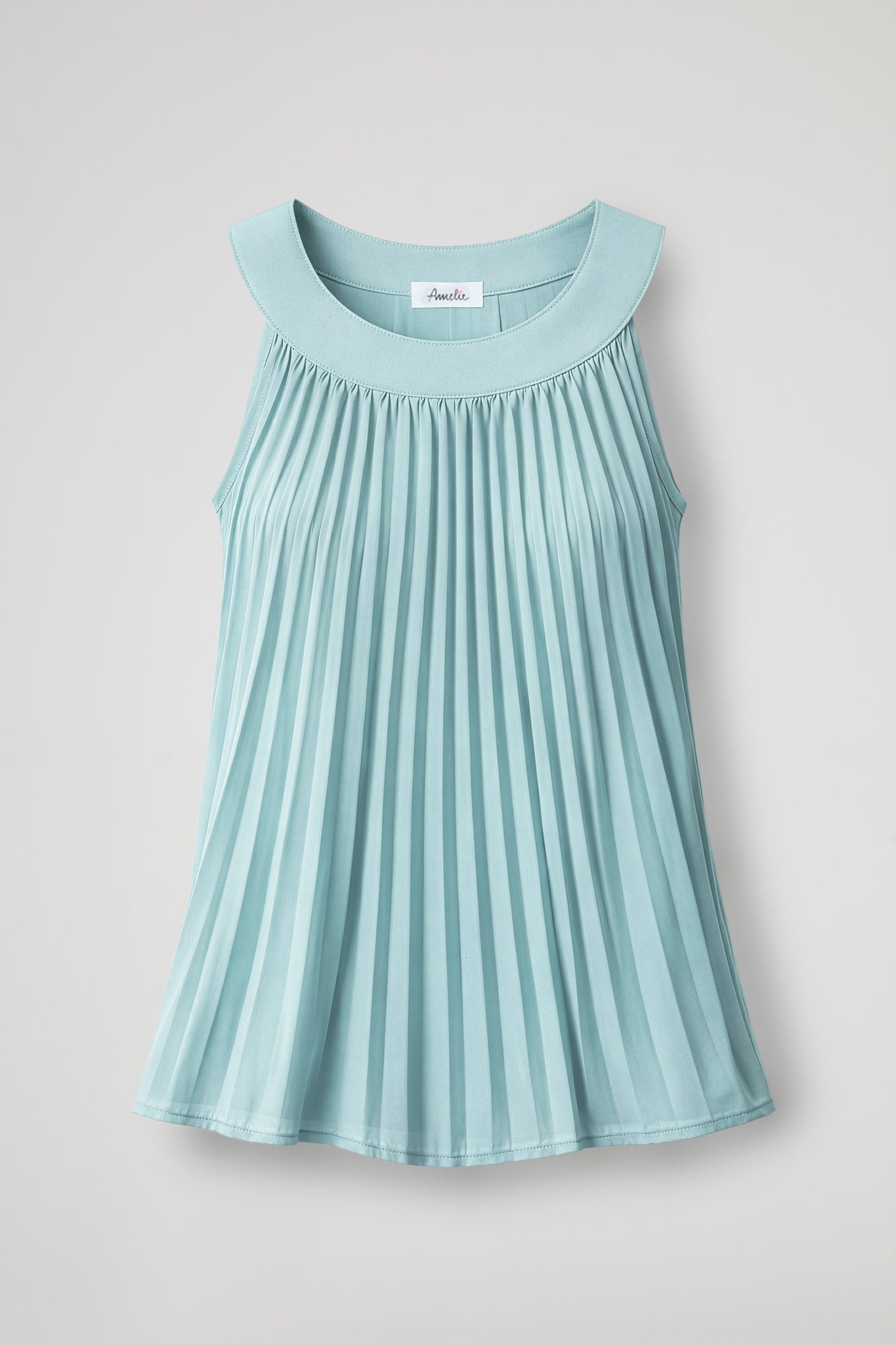 Top smanicato plissé dal design pulito e raffinato, con collo ampio e strutturato che incornicia le spalle e dona un tocco elegante. La linea è morbida e leggermente svasata, pensata per cadere fluida sul corpo e valorizzare il movimento delle pieghe.