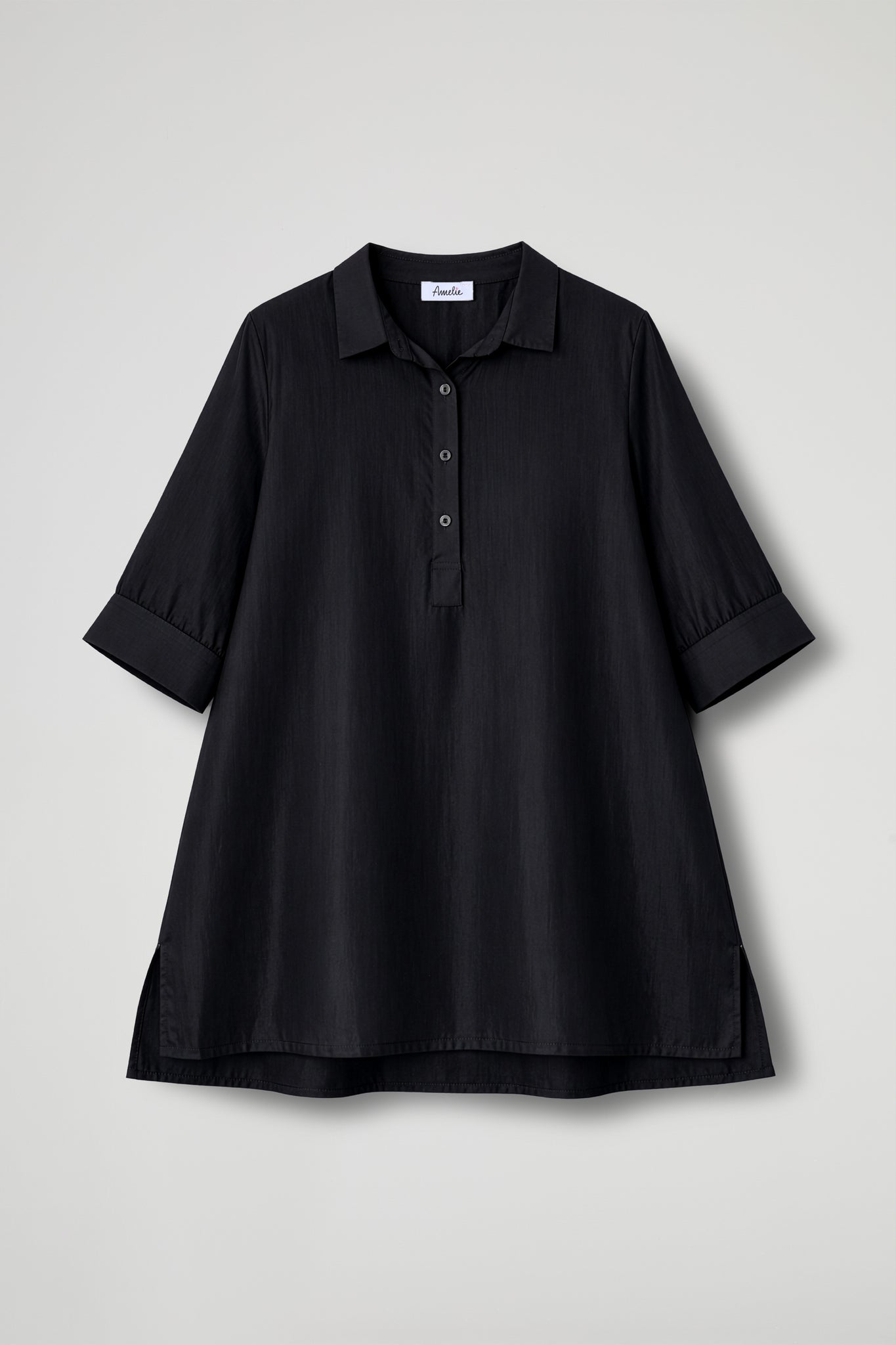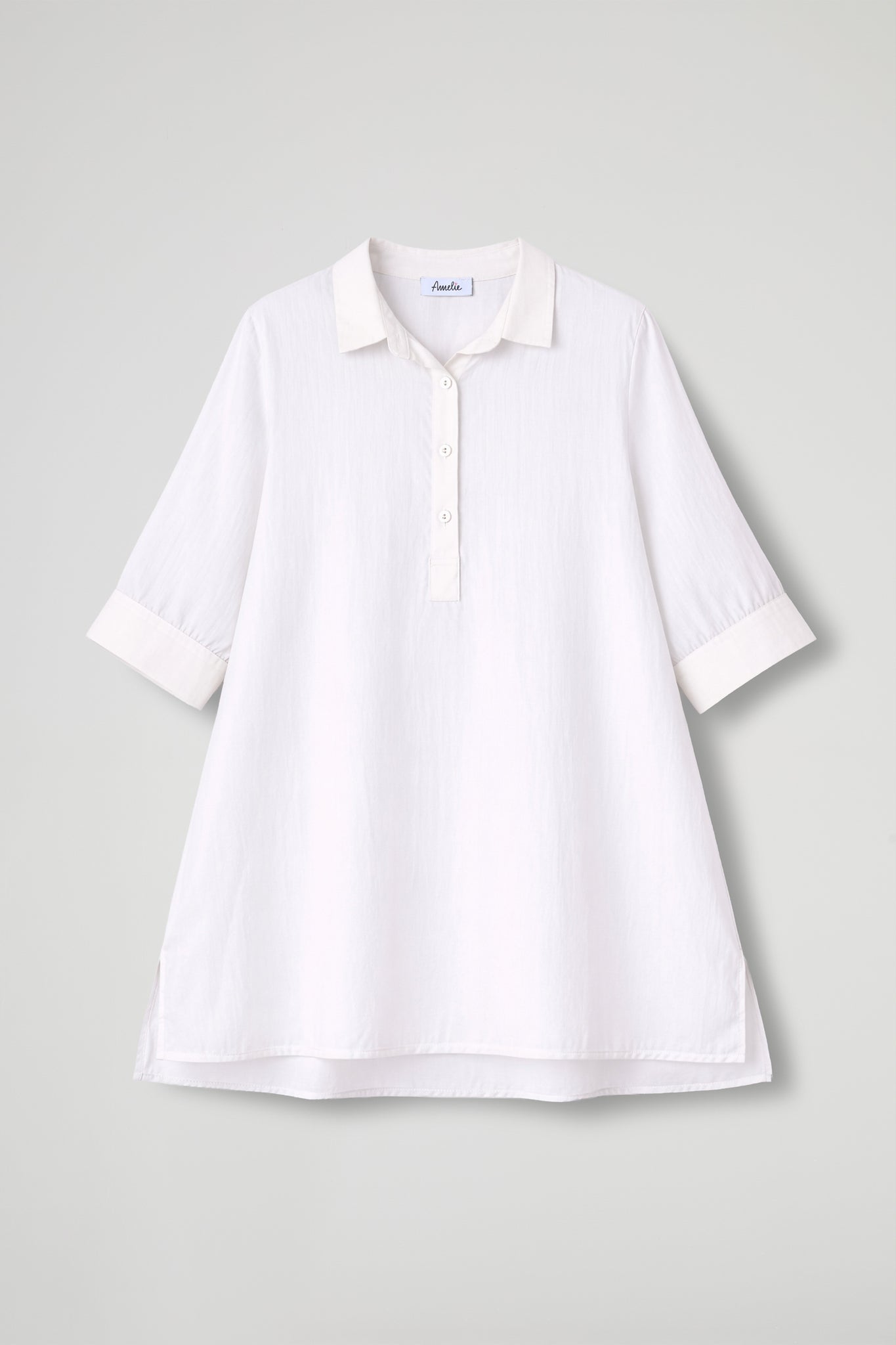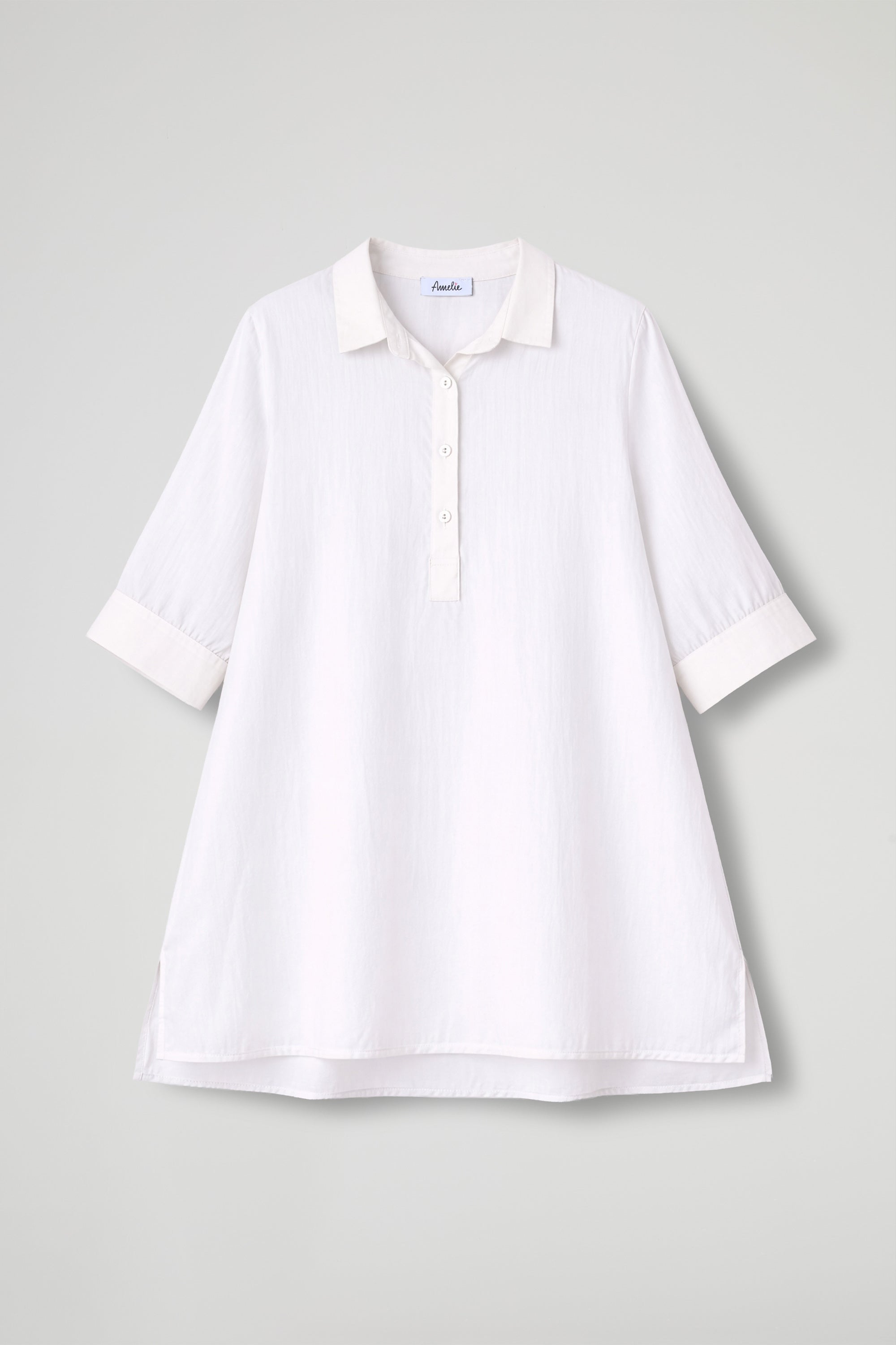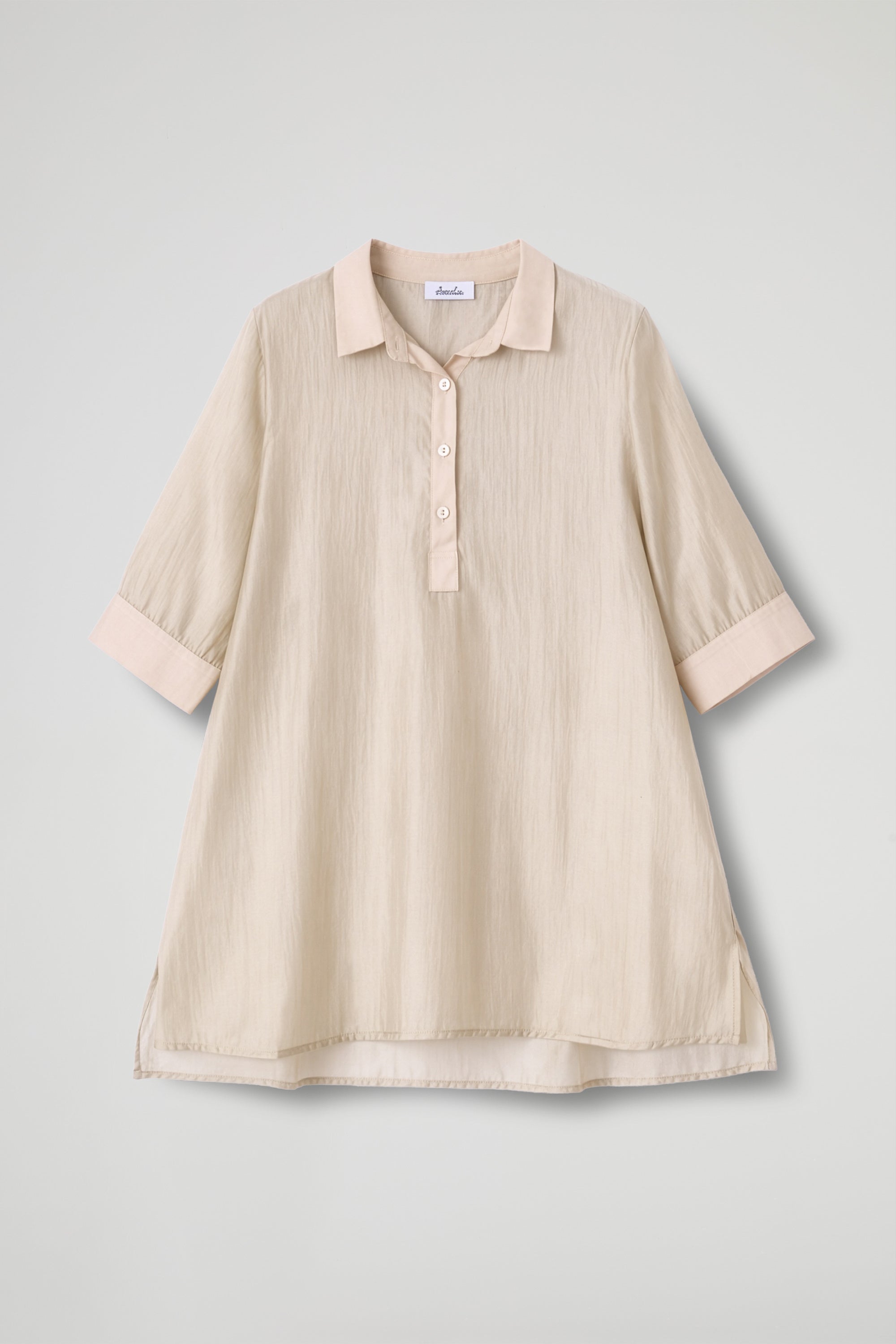 Camicia over dal gusto essenziale e raffinato, realizzata in tessuto leggero e semi-trasparente che dona luminosità e un effetto super femminile. Il design pulito è valorizzato dal collo classico e dalla chiusura a polo con bottoni tono su tono, mentre le maniche a 3/4 con polsino rendono il capo pratico e versatile. Il fondo dritto e gli spacchetti laterali completano la linea morbida, perfetta da indossare sia dentro che fuori dai pantaloni.