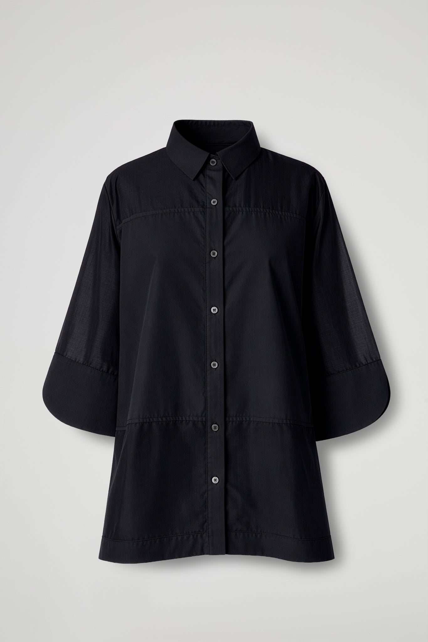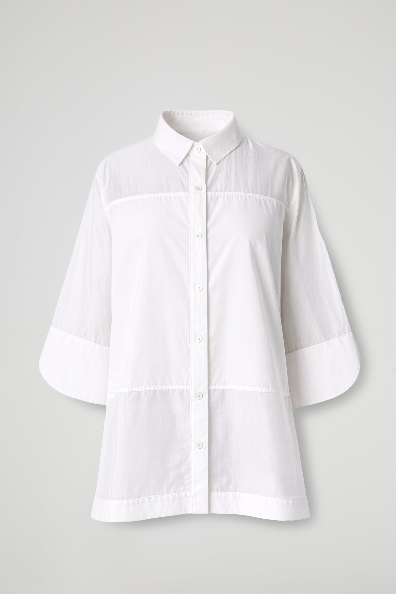 Camicia morbida in tessuto di cotone, colletto classico, manica 3/4 ampie con maxi polsino con taglio a petalo e orlo rifinito, chiusura frontale con bottoni, dettaglio pannelli trasparenti orizzontali, orlo ribattuto su fondo. linea dritta e vestibilità morbida.