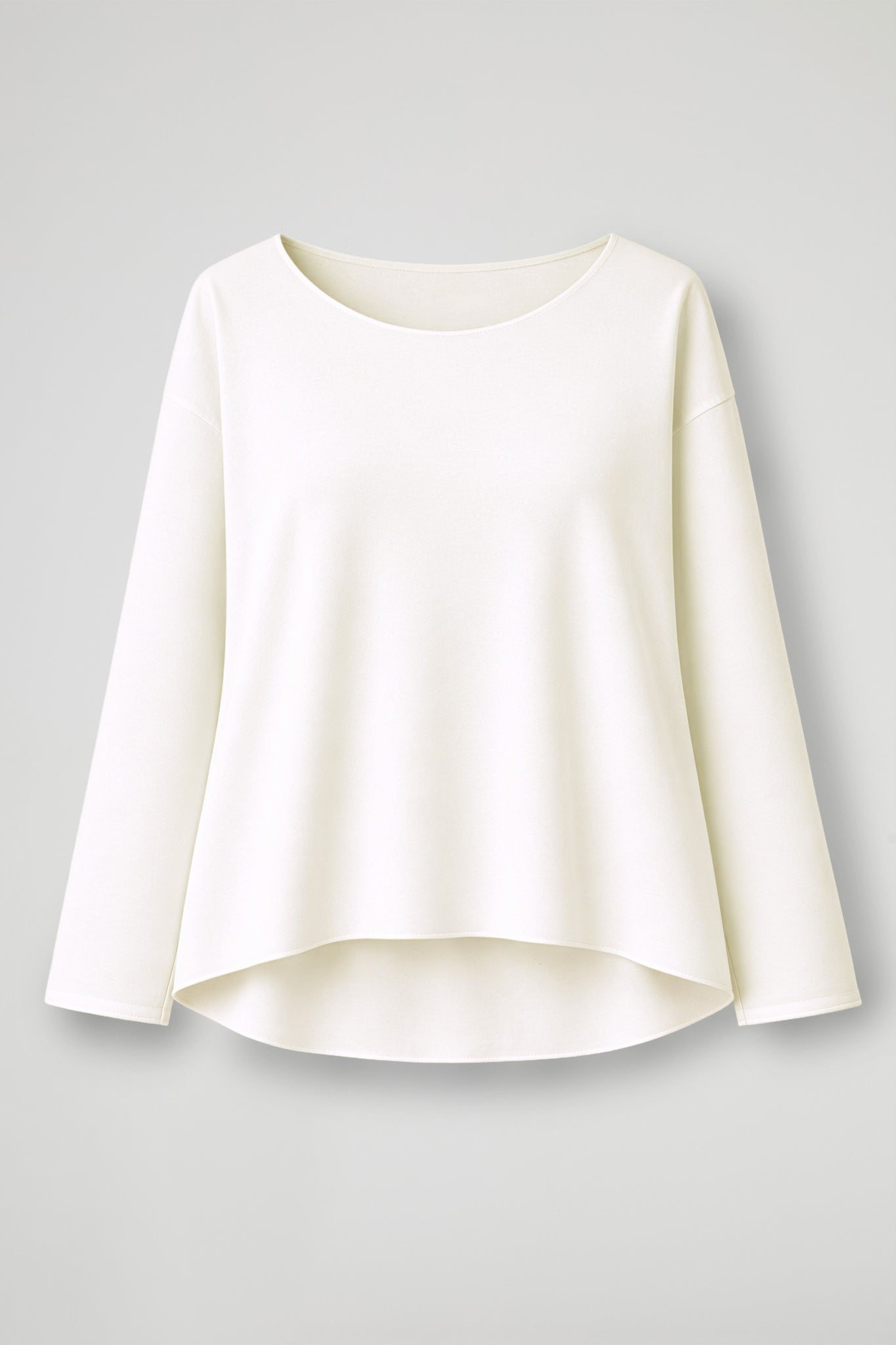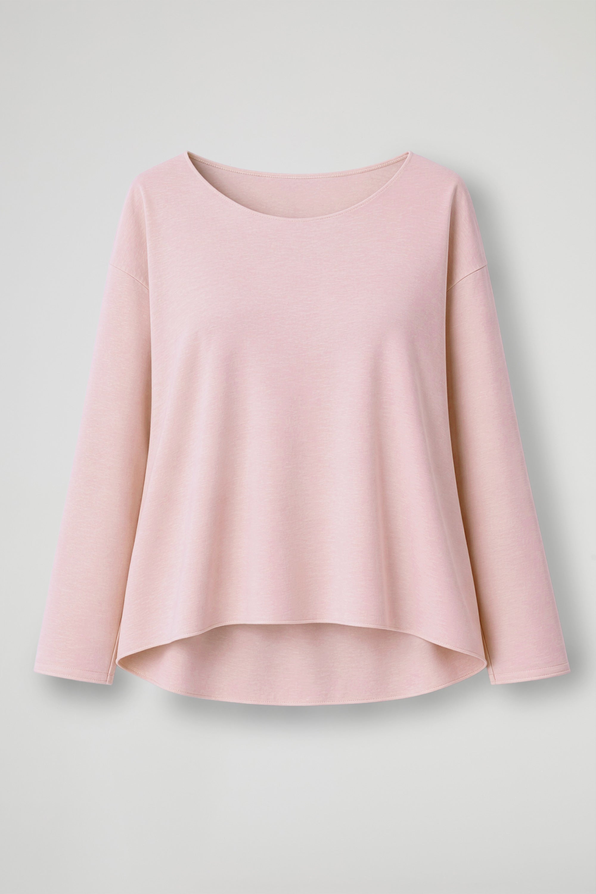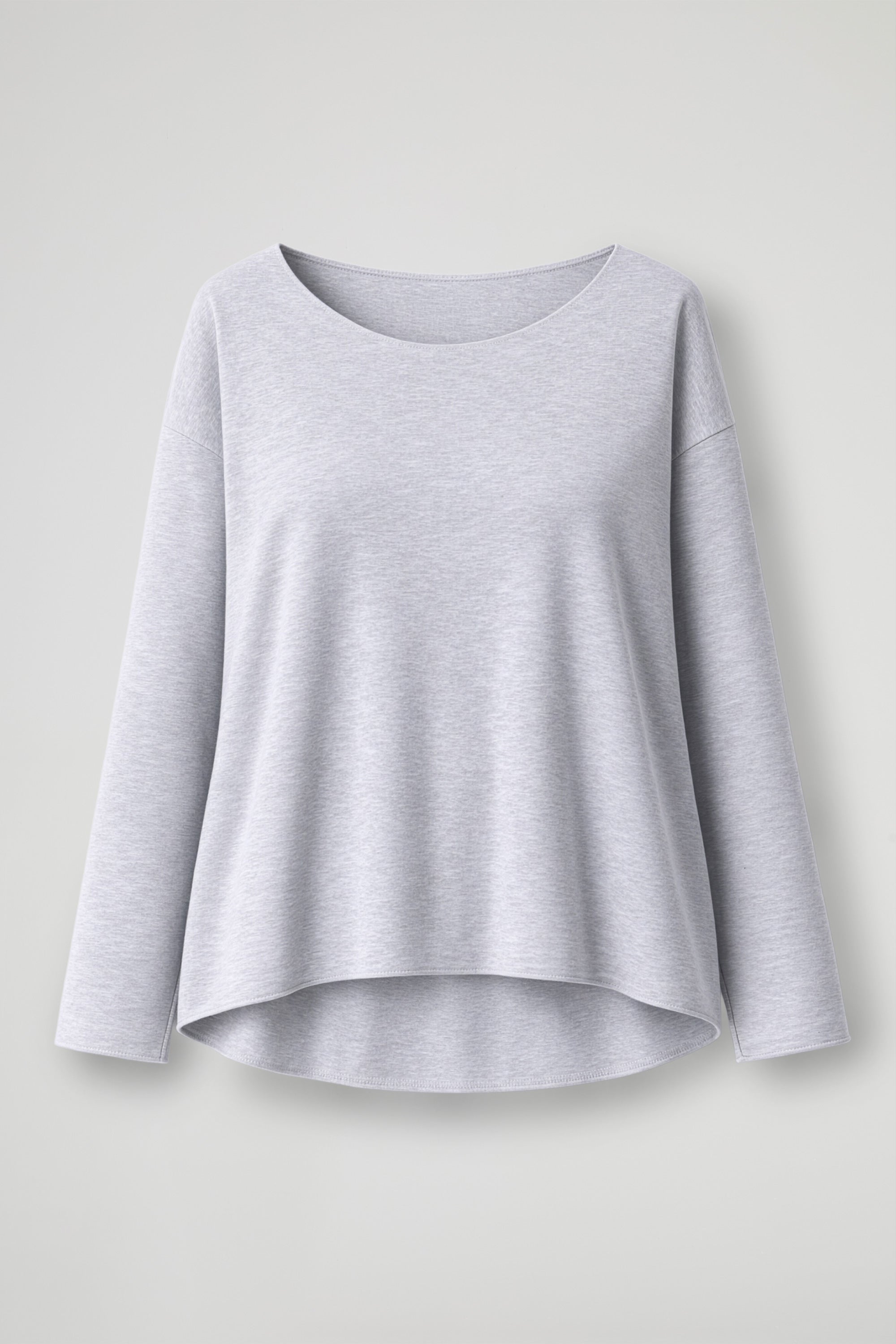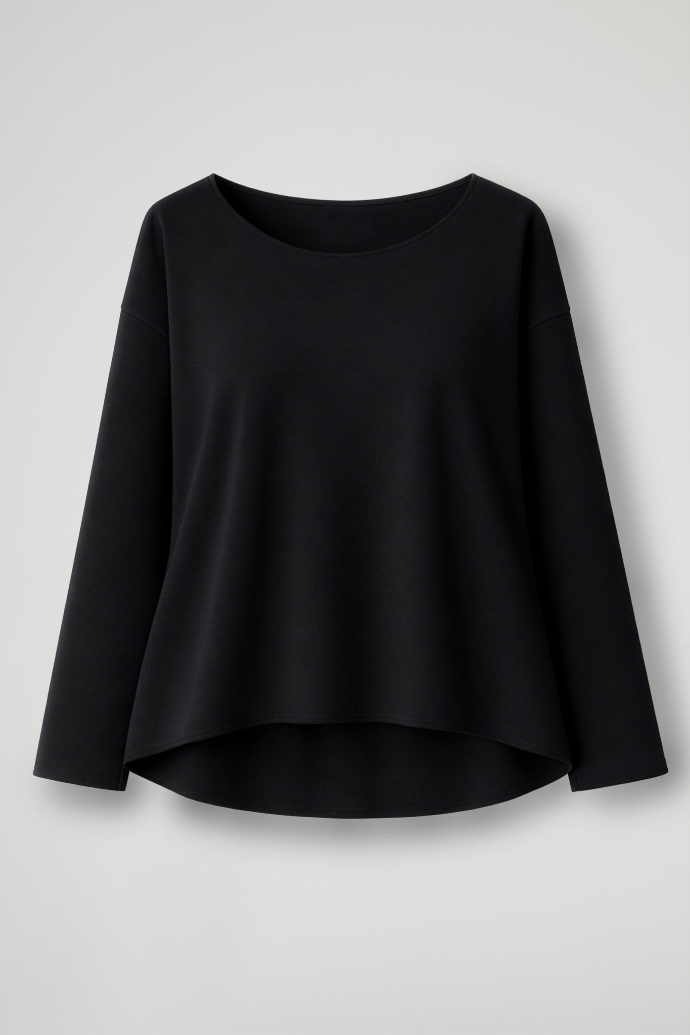 Maglia asimmetrica in tessuto di viscosa, collo ampio , spalle leggermente scese manica lunga, taglio stondato sul fondo. Linea morbida