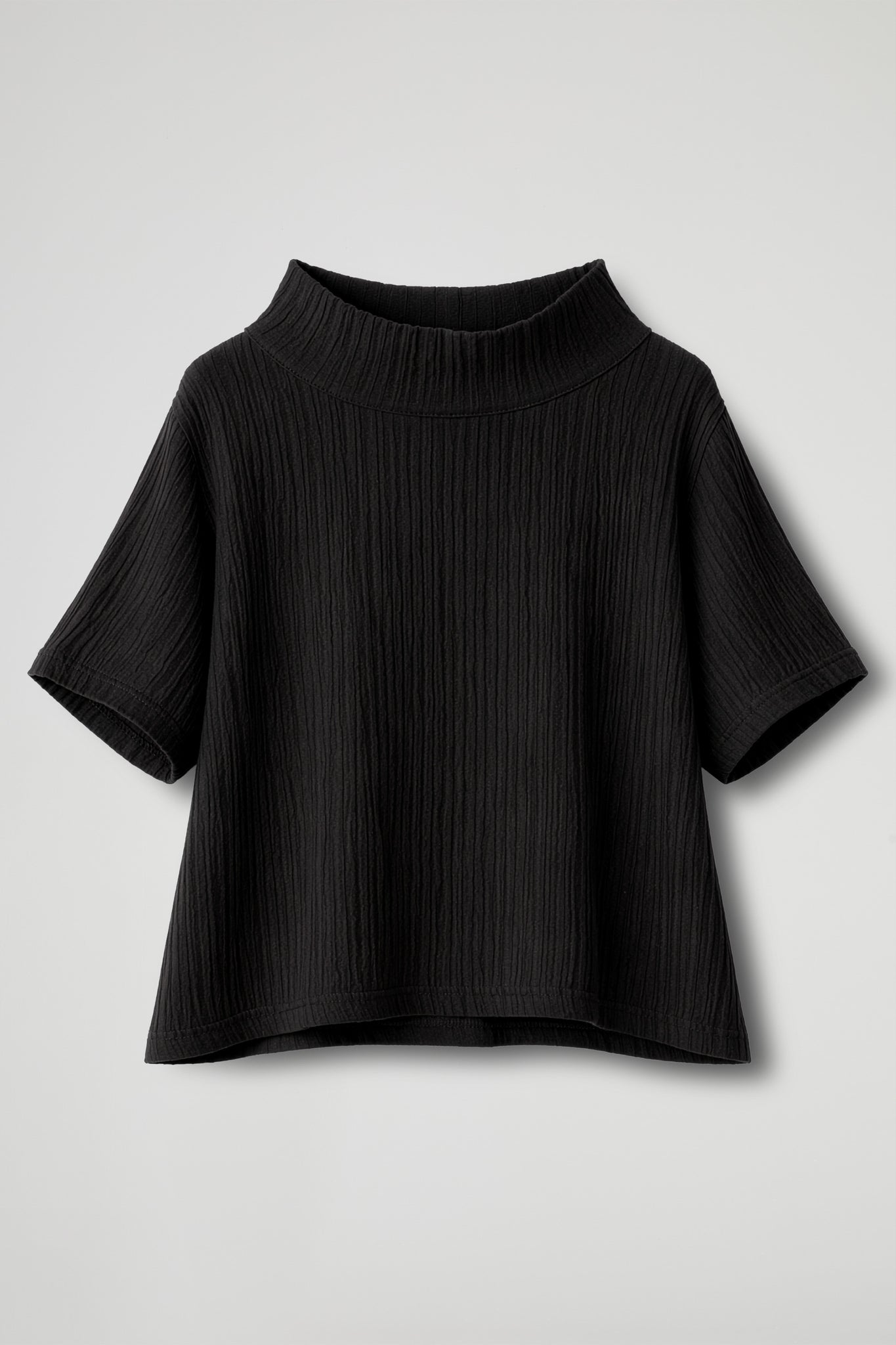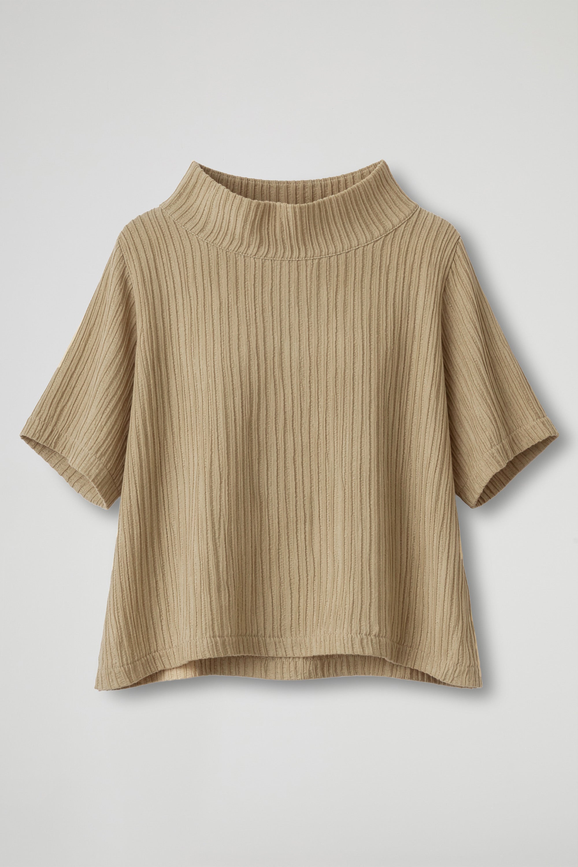 Top taglio boxy leggermente asimmetrica realizzato in tessuto goffrato, collo ad anello in piedi, manica corta con orlo ribattuto, dettaglio a costine su tutto il capo, orlo ribattuto sul fondo. Linea ampia