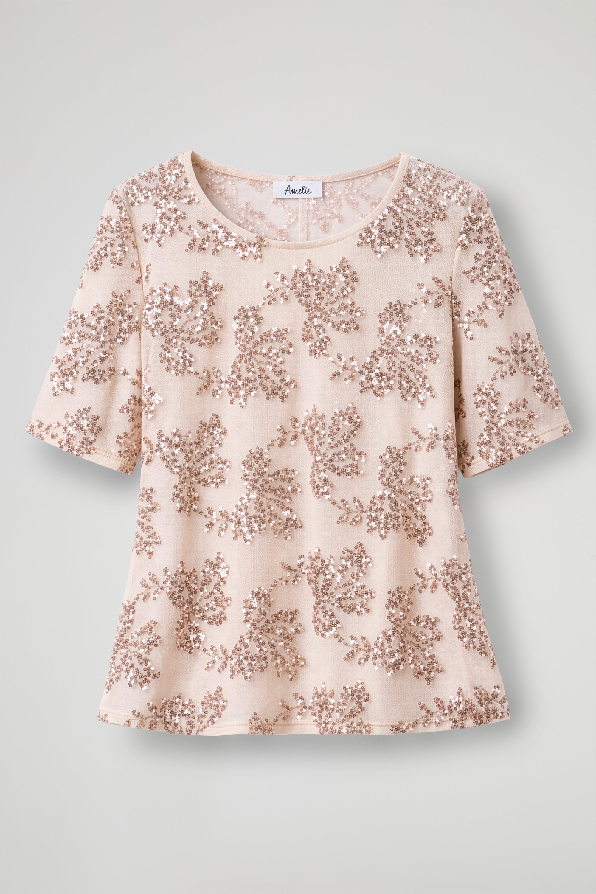 Top elegante dal design luminoso e raffinato, realizzato in tessuto leggero impreziosito da ricami in paillettes con motivo floreale all-over; Il modello presenta una linea morbida e leggermente boxy, con maniche corte e girocollo, per una vestibilità confortevole e contemporanea. La lavorazione ricercata dona brillantezza e rende il capo ideale per occasioni speciali o per creare outfit sofisticati .