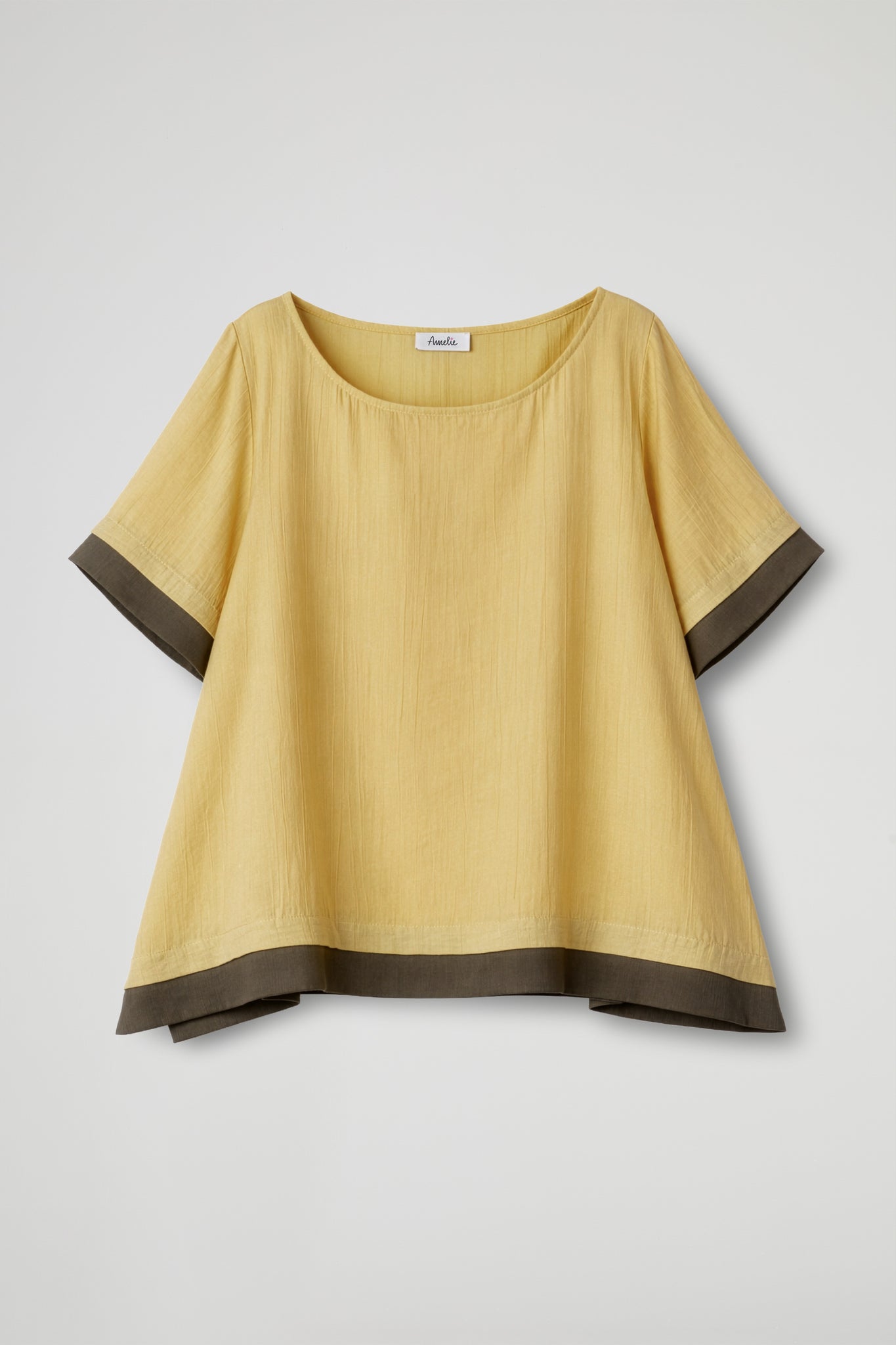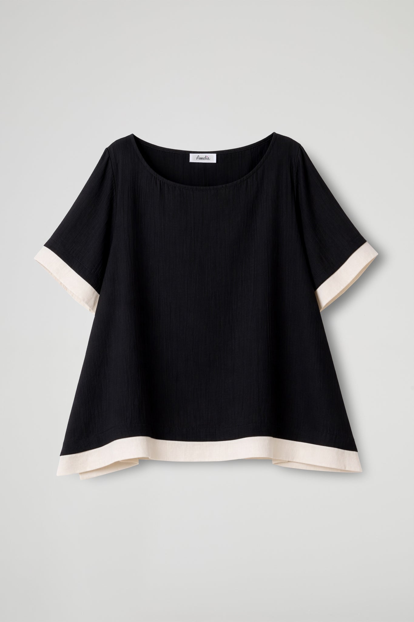 Maglia taglio a trapezio, collo ampio e stondato, manica corta con dettaglio fascia a contrasto colore, dettaglio fascia a contrasto sul fondo. Linea ampia.